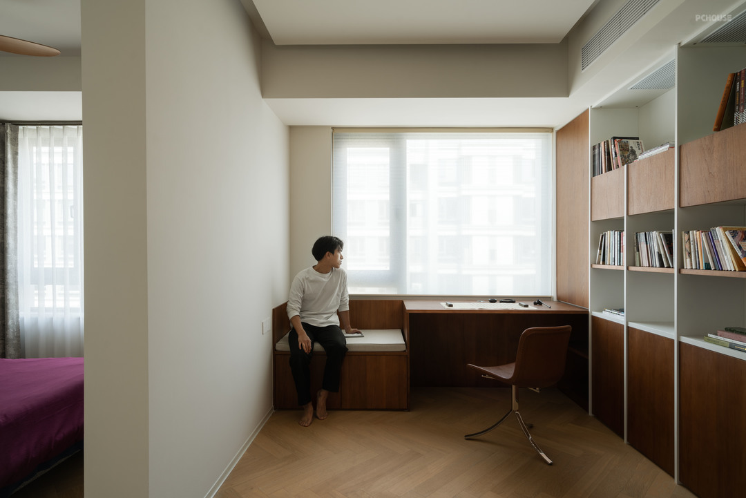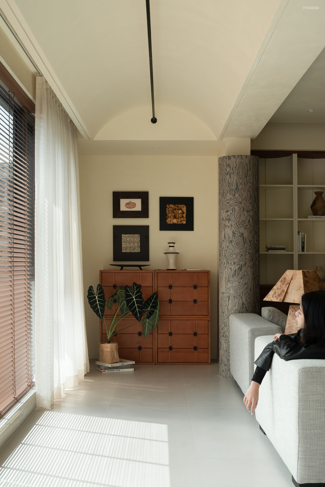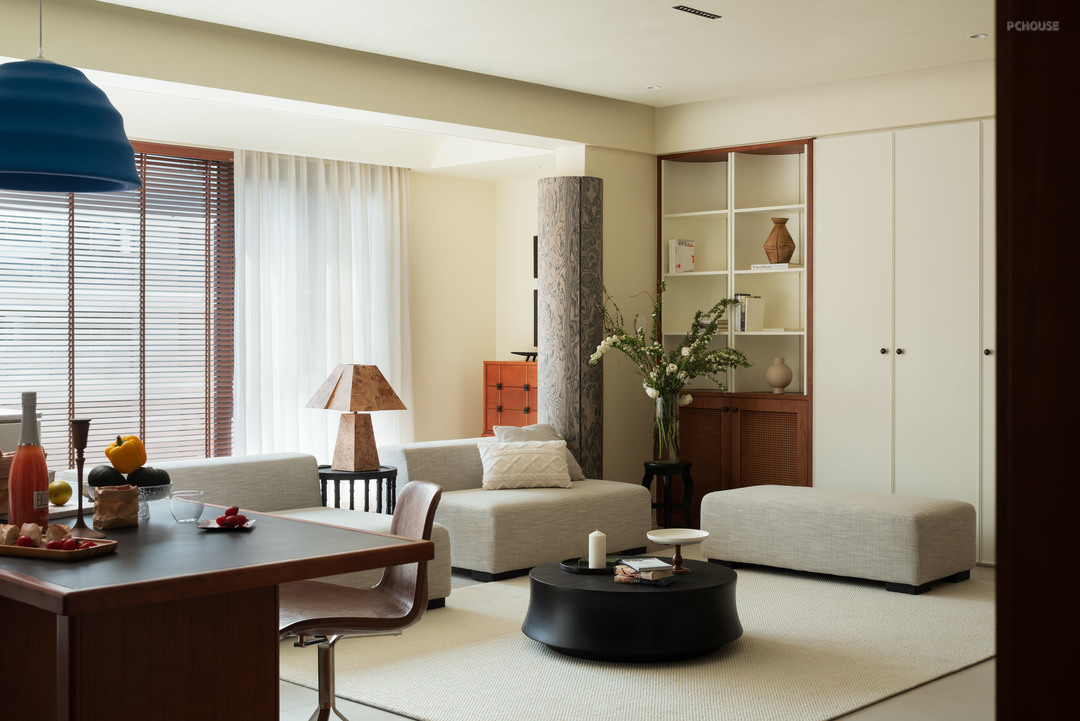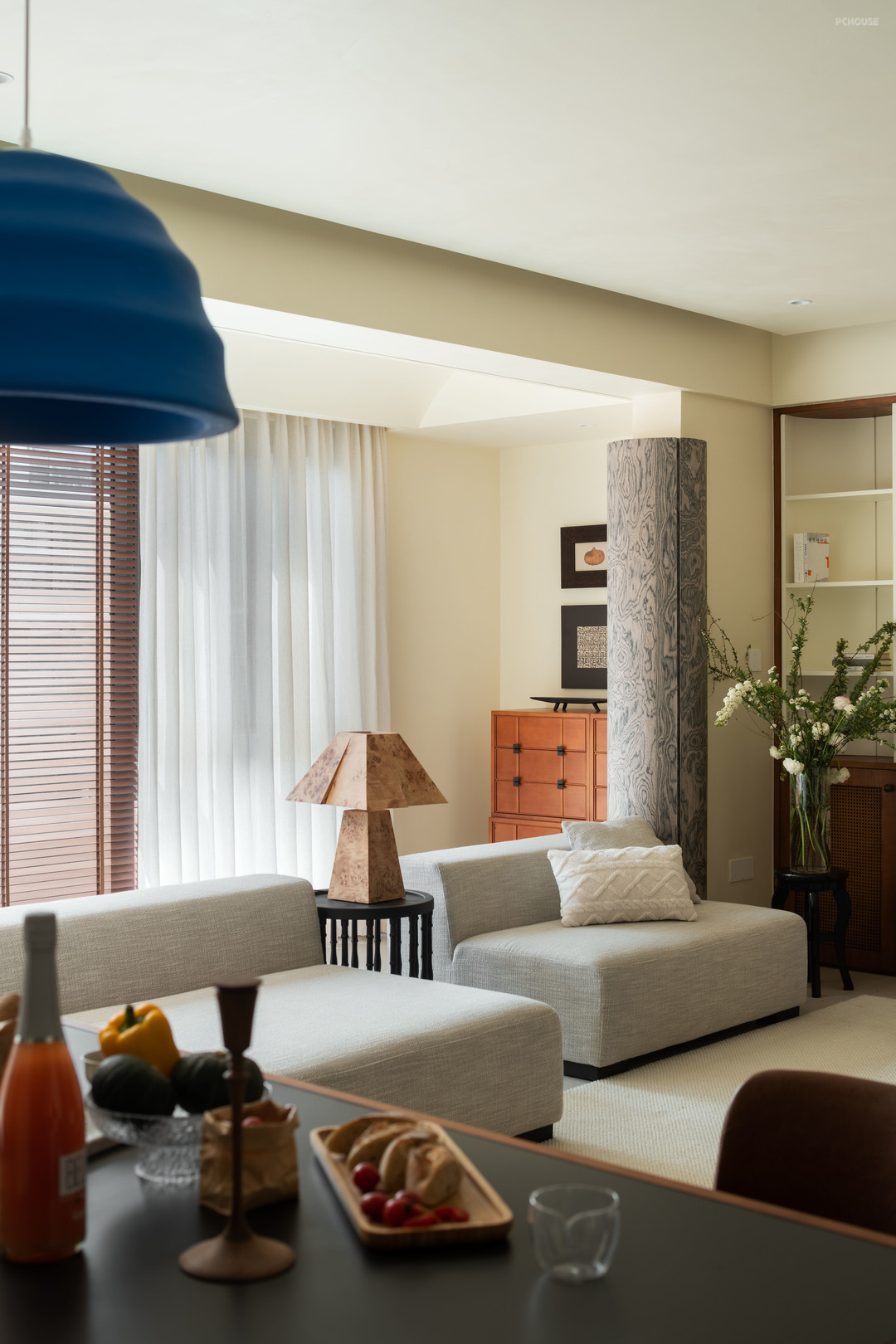 一家三口,喜欢舌战群雄的孩子,看报的爸爸,追剧的妈妈,他们的中心思想就是在家要随意,哪里都可以带上半天或躺或坐,随性而为之。家里的可变性很大,如果爸爸想晒太阳了,沙发可以合成背靠背沙发面对阳台沐浴阳光,此时一本我们的老院更是应景。当孩子想理清辩论赛的思路时,全家又可围合式坐一起聊着不同的观点与思路。周末妈妈只需抱着爱吃的薯片坐在地毯上享受此时属于自己的时光,一切的一切它是多变性也是随意性。
