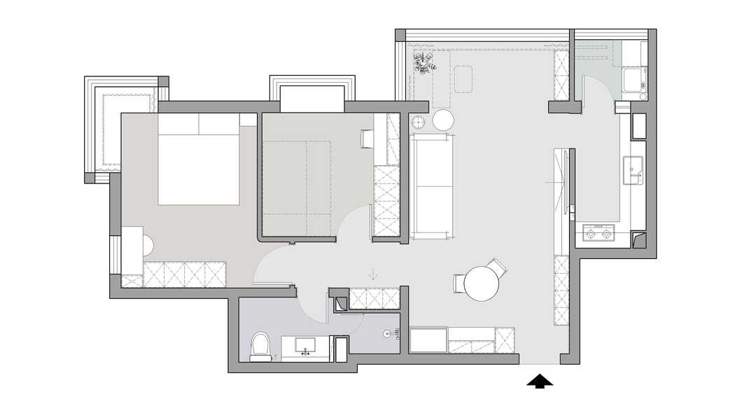 3.厨房门洞改到靠近阳台区域,做L型操作台,动线流畅。同时厨房阳台可做生活储物。
