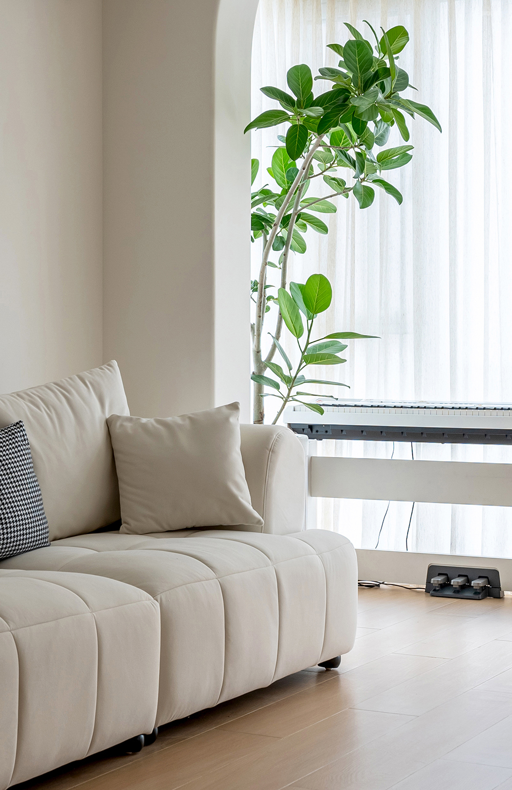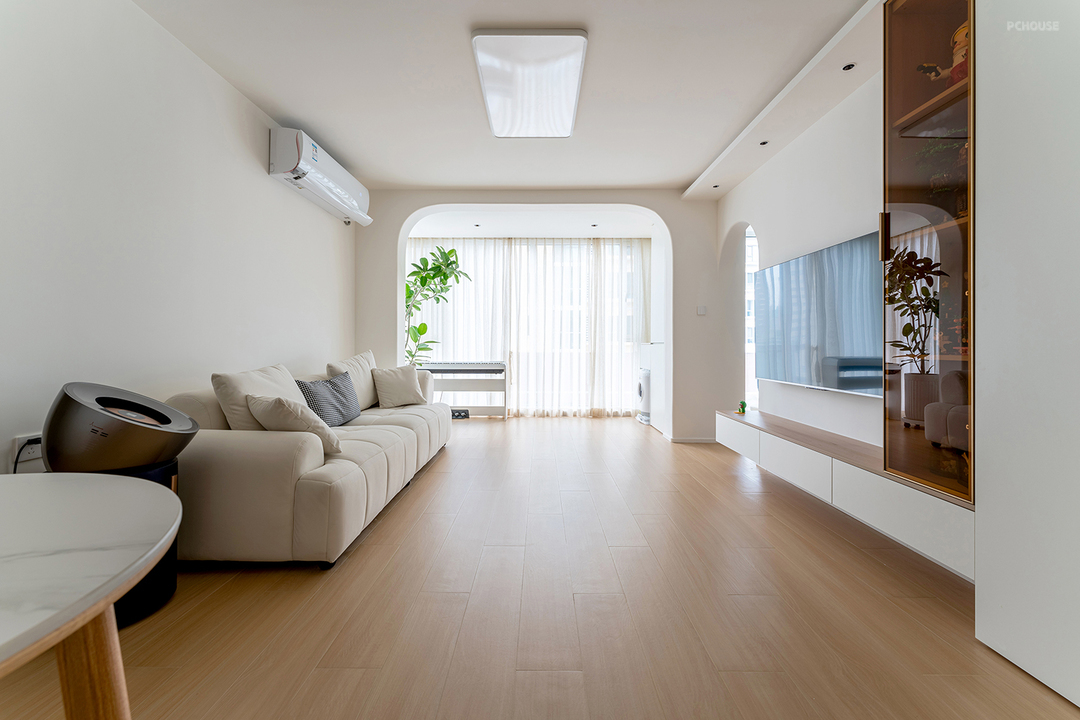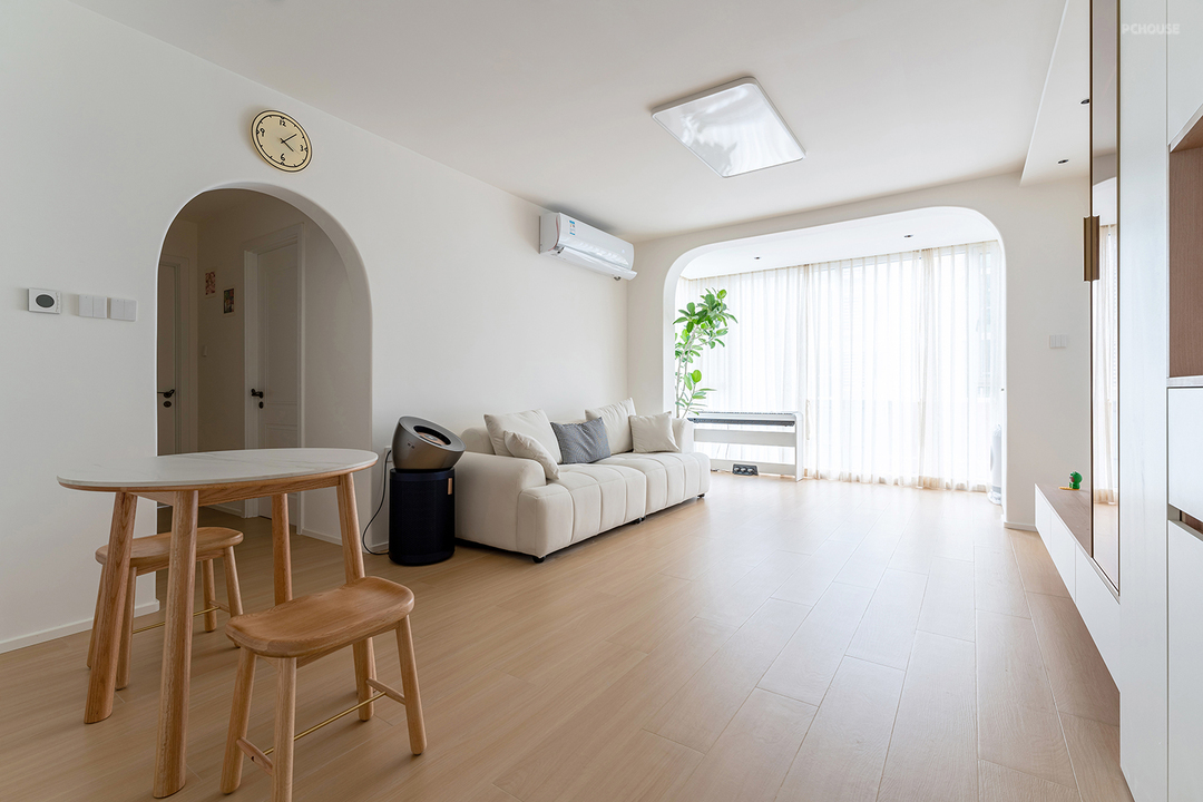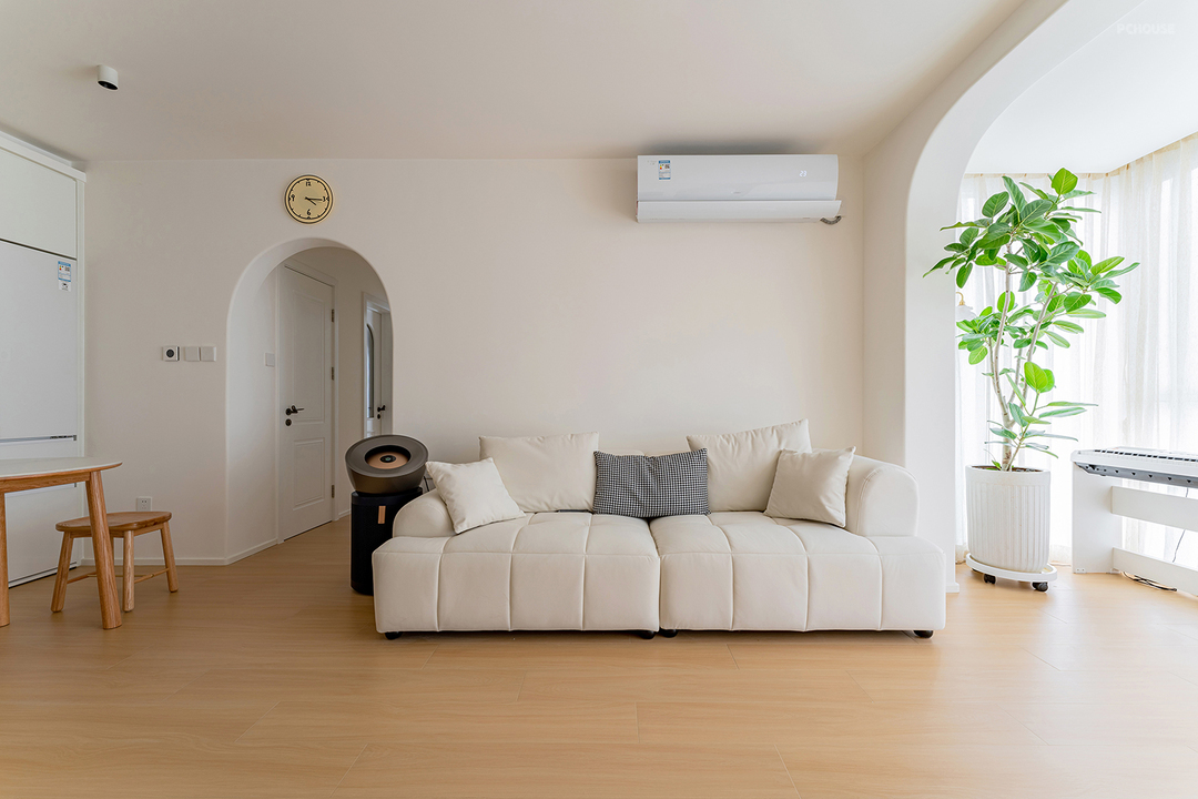 奶油色的墙顶和地面形成层次区域,非常舒适。门洞的结构上做了弧形的处理,刚好阳台上的植物探过弧形门洞,让原本的空间多了一丝自然和生机~