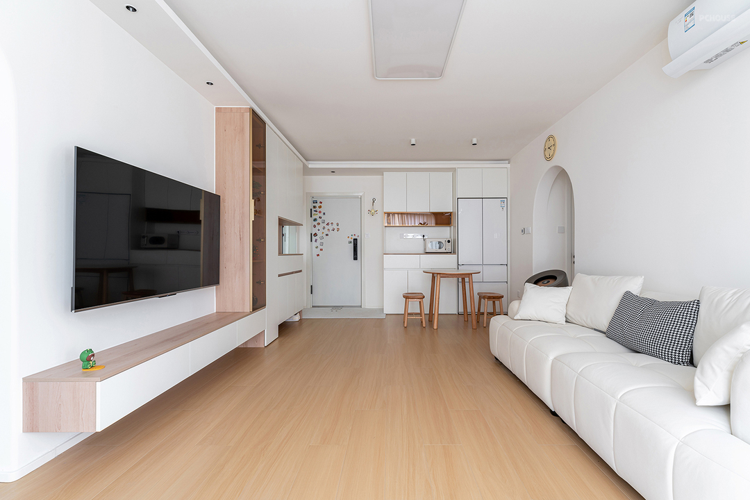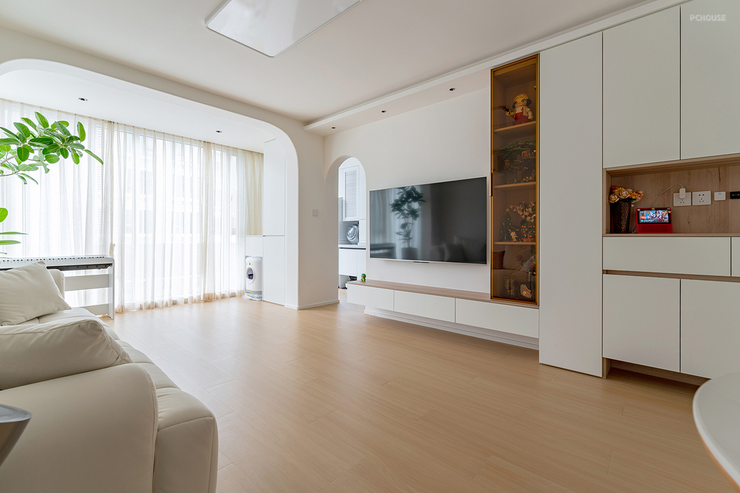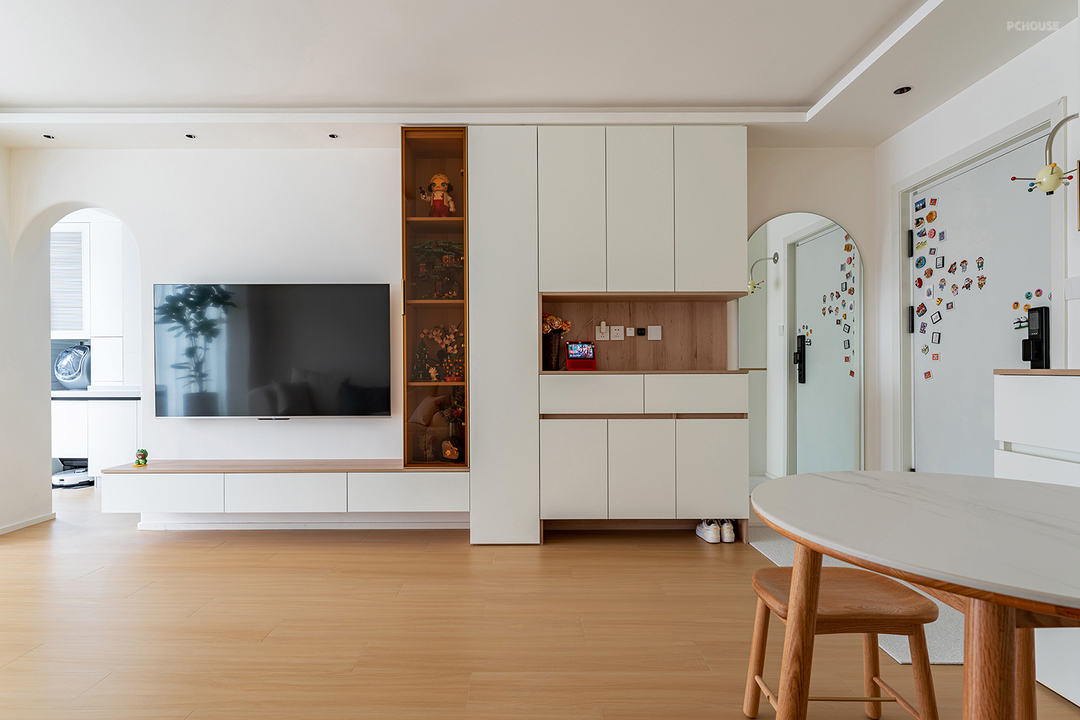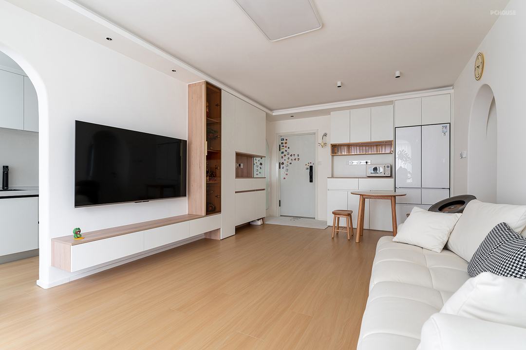 悬浮电视柜,不仅干净整洁,下方空间更方便打扫。无茶几设计为以后有小朋友时,留出更多的空间与家人互动、玩耍。