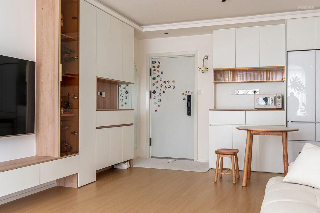 餐边柜外观更加方正整洁,最大化的增加储物的需求。搭配圆形折叠餐桌,满足日常两人用餐的同时,也调整了空间的灵活性,整个客餐区的动线也变得更加舒适合理~