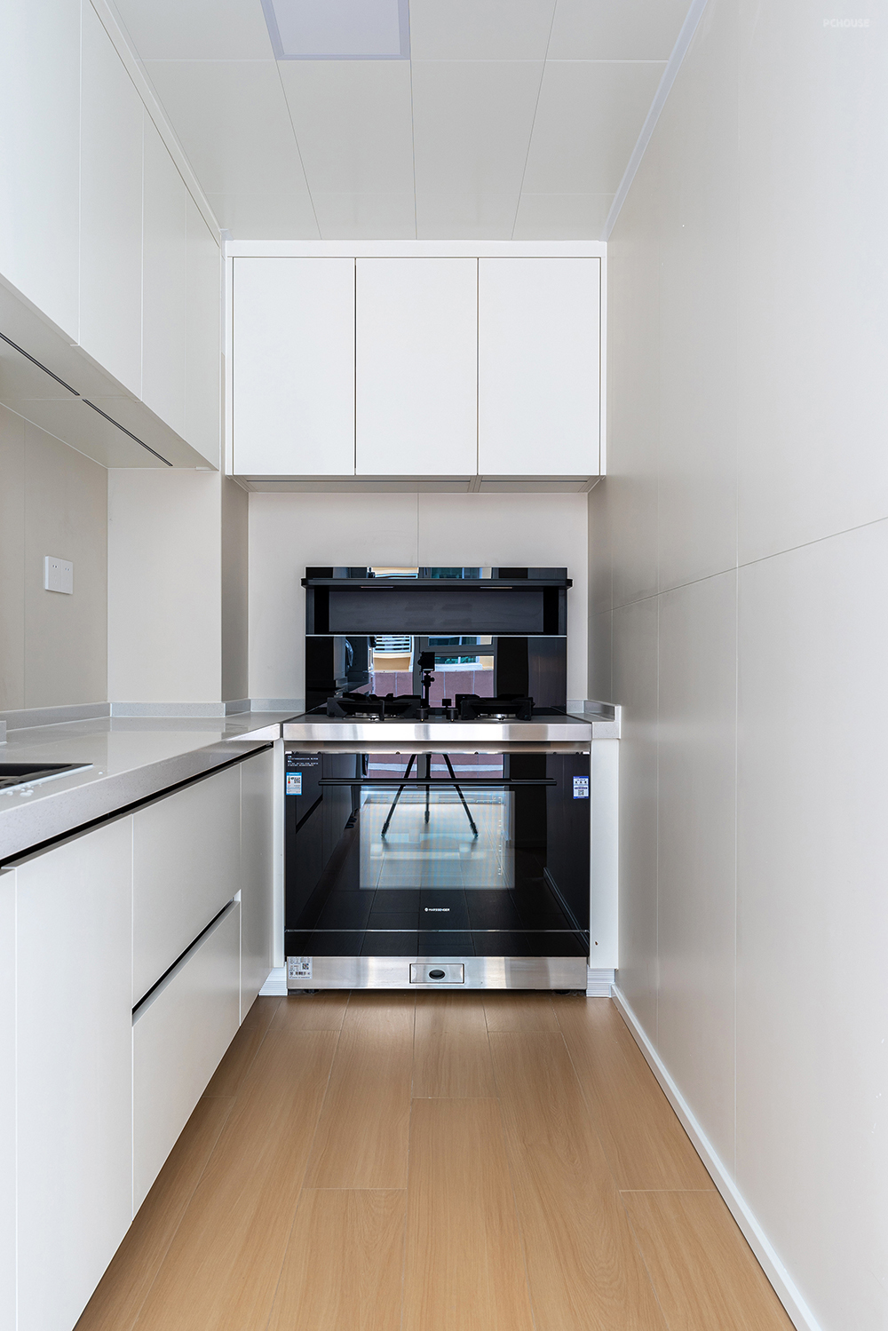 半开放式厨房,选择最大吸力的集成灶。橱柜也直接通向阳台,没有做过多的分割。舒适的动线让阳台的生活阳台更好利用,超大的落地窗光线和通风,都能很好的空间。