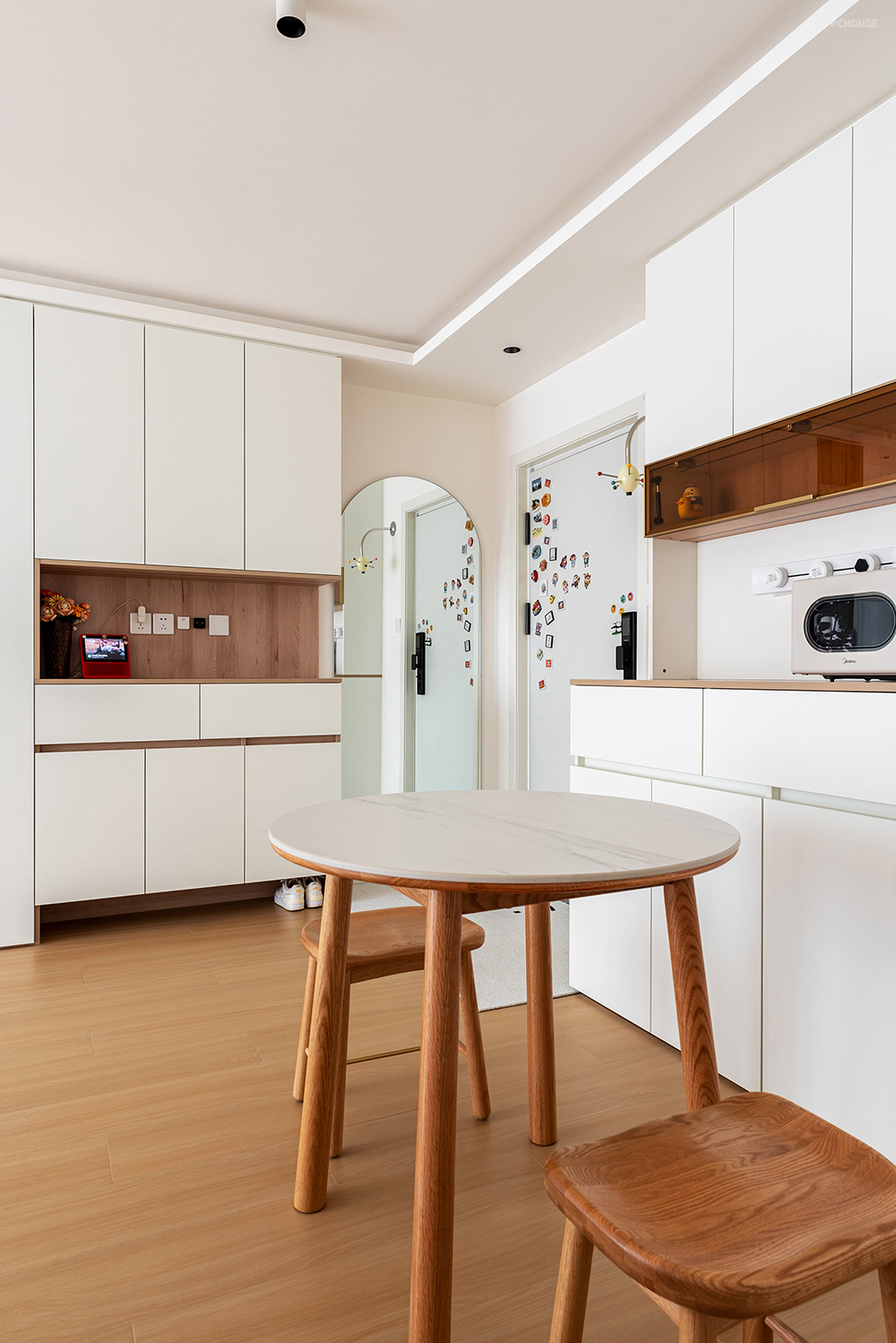 2.方正的空间和柜体,搭配圆形餐桌,环绕式动线弱化过道,增加空间灵动性。