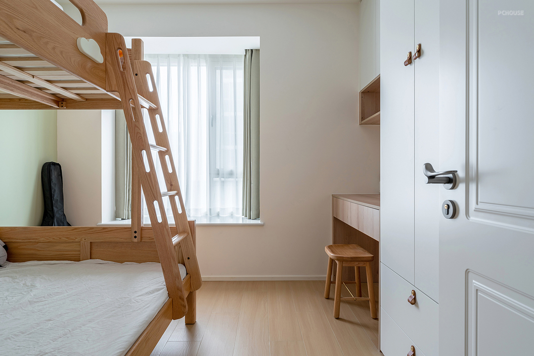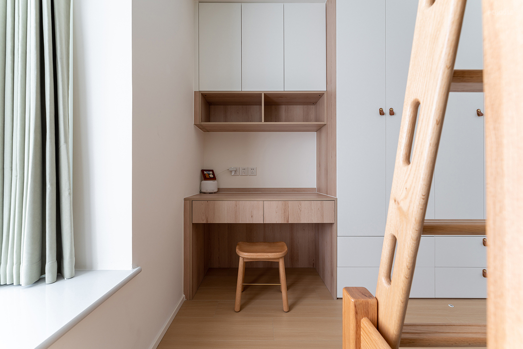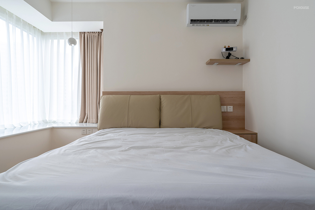 悬浮床设计简约,床下可放置储物。转角大飘窗做隐藏式窗帘,坐在飘窗上感受休闲时光~