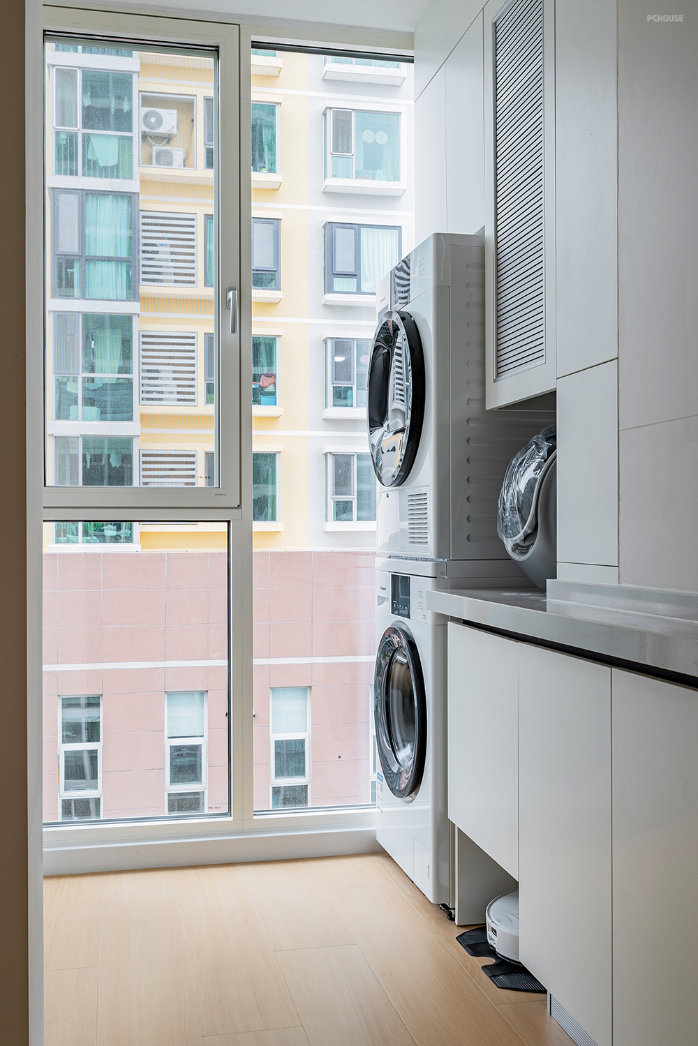 生活阳台太舒适了,洗衣机烘干机上方做高柜增加储物量。右侧橱柜台面延伸过来;下方放置扫地机器人;中间台面放置内衣机;上方做百叶门隐藏壁挂炉。一组柜子就这样同时满足多种功能。