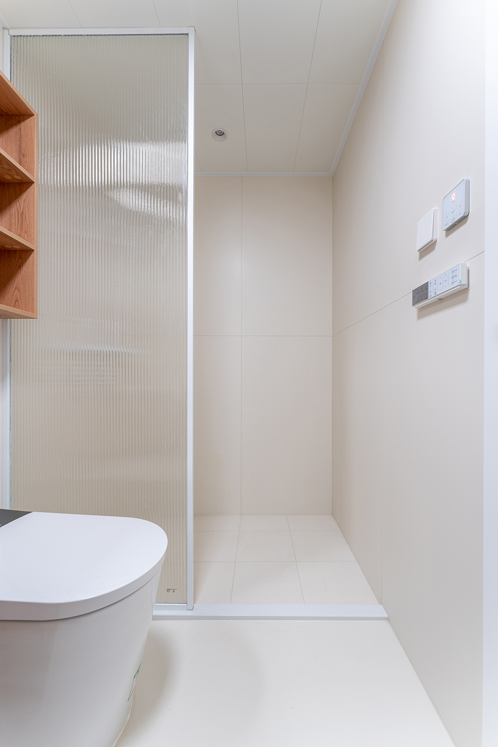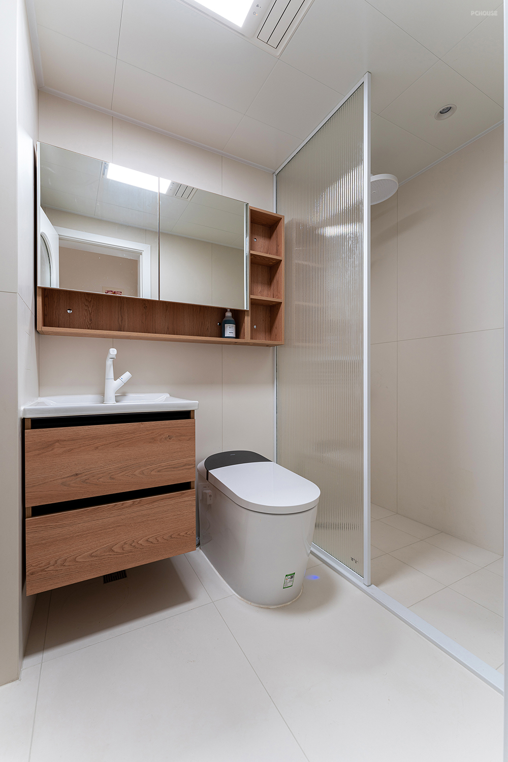 洗手盆下方悬浮30cm,方便清理。上方镜柜通长延伸到淋浴房隔断处,开放格区域可随手放置纸巾、牙刷等用品。整体奶白色柔光砖铺贴,搭配木纹质感,增加一些自然的气息。