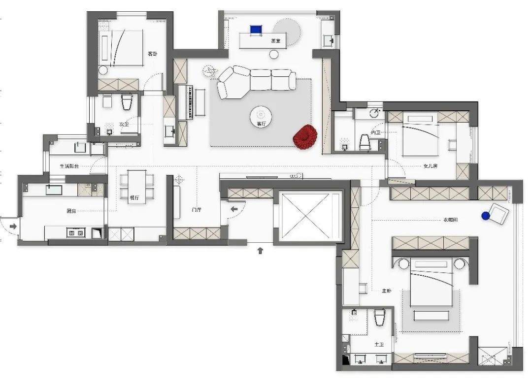 ①.本屋是一个240㎡的大平层,各空间的面积比较足够,客厅是整屋的休闲中心,客厅定位就是能够满足业主家庭聚会和书架以及钢琴摆置的功能;
