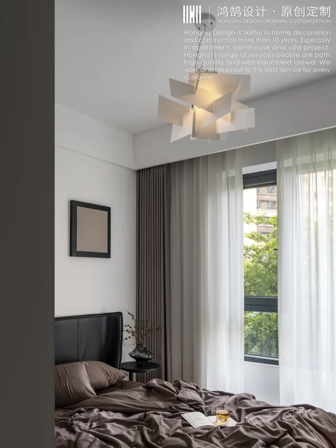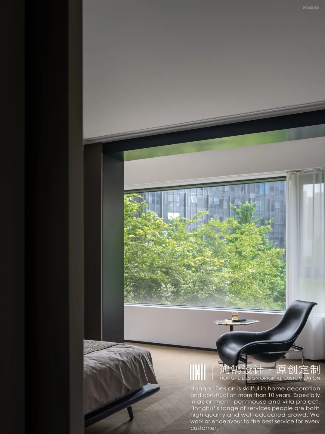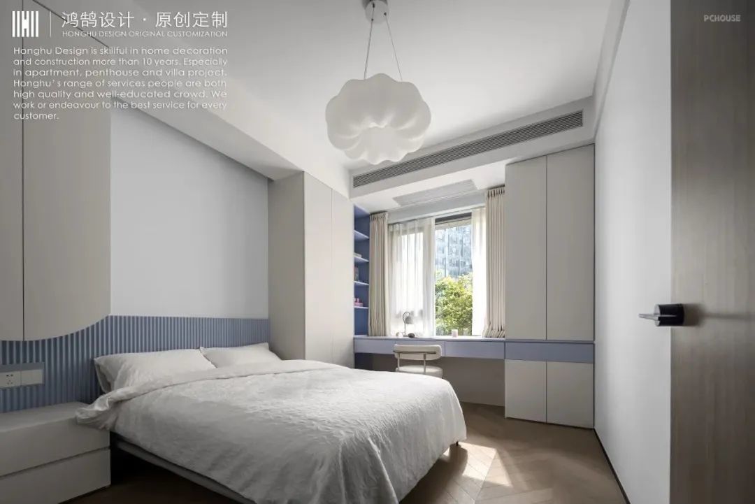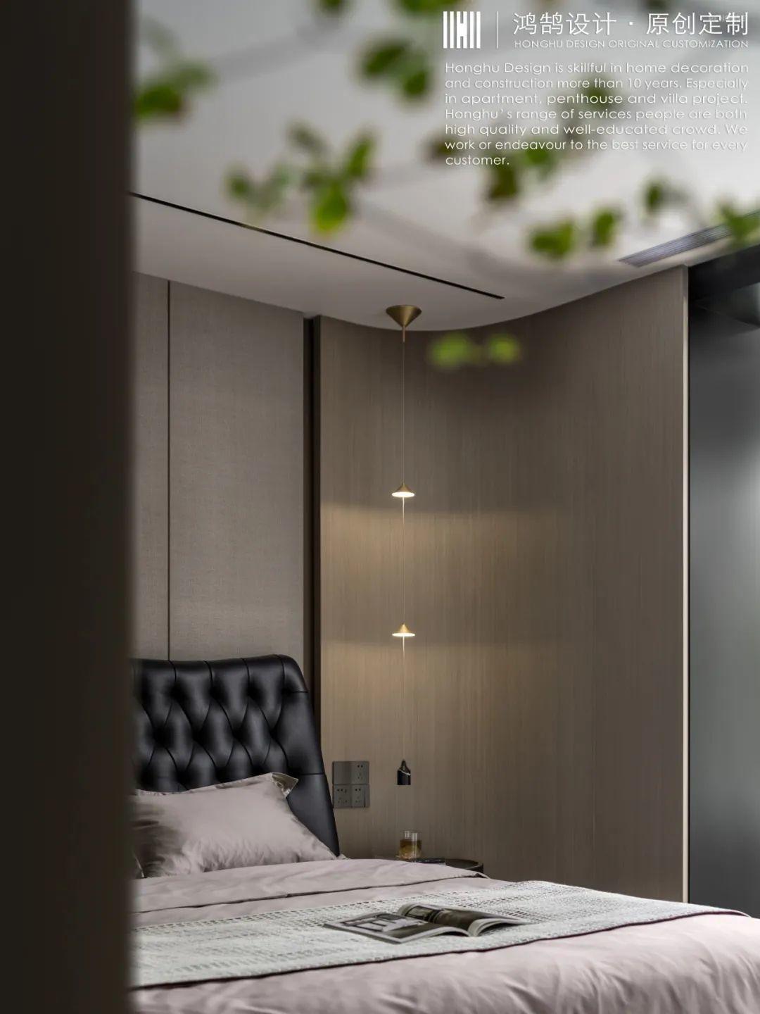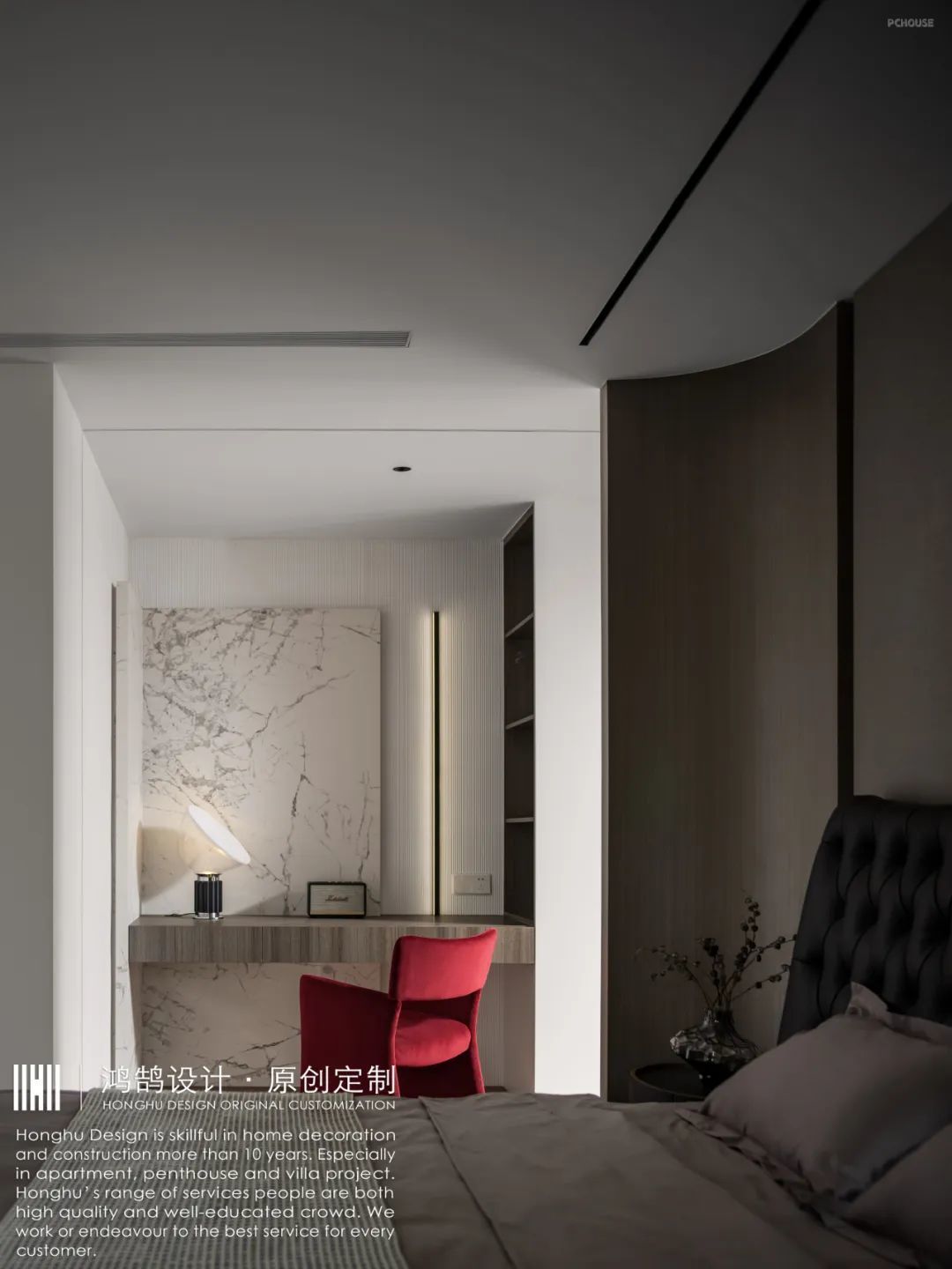 主卧的空间,设计了圆弧的包裹形状的造型,是一个洄行动线,不仅提高了空间利用率,在丰富居住体空间形式上强化轴线对称关系。
