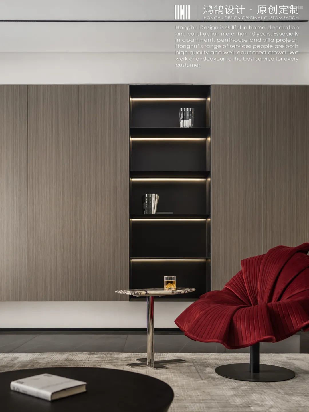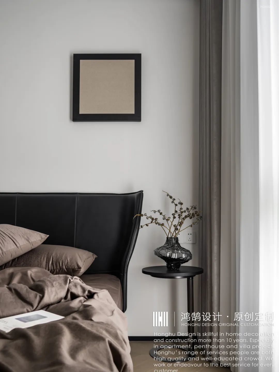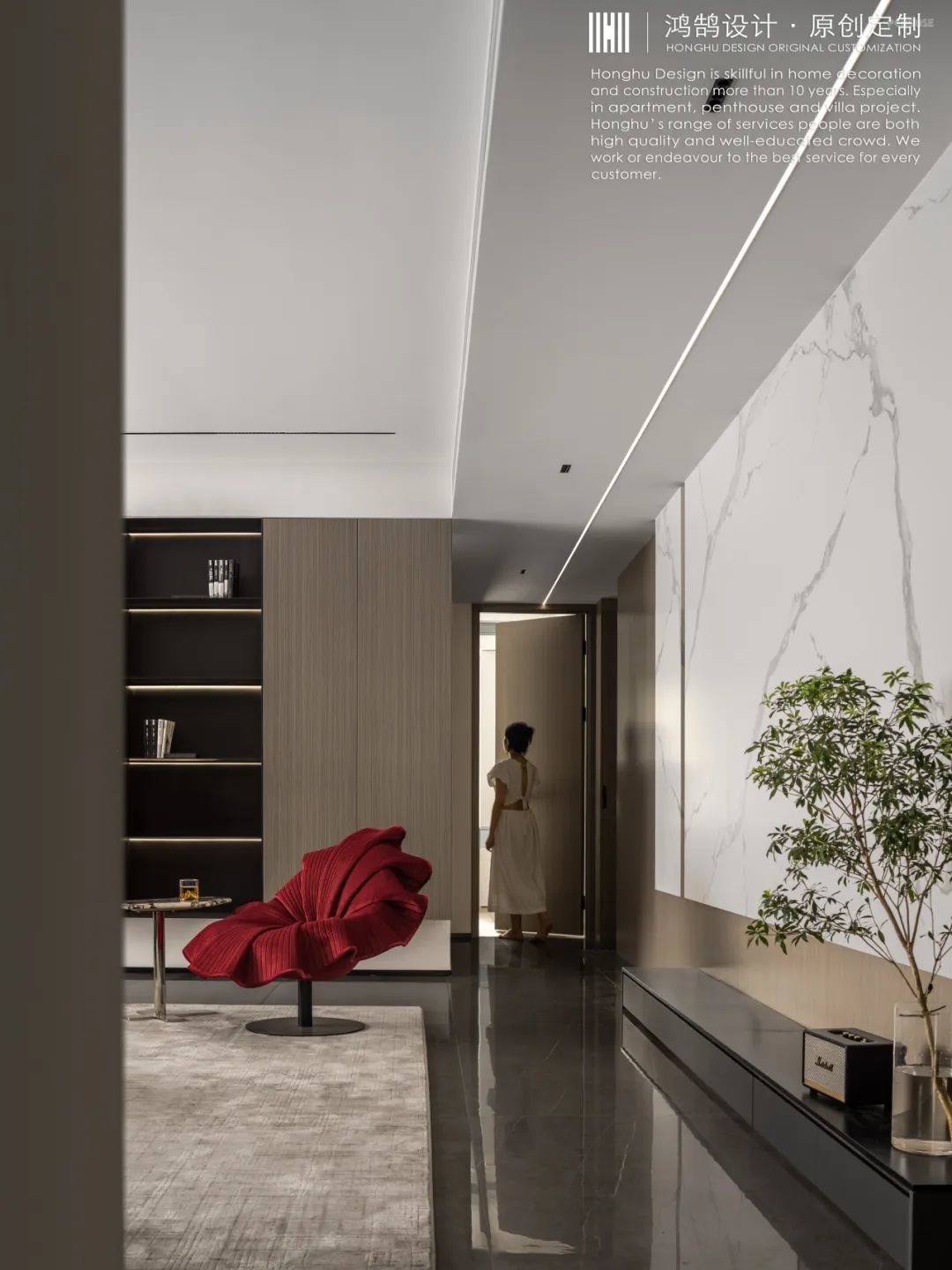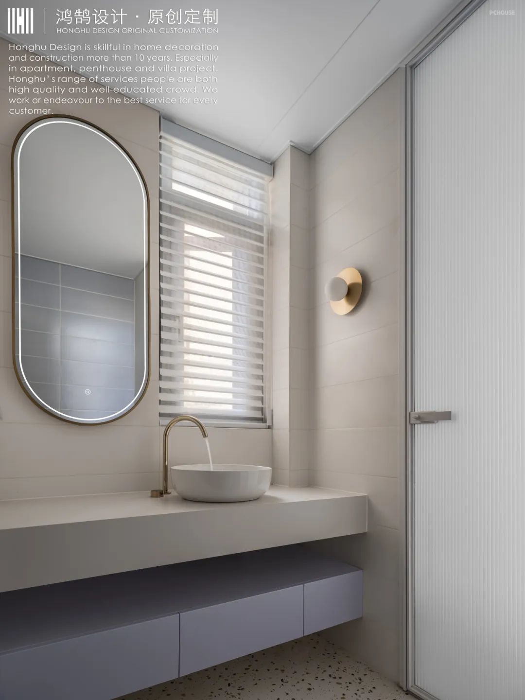 主卧的空间,设计了圆弧的包裹形状的造型,是一个洄行动线,不仅提高了空间利用率,在丰富居住体空间形式上强化轴线对称关系。