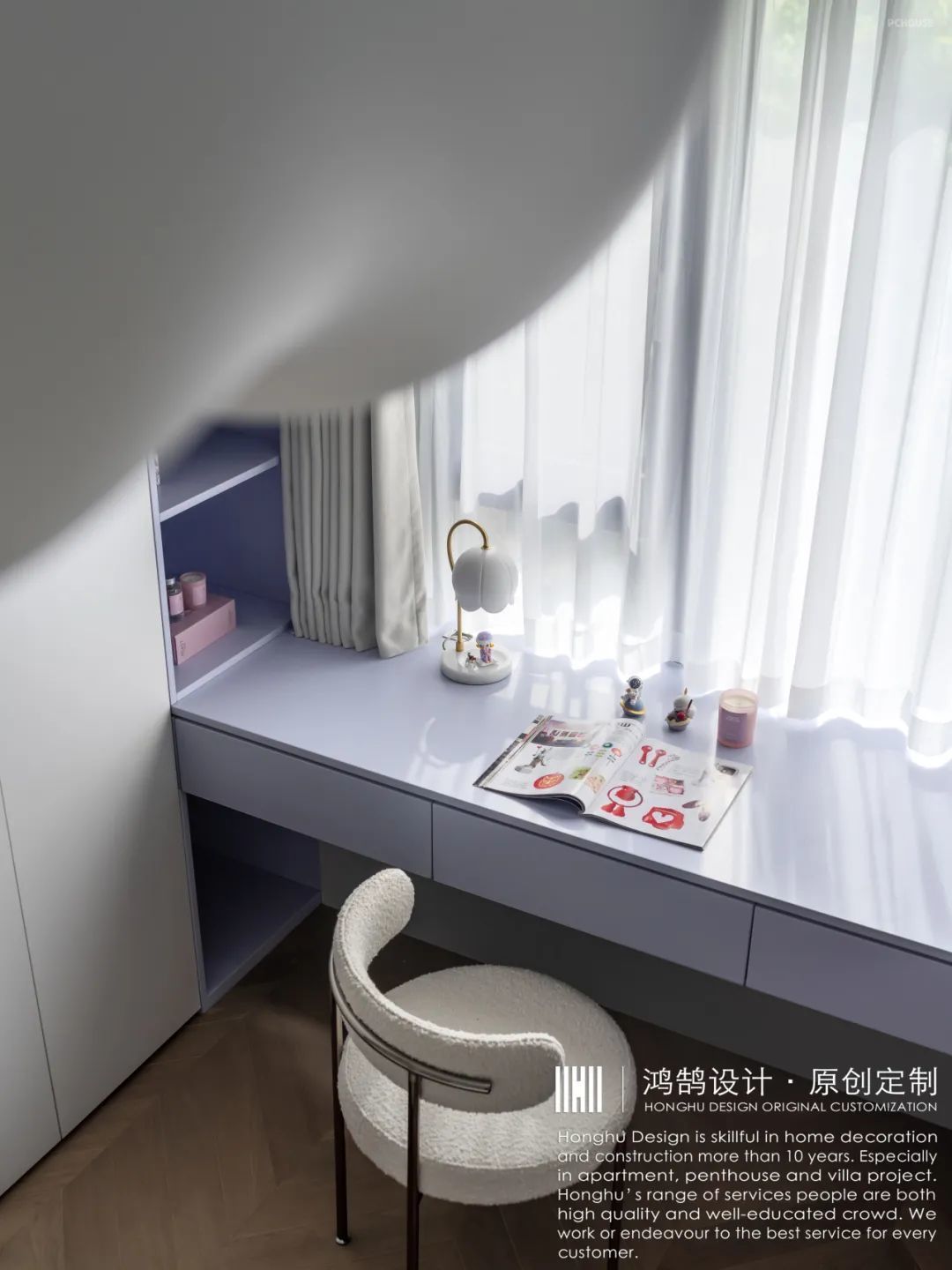 女儿房以梦幻紫色为主,打造了一个梦幻的女孩房间,色彩的融入让空间也变得可爱童趣起来。