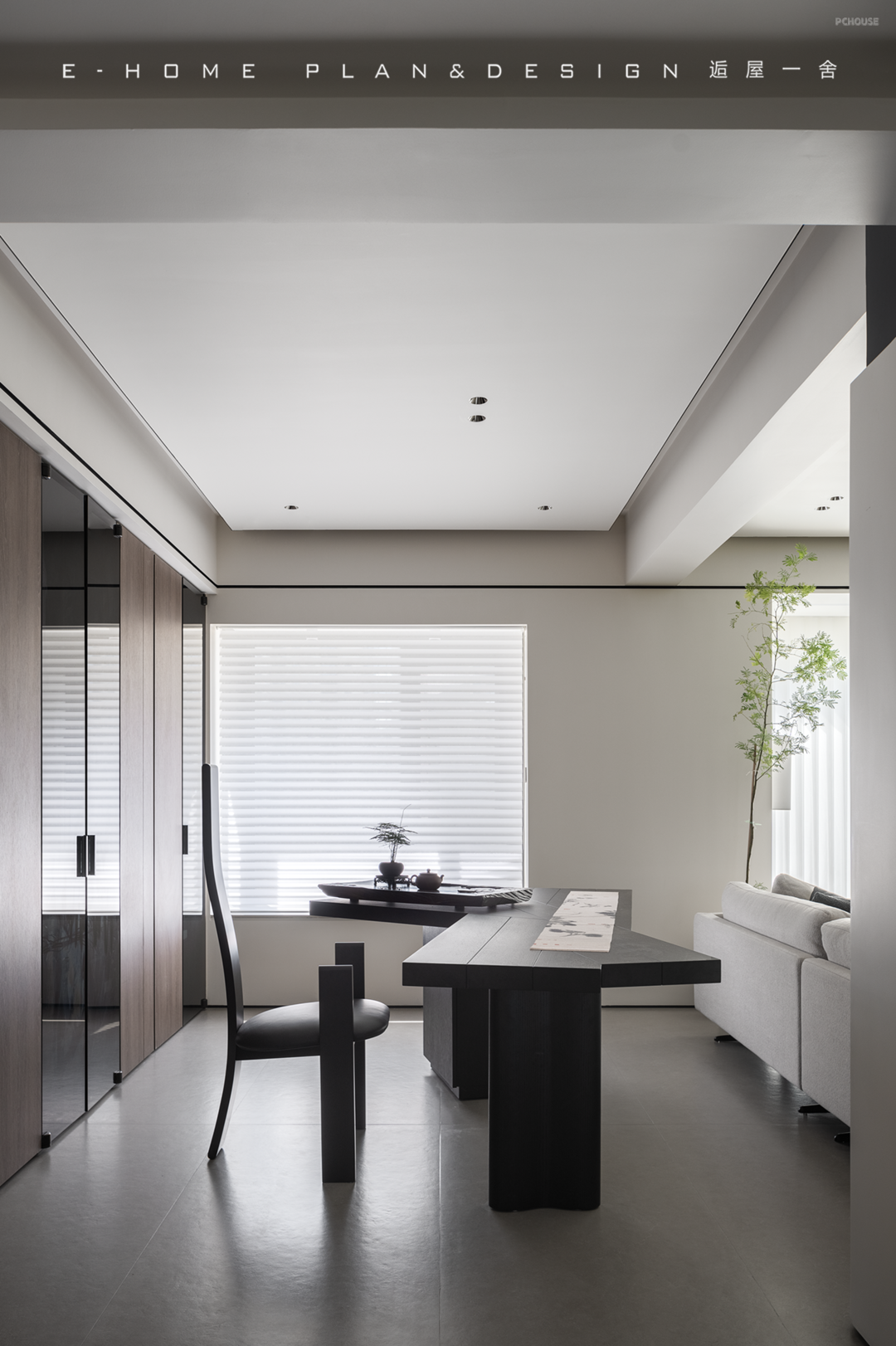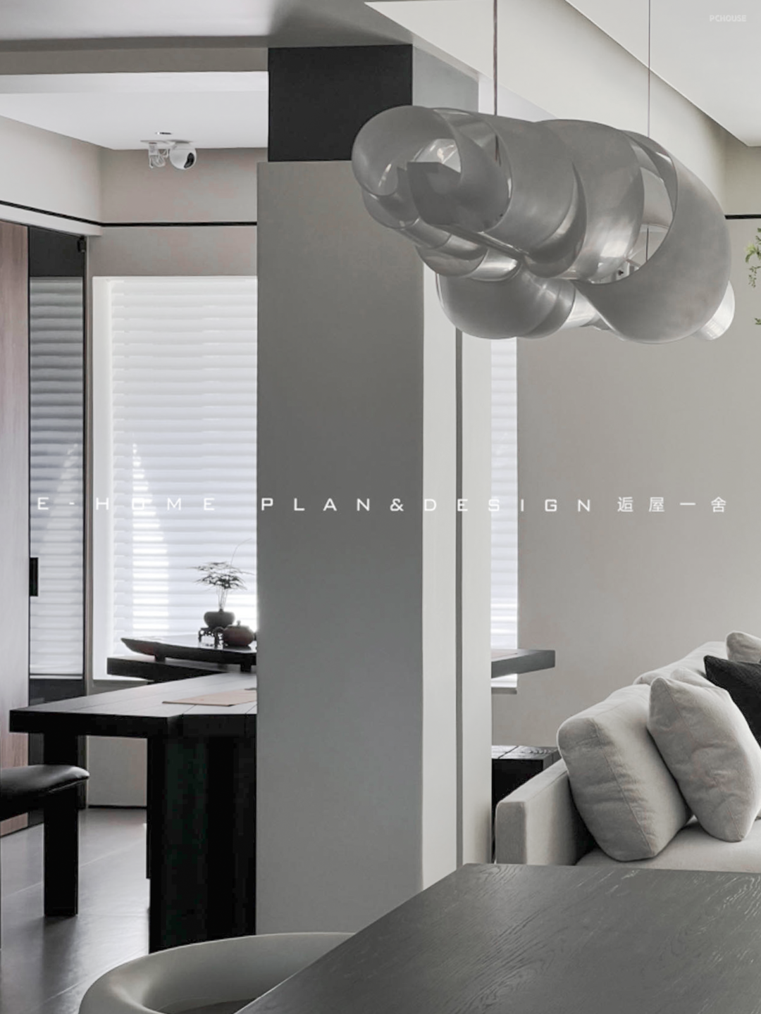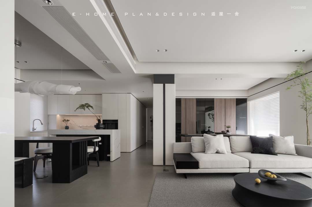 移不开的承重柱反而成为客餐厅的轴心,设计师稍加勾勒,它就犹如一卷青简,引出沙发背后的茶室字画空间。