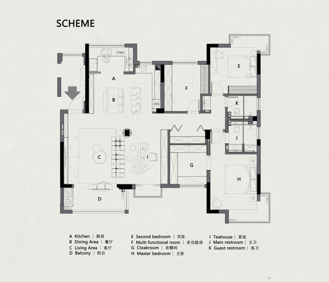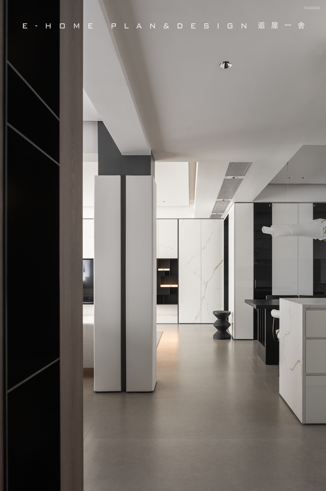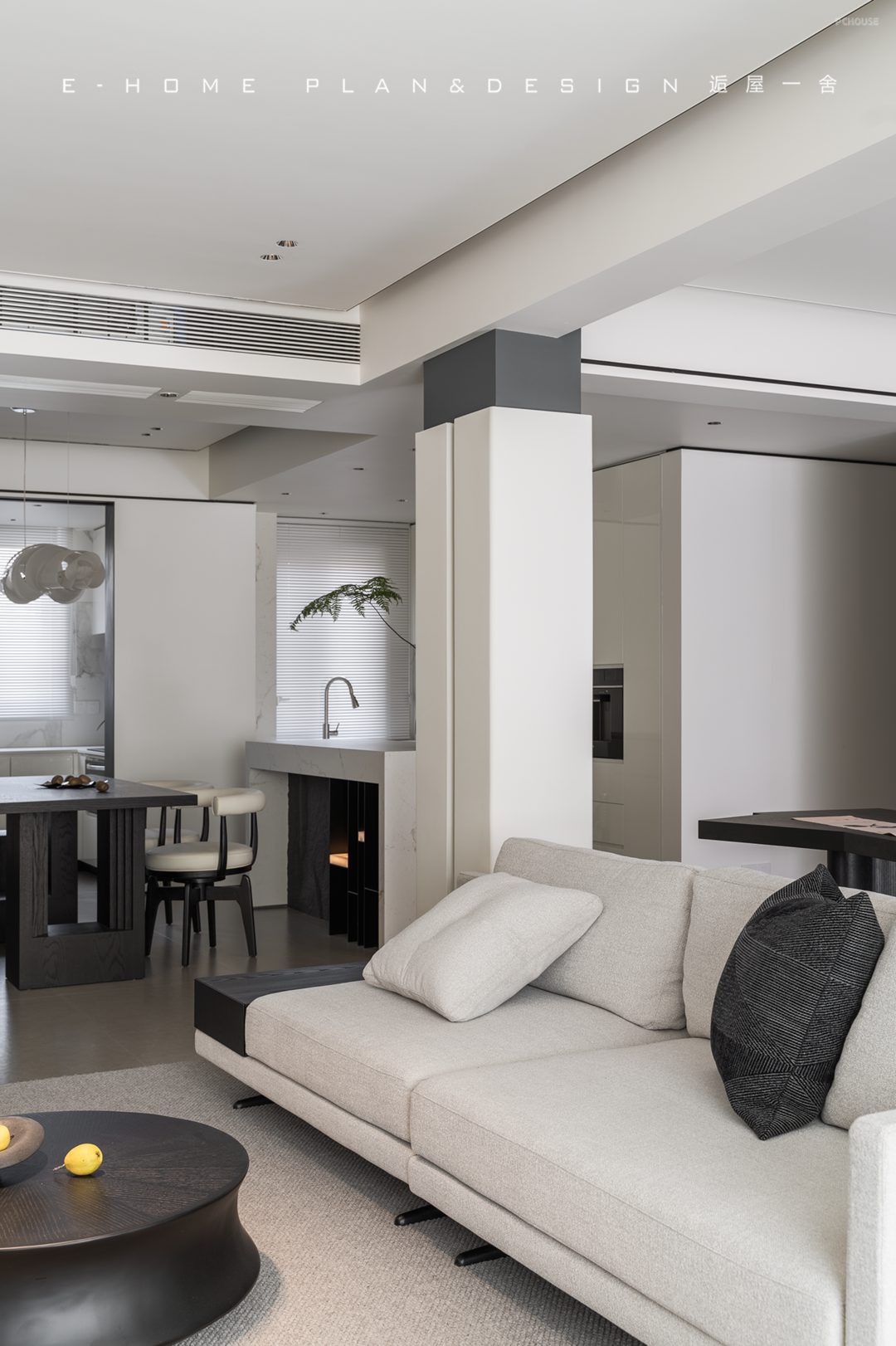 移不开的承重柱反而成为客餐厅的轴心,设计师稍加勾勒,它就犹如一卷青简,引出沙发背后的茶室字画空间。