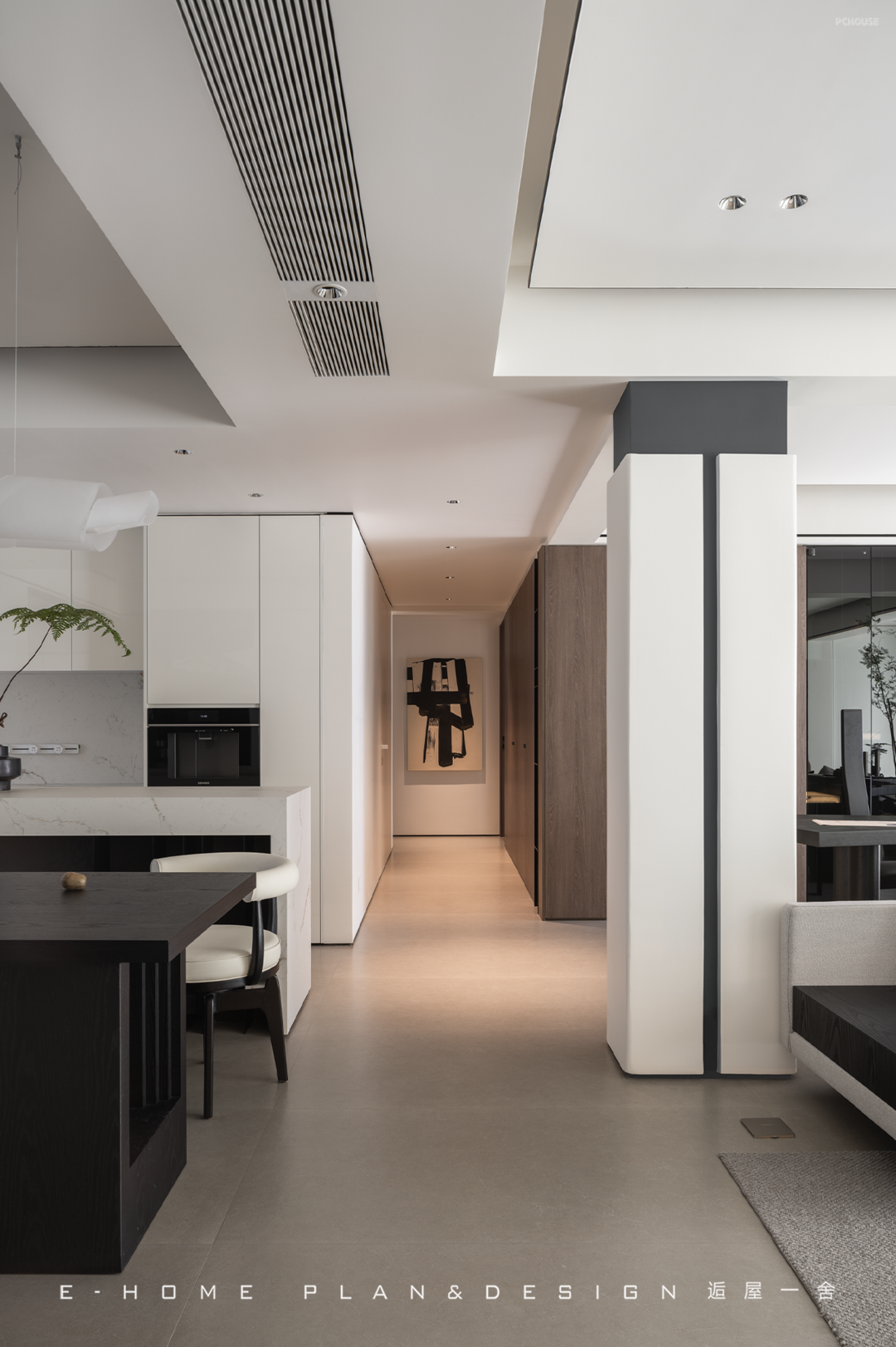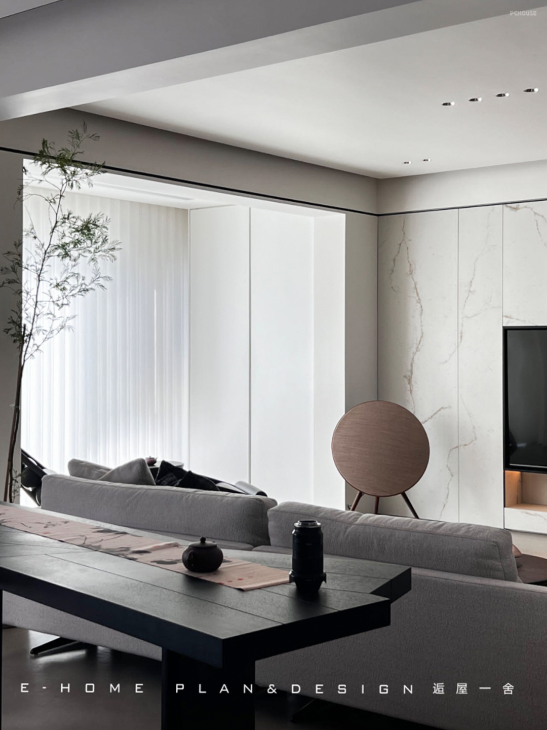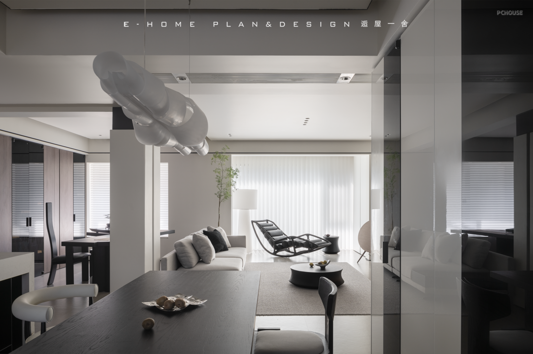 只是因为拆了一面墙,光影扶疏的画面就全部涌进客厅,房子表现出的敞亮性格让来访者放下拘谨,屋内的材质避免流光溢彩,不喧闹,在正式待客中又保留属于家人的轻松氛围。