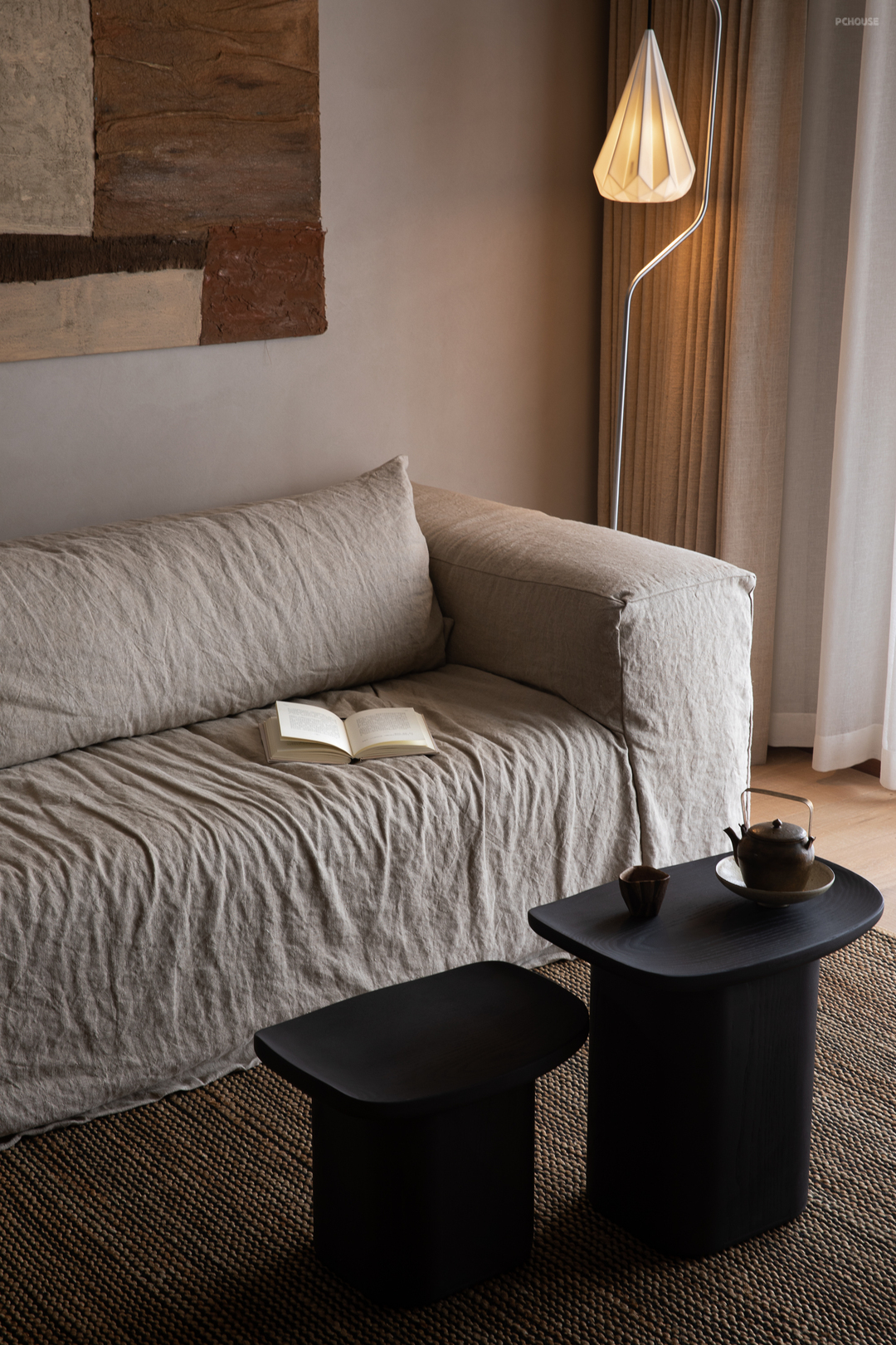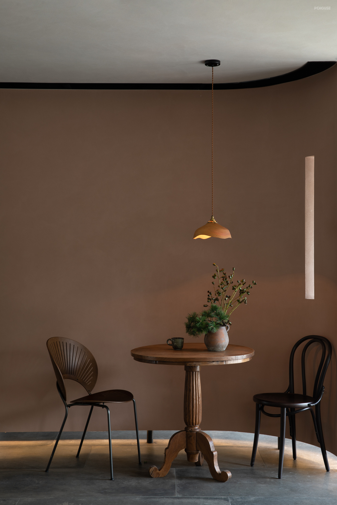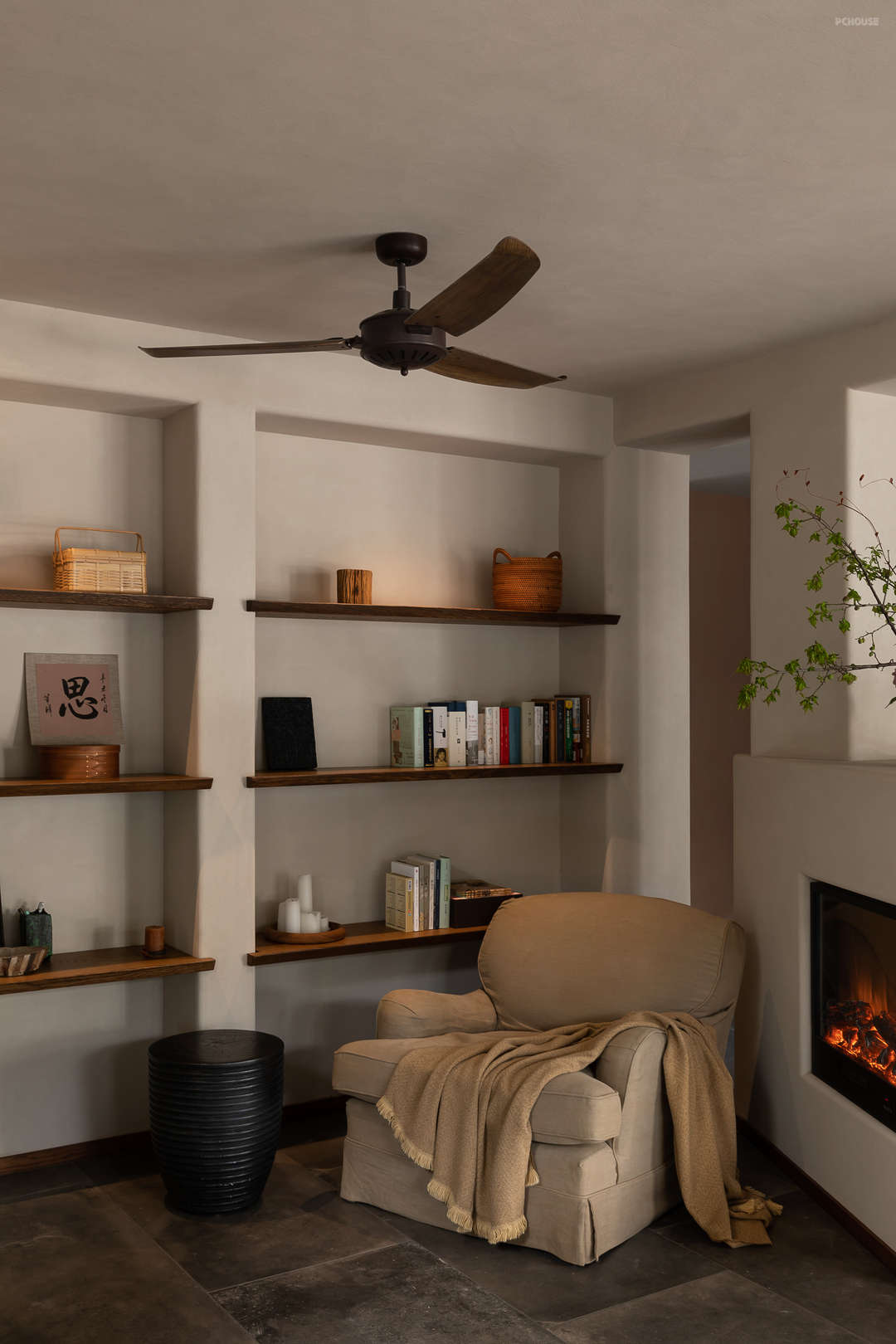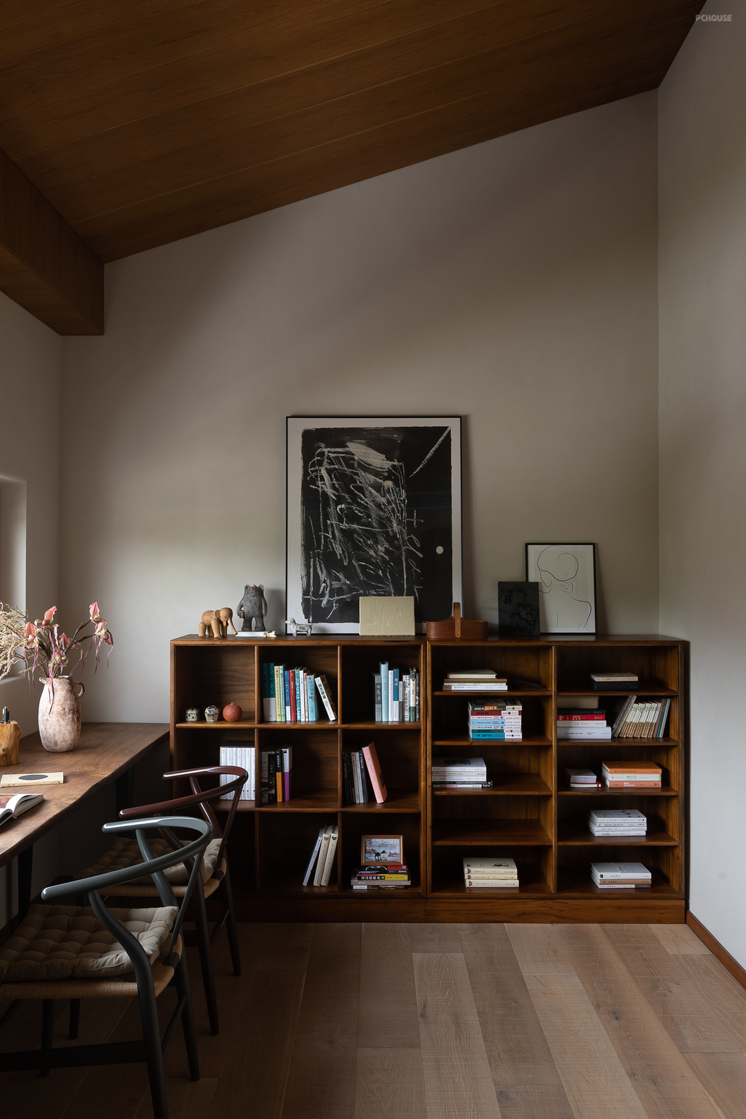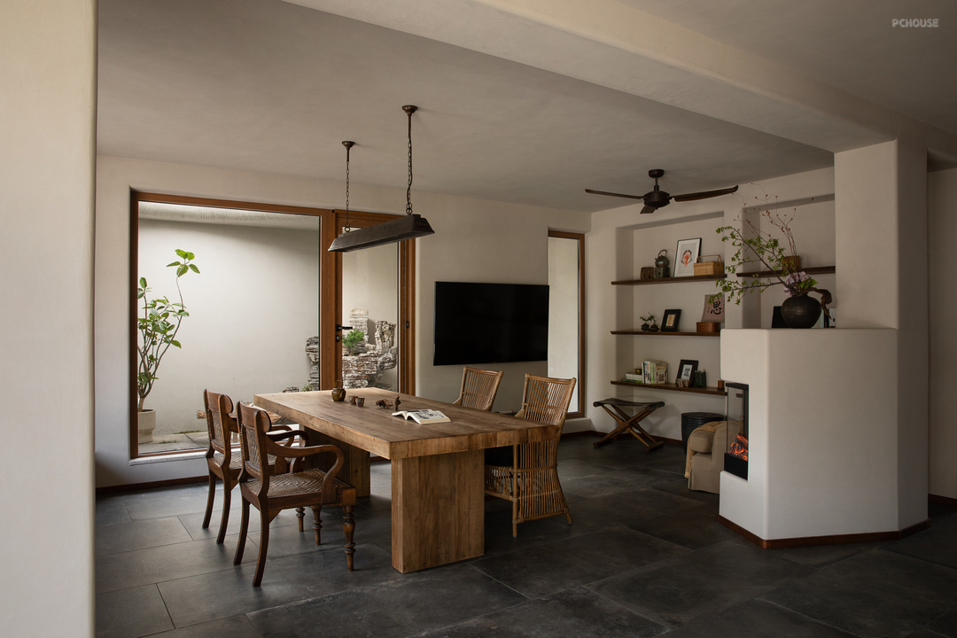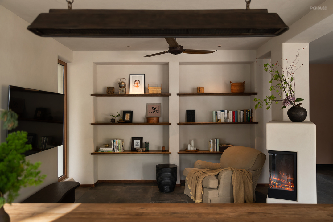 悬起的弧形玄关墙,柔和自然的曲度,娴雅而安全感满满地包裹住女主人阅读日常,垂灯插花,闲谈人生,好不惬意。而右手边,以一件硬木大餐台为视觉中心,聚拢起夫妇俩退休后的起居生活、利用壁炉衔接起不可隐藏的承重结构柱,再次以小曲度围合,形成一个单人沙发观影区方案。