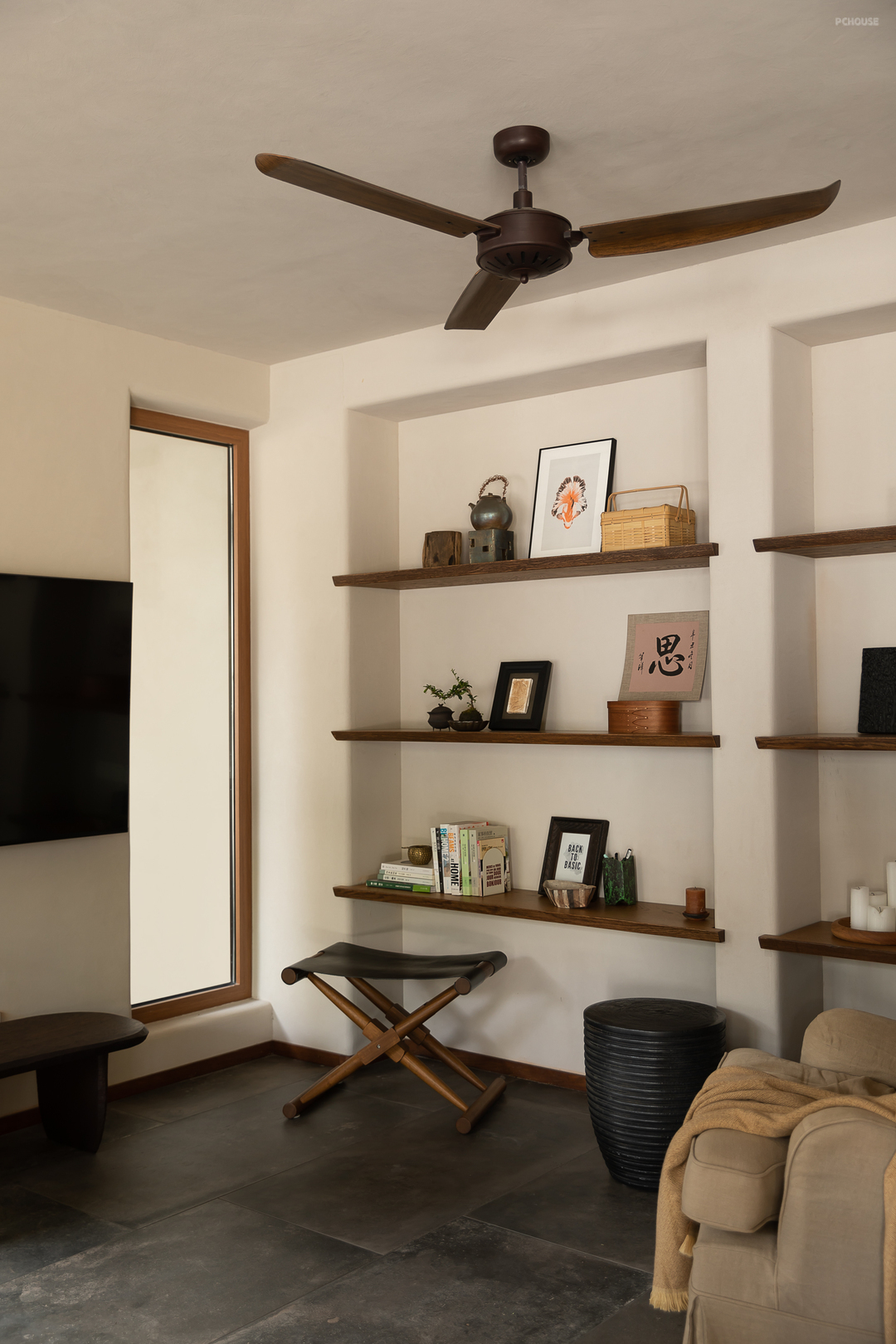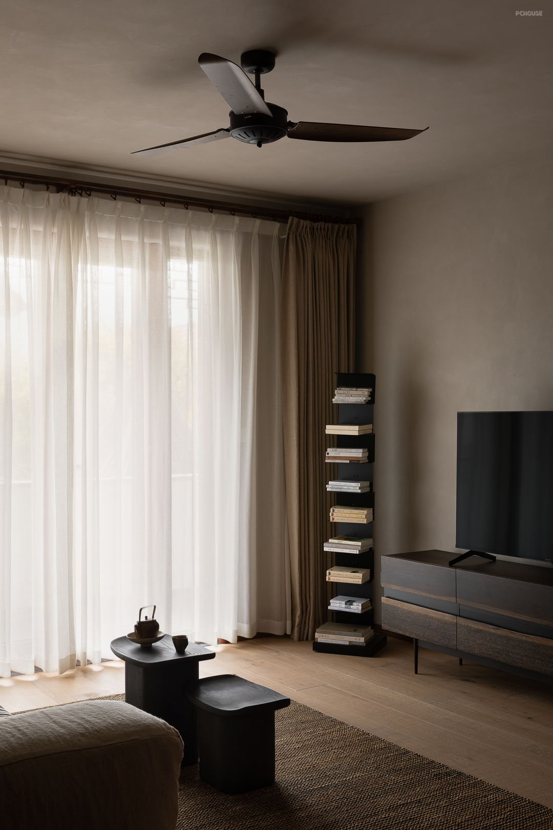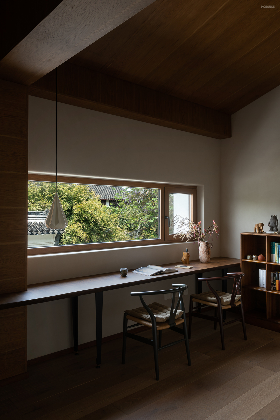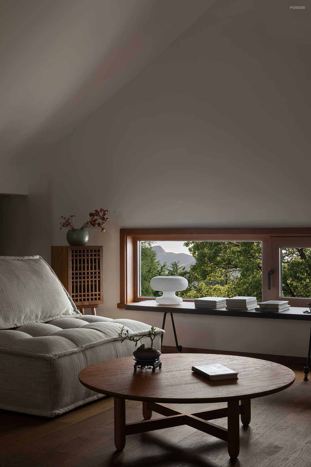 悬起的弧形玄关墙,柔和自然的曲度,娴雅而安全感满满地包裹住女主人阅读日常,垂灯插花,闲谈人生,好不惬意。而右手边,以一件硬木大餐台为视觉中心,聚拢起夫妇俩退休后的起居生活、利用壁炉衔接起不可隐藏的承重结构柱,再次以小曲度围合,形成一个单人沙发观影区方案。