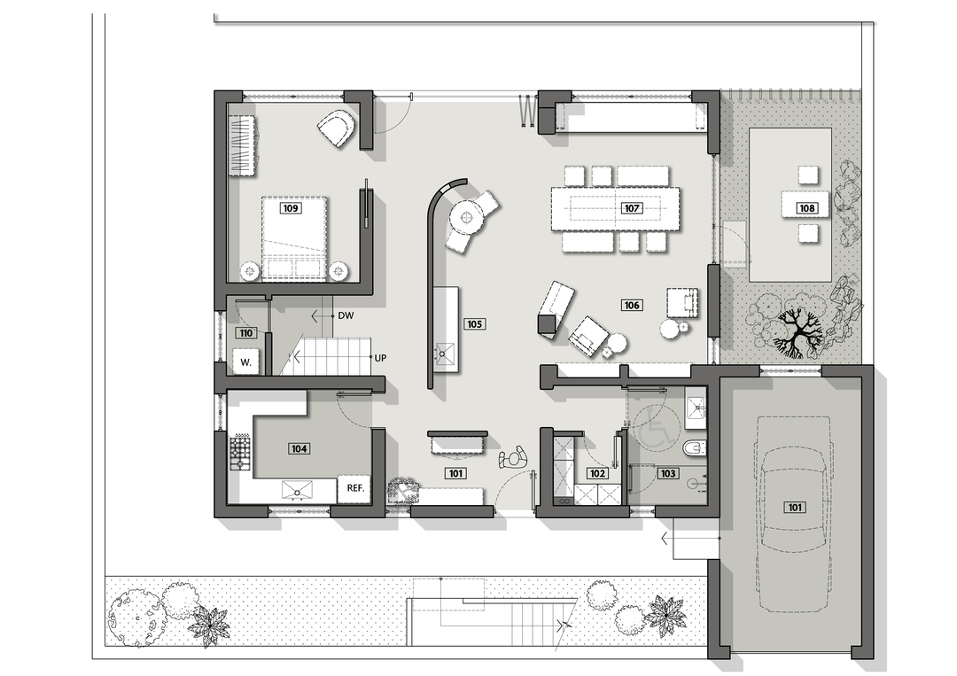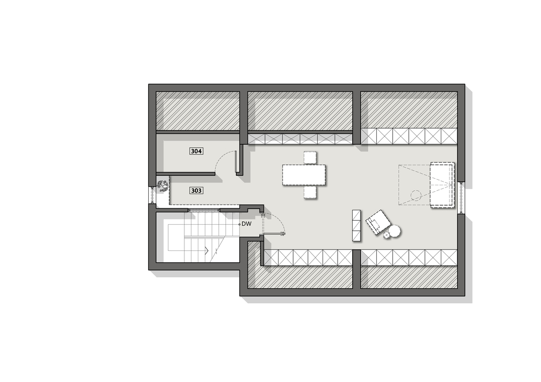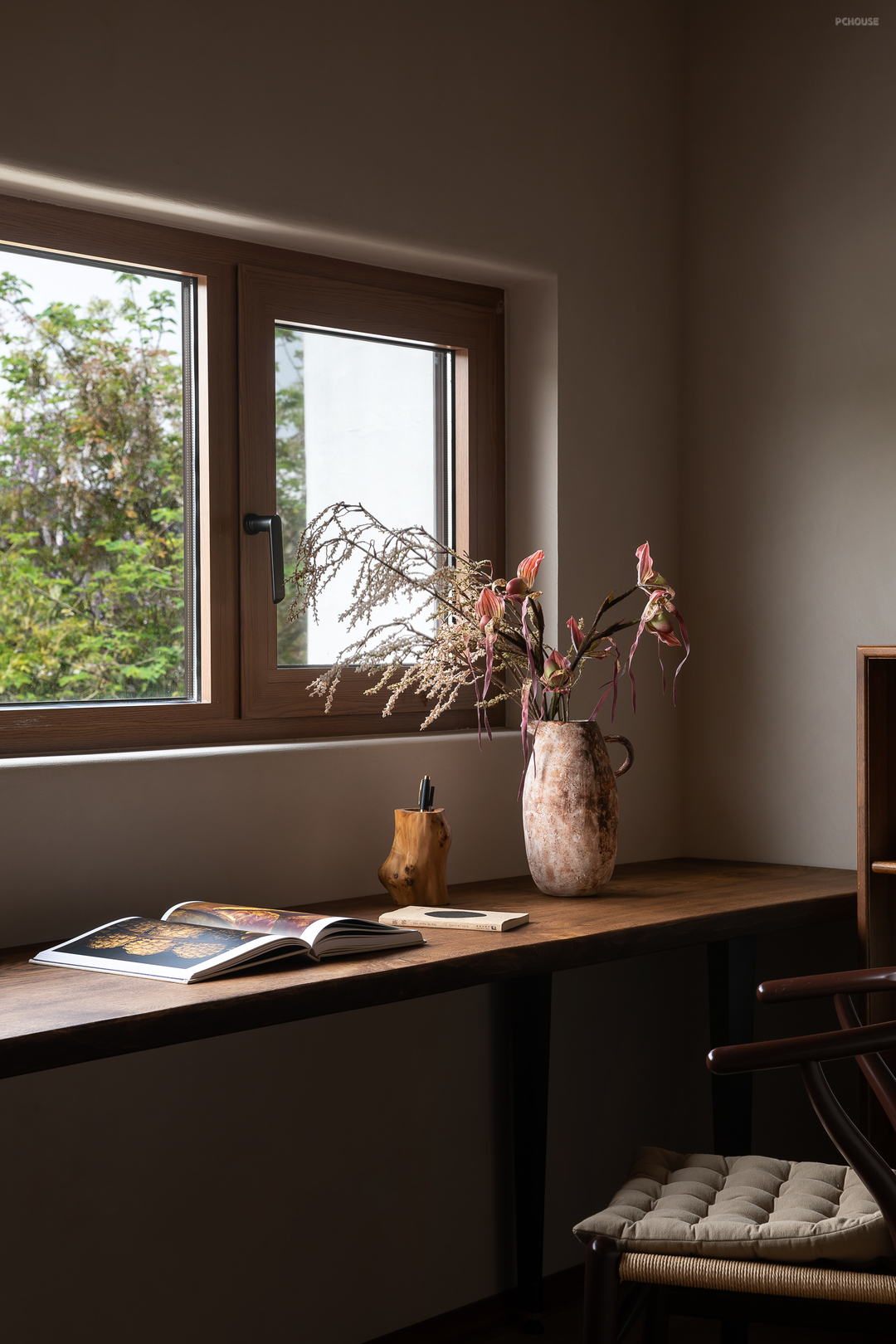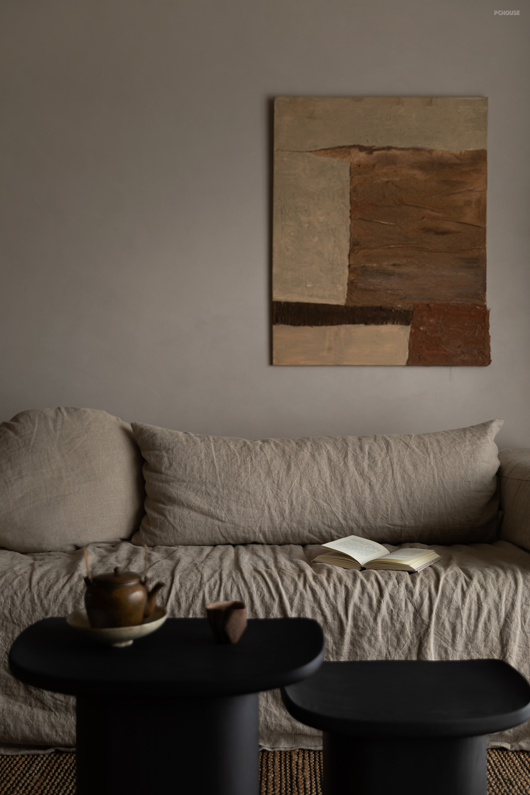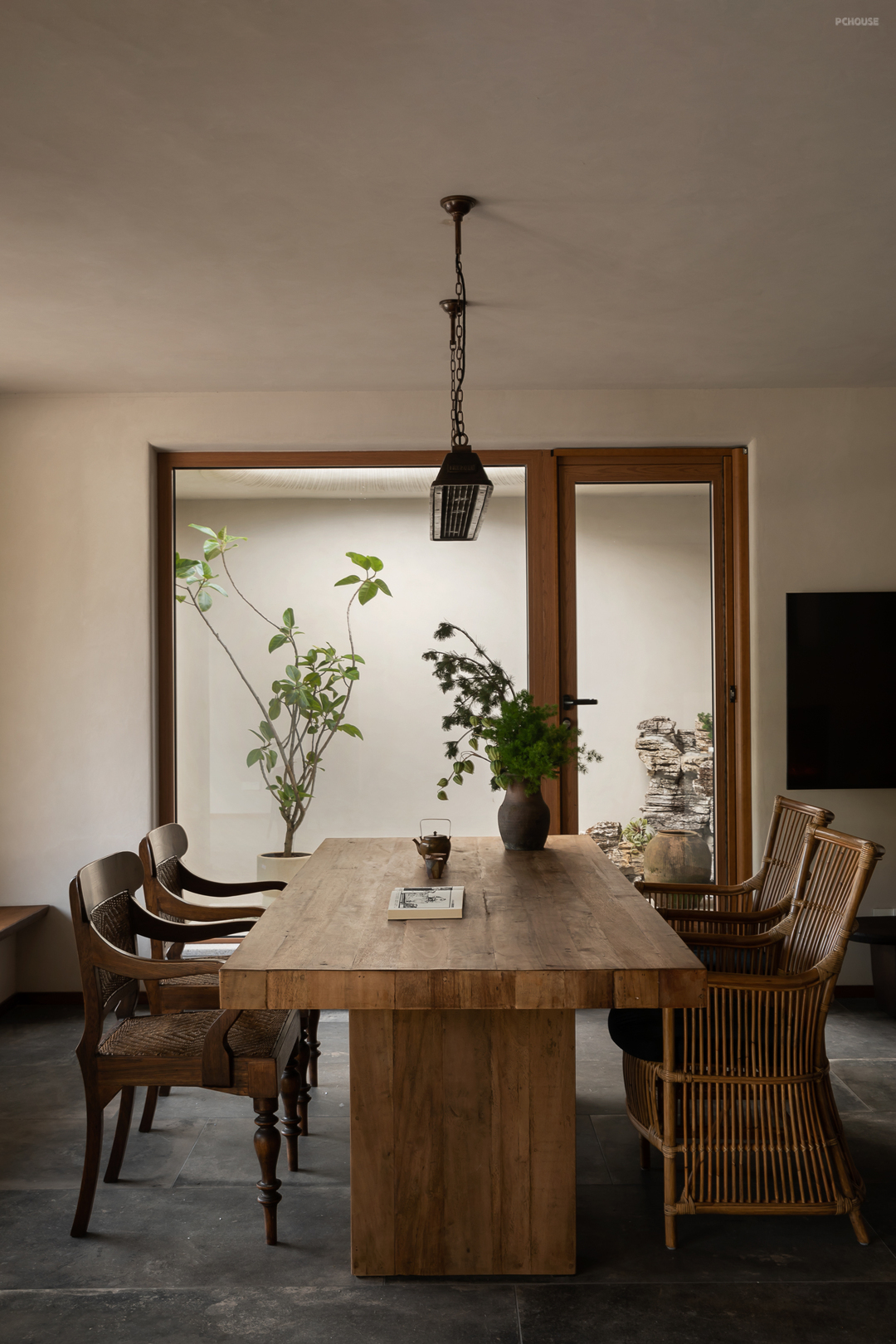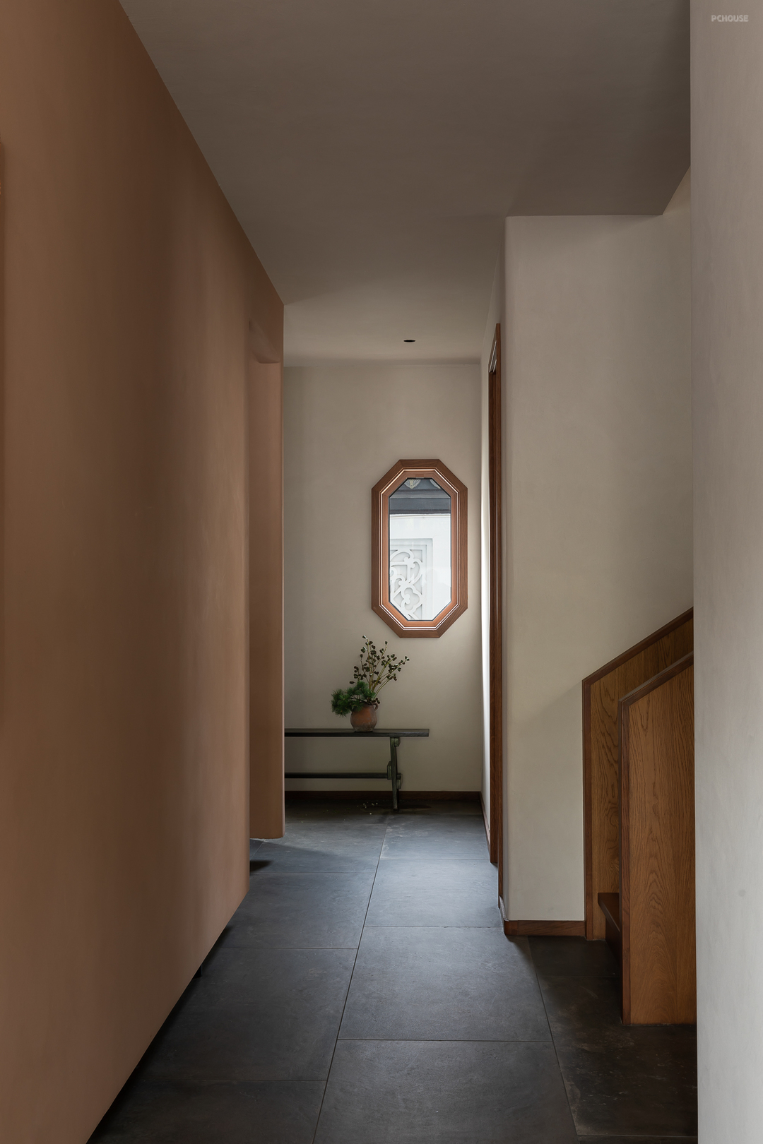 悬起的弧形玄关墙,柔和自然的曲度,娴雅而安全感满满地包裹住女主人阅读日常,垂灯插花,闲谈人生,好不惬意。而右手边,以一件硬木大餐台为视觉中心,聚拢起夫妇俩退休后的起居生活、利用壁炉衔接起不可隐藏的承重结构柱,再次以小曲度围合,形成一个单人沙发观影区方案。