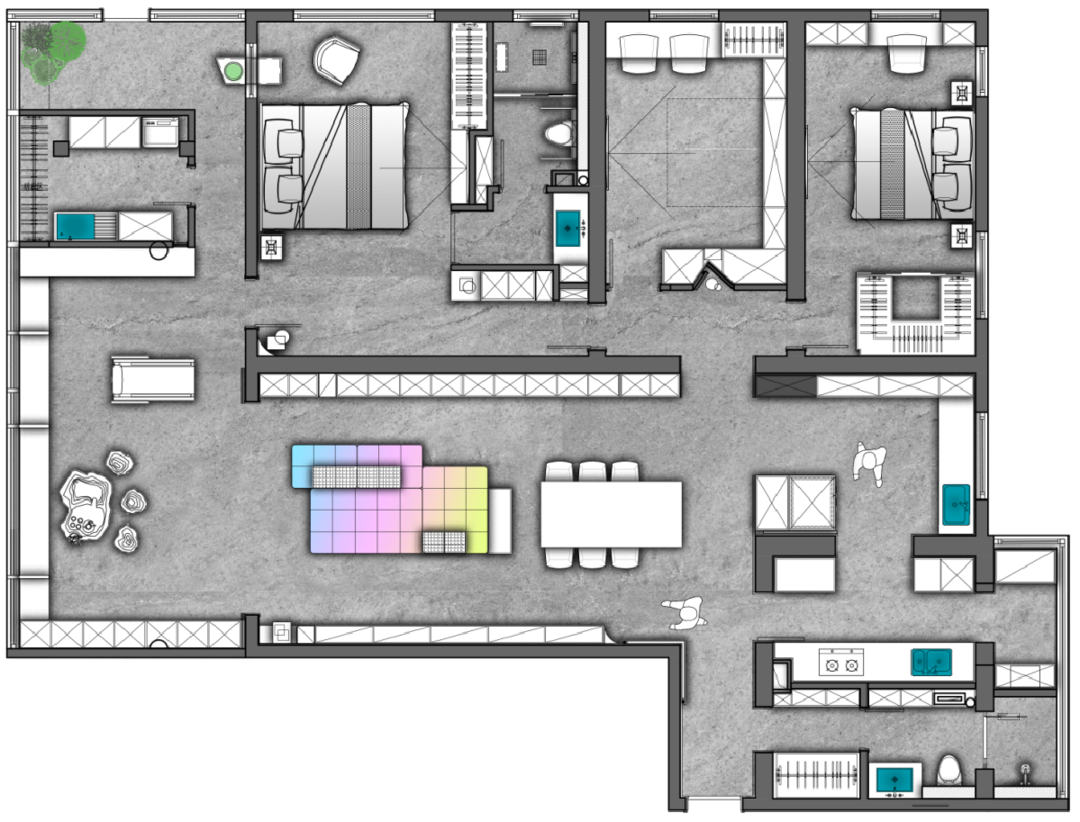 客厅除了常规的电视娱乐外,也考虑增设投影设备,将客厅变成家庭影院;或者安装游戏机,打造互动娱乐区。沙发由几个大体积的“体块”单元组合而成,呈现出几何形状的美感。以适应不同的空间布局和使用需求。可以根据不同场合的需求自由变换空间布局。,储物设计也应具备一定的扩展性,能够灵活调整和增加储物空间。