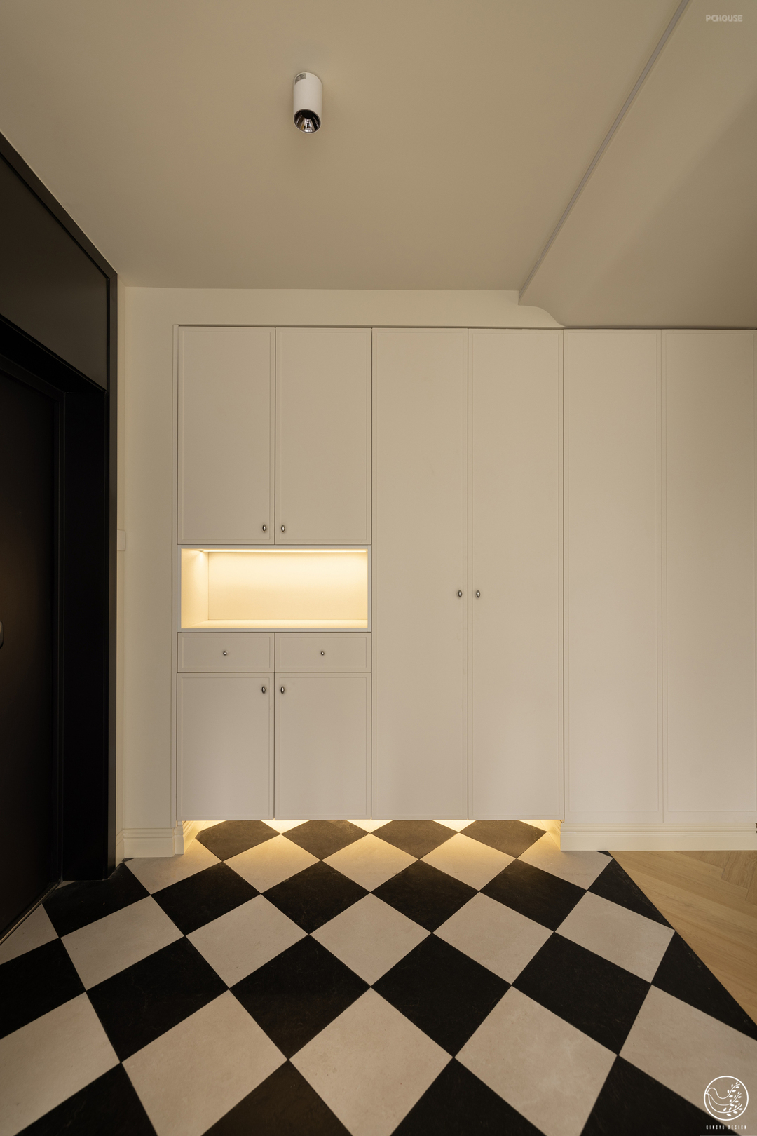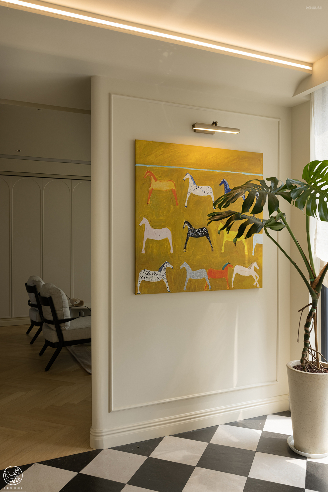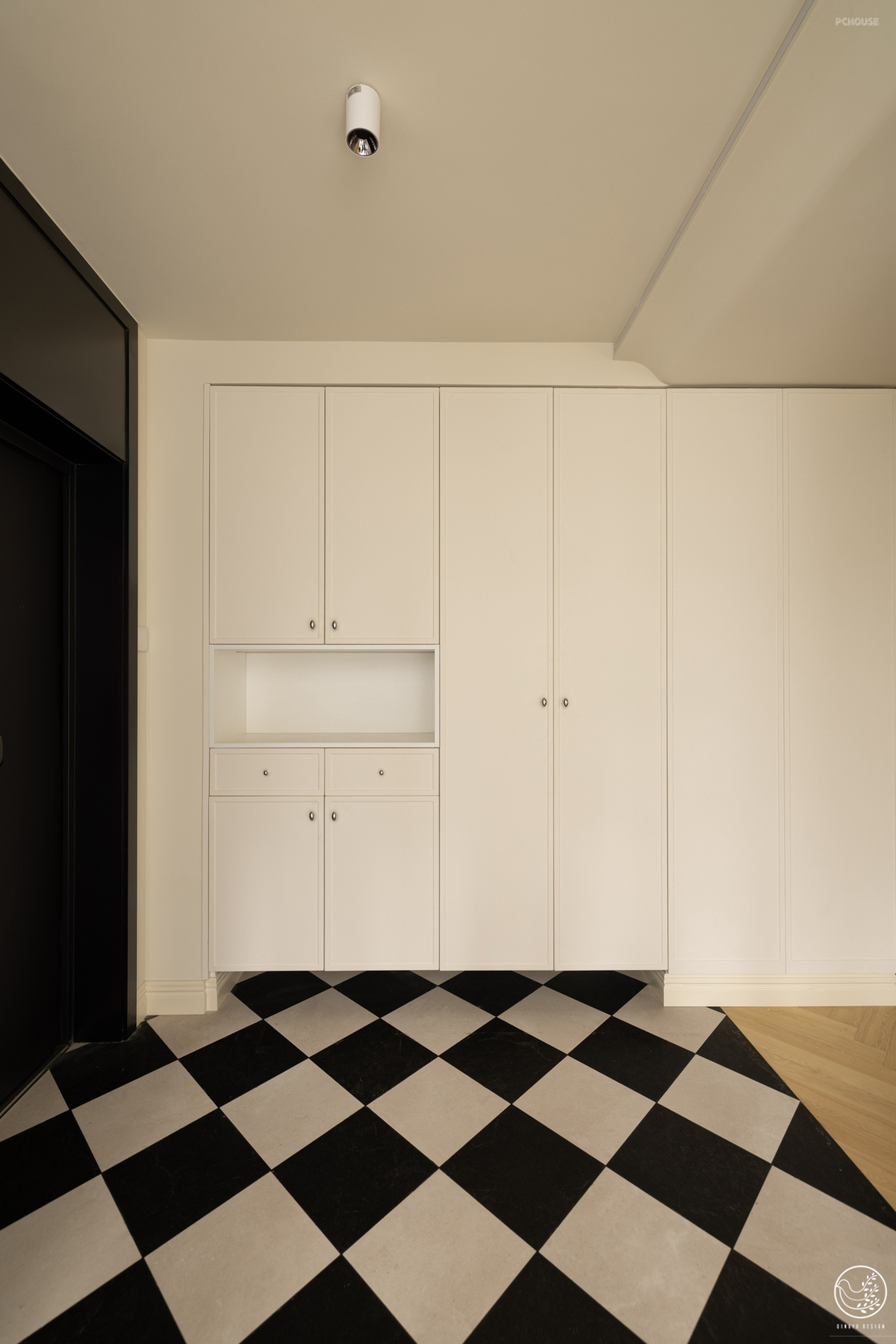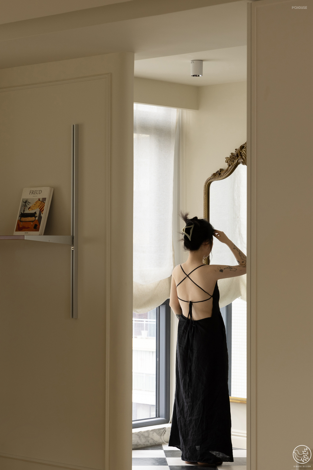 另一边装置了一个大大的法式落地穿衣镜,经典的黑白配色中点缀色彩鲜亮的挂画,让TA们一回家就能拥有“清清爽爽、轻轻松松”的空间享受。
