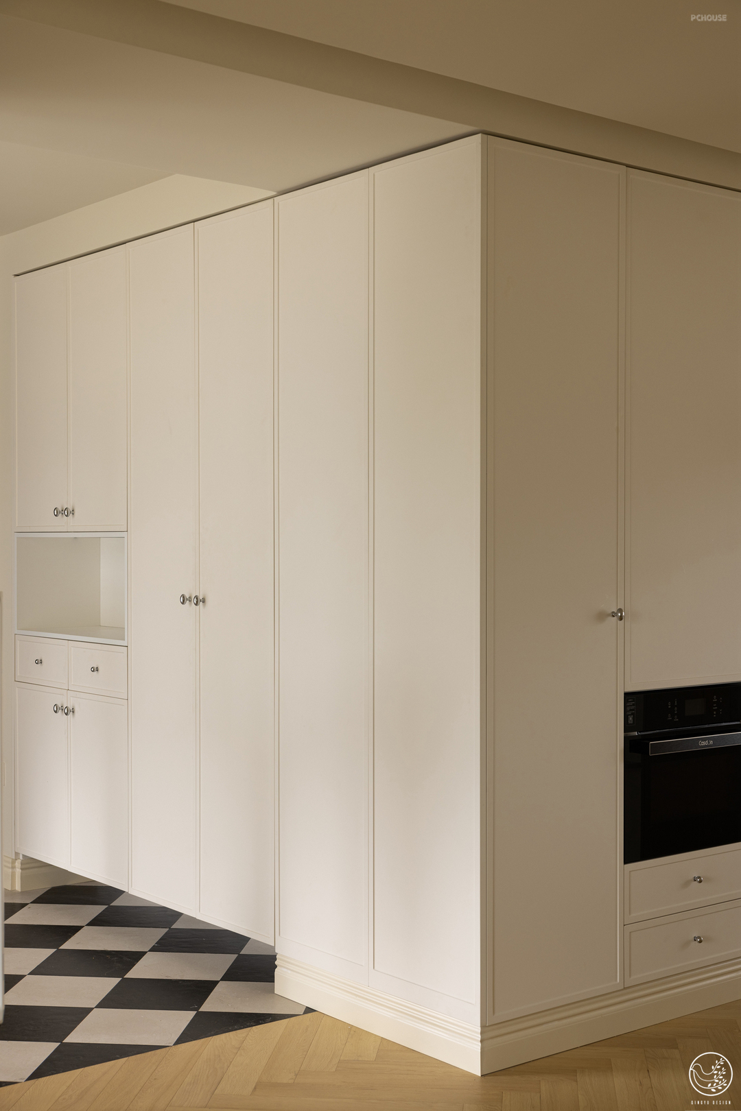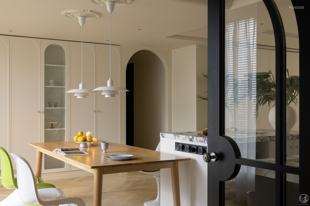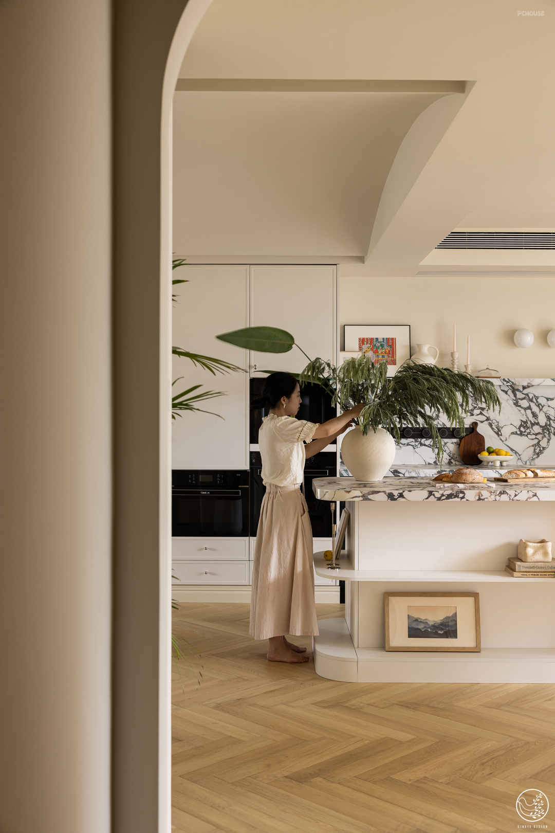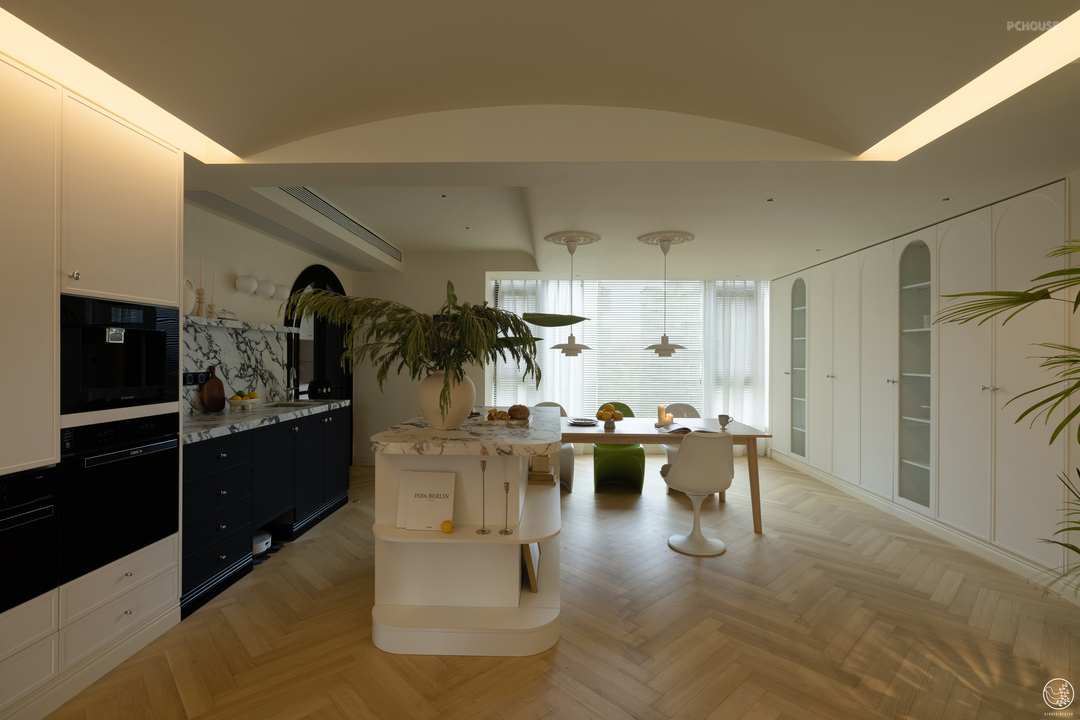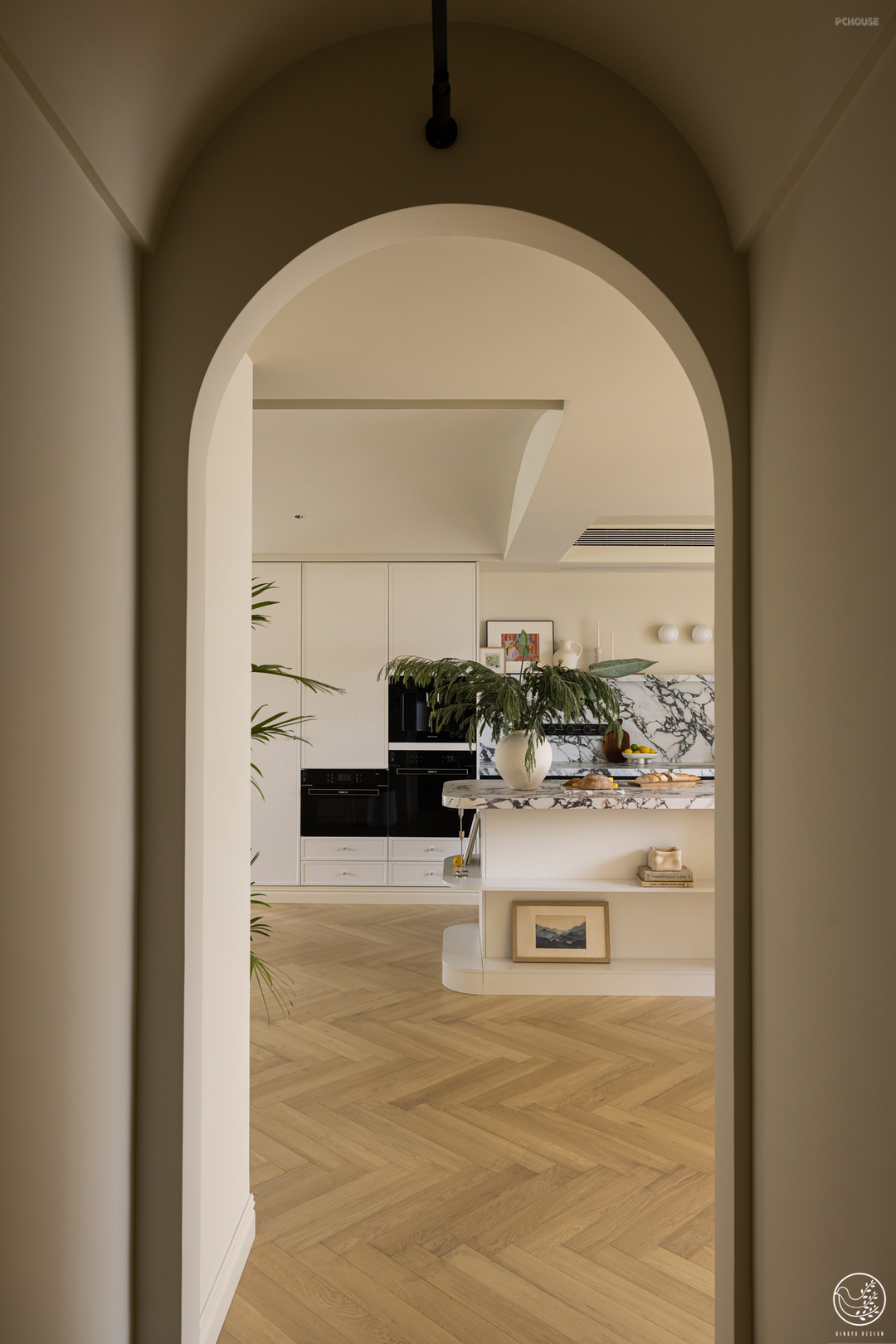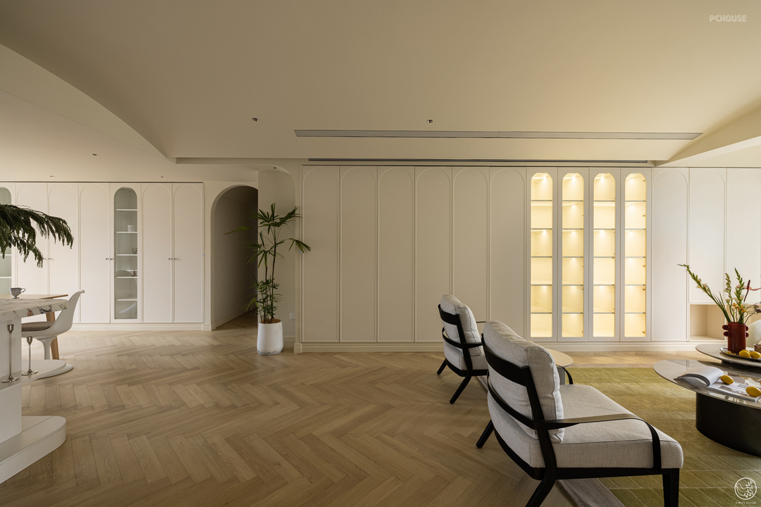 入户与餐厅、西厨区用地砖与地板的硬碰来做无障碍的空间功能分区。而立面则以材质、颜色、造型相同的柜门、护墙板、弧形墙面来做入户与客厅、西厨、餐厅的过渡与衔接。目的就是模糊掉公共区域里特别重的边界感,把它大平层的优势还原、凸显出来。
