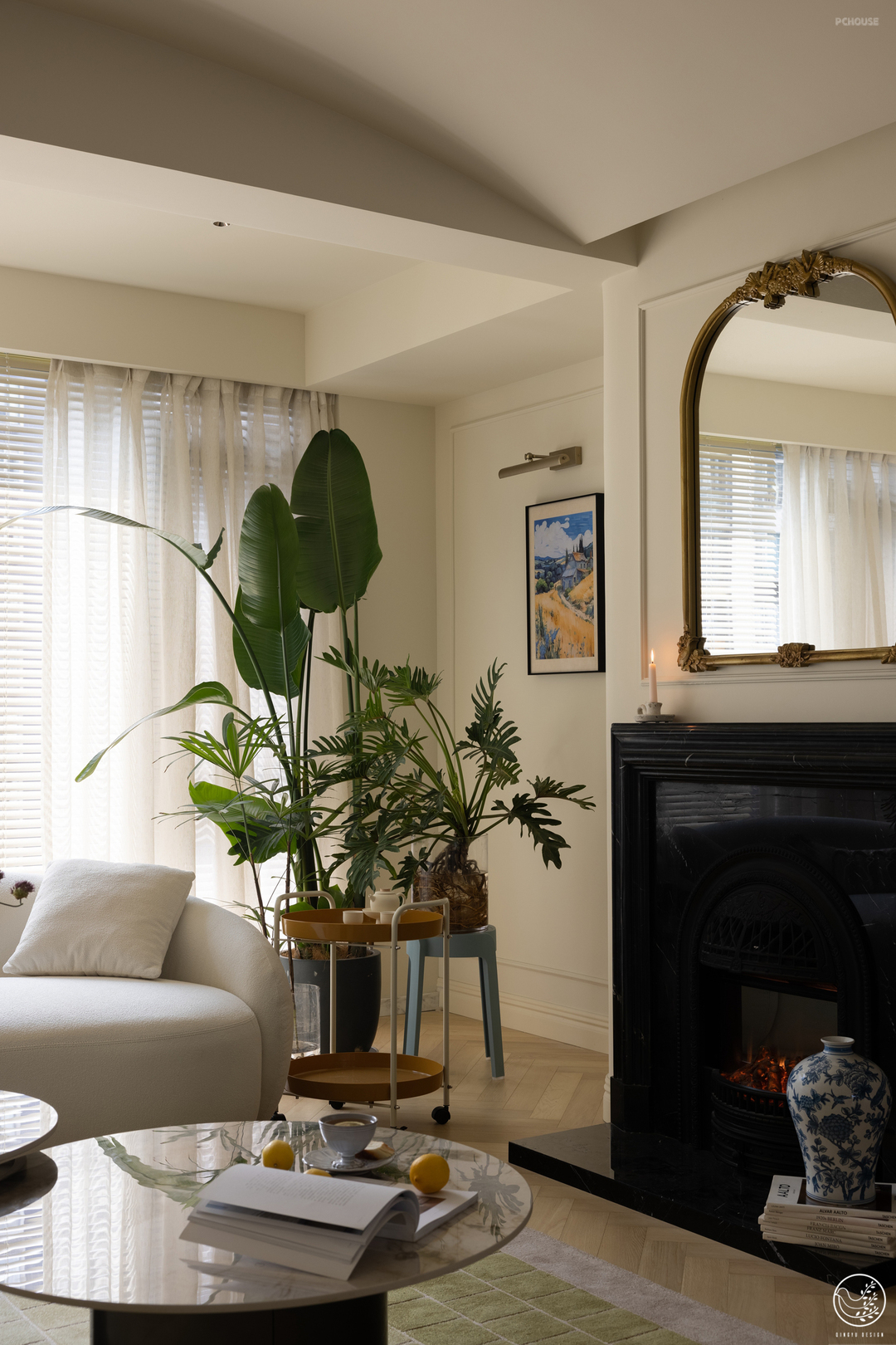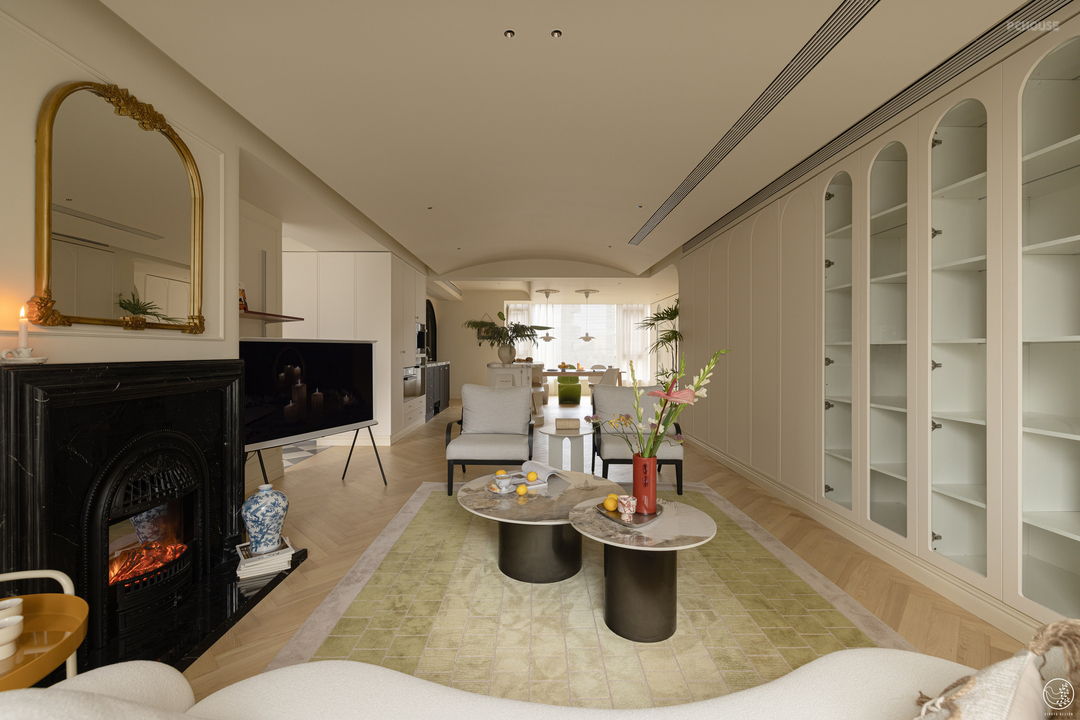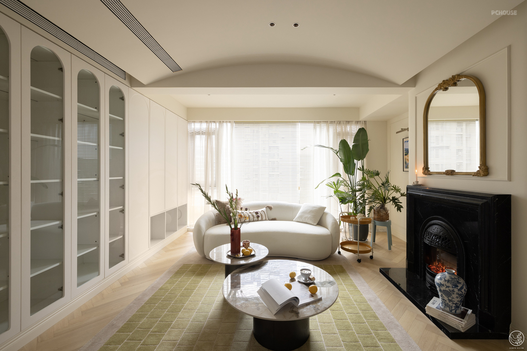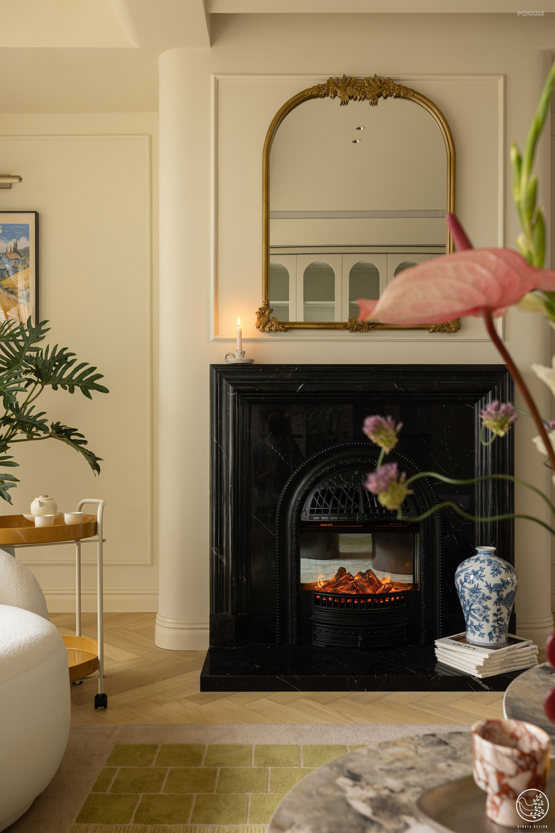 因为家里看电视的基本上只有外婆,设计中就采用了落地电视,使用起来更为方便,电视墙的设计便没有必要了。设计师就“顺势而为”地打造了一整面墙的收纳柜,另一边则用壁炉、法式铜镜的组合隐藏掉承重柱。如此,上下拱形元素的呼应,就衍生出来整个空间里全新的轻法式格调。