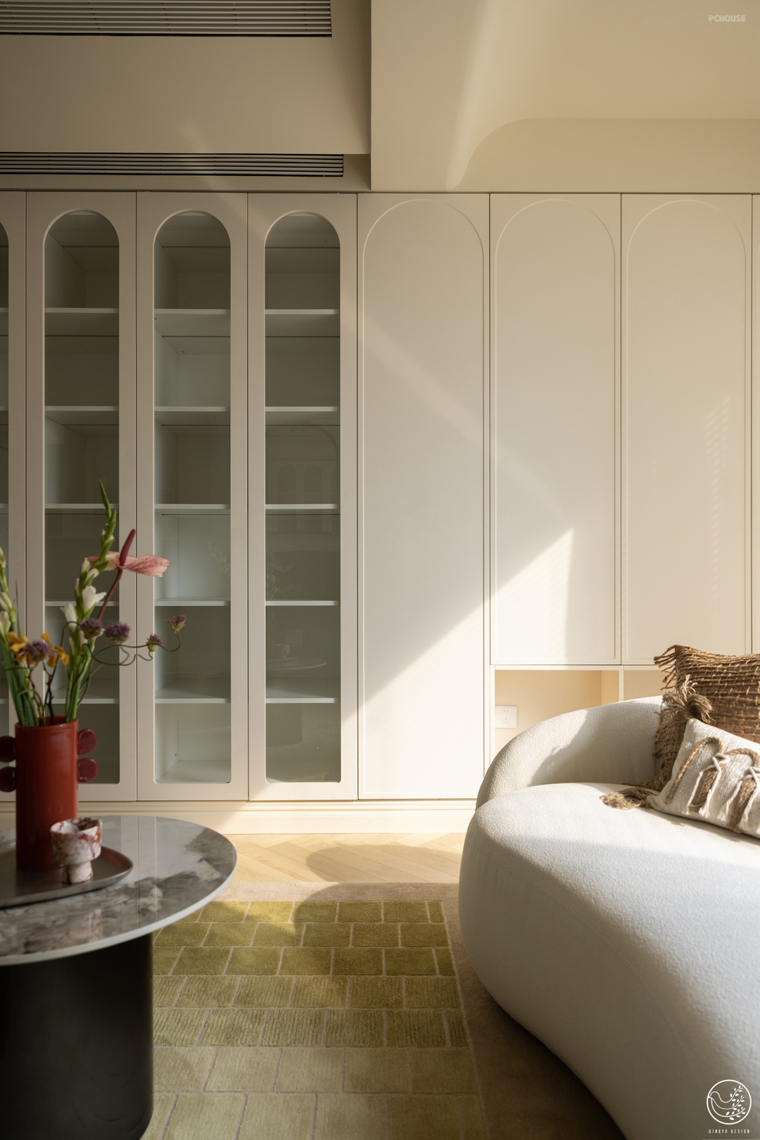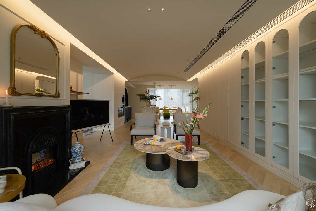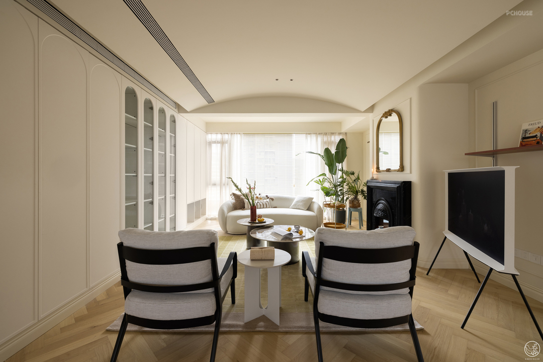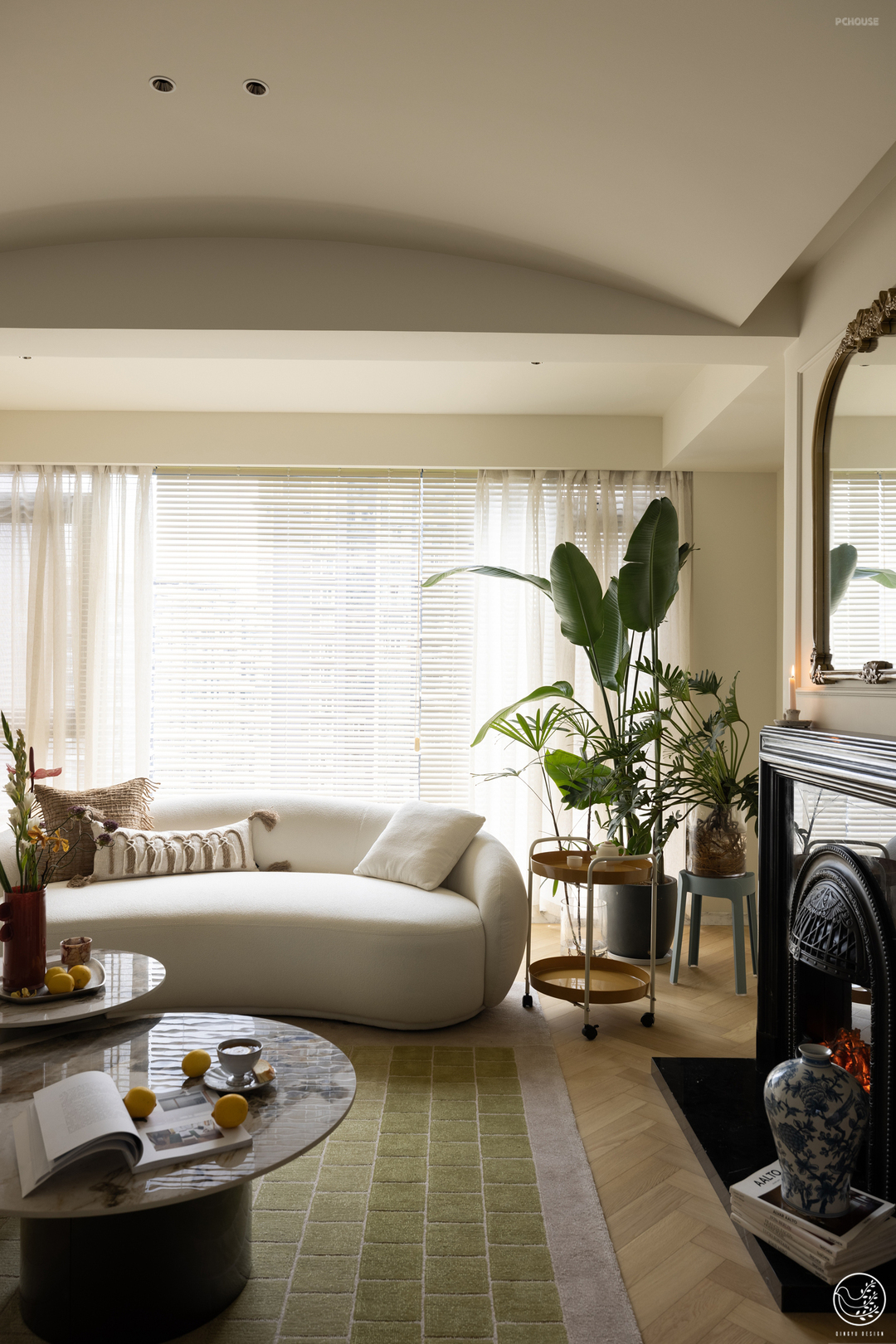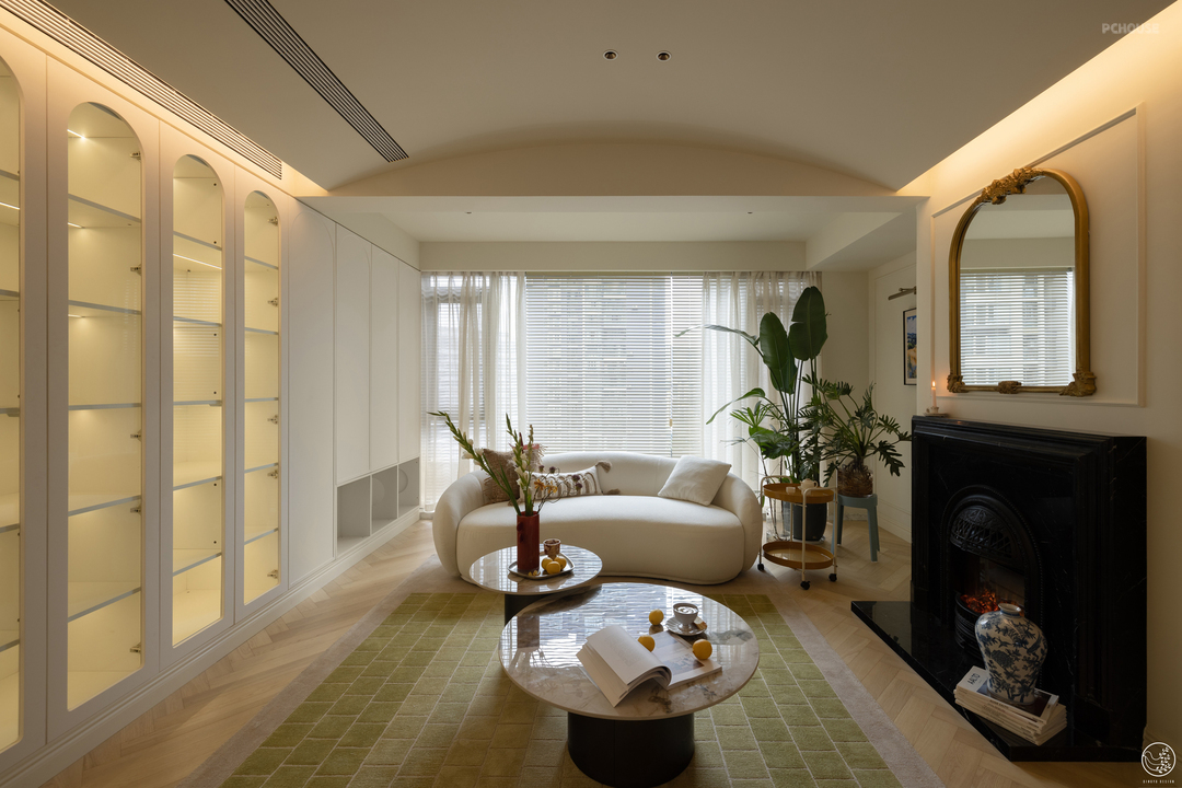 因为家里看电视的基本上只有外婆,设计中就采用了落地电视,使用起来更为方便,电视墙的设计便没有必要了。设计师就“顺势而为”地打造了一整面墙的收纳柜,另一边则用壁炉、法式铜镜的组合隐藏掉承重柱。如此,上下拱形元素的呼应,就衍生出来整个空间里全新的轻法式格调。