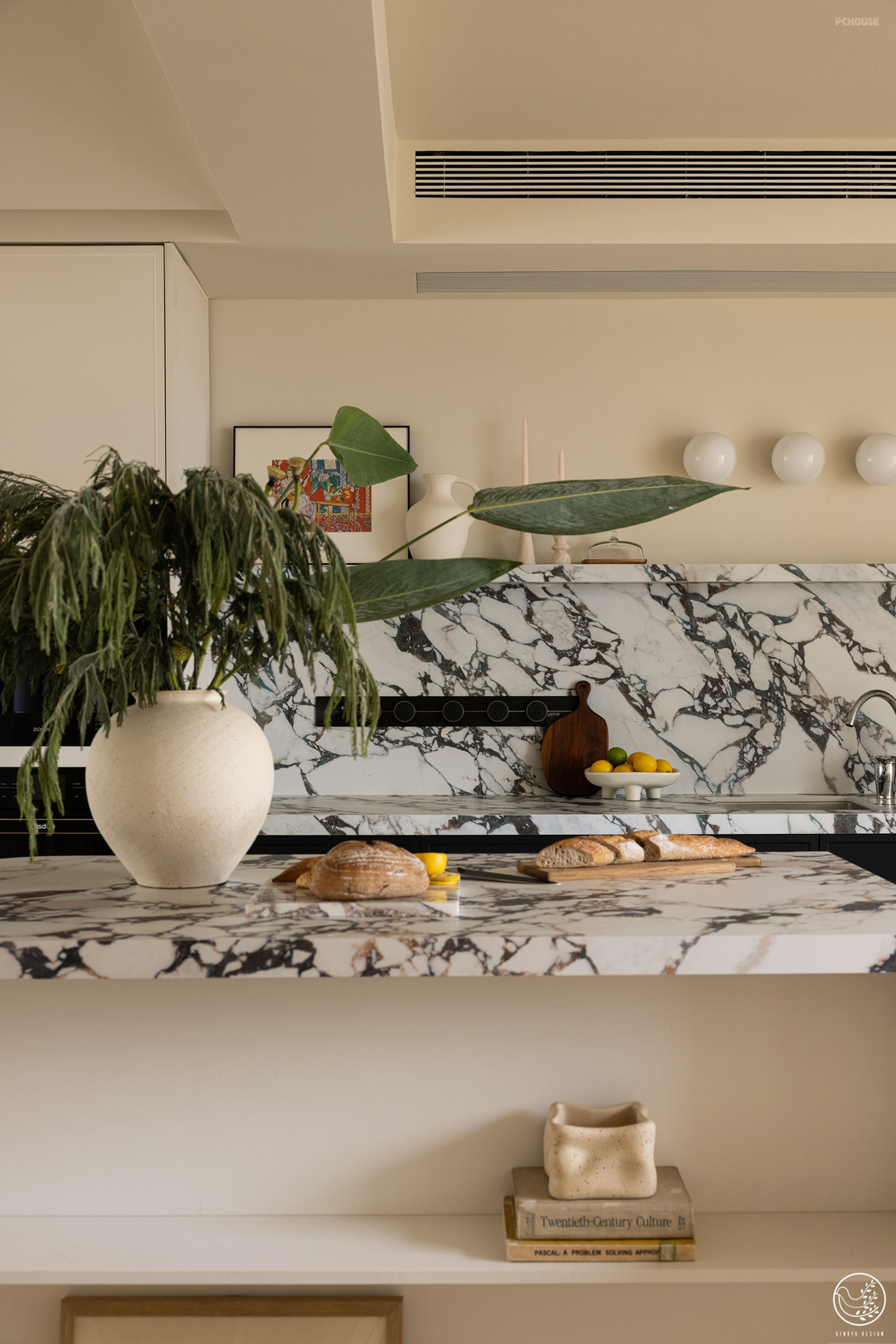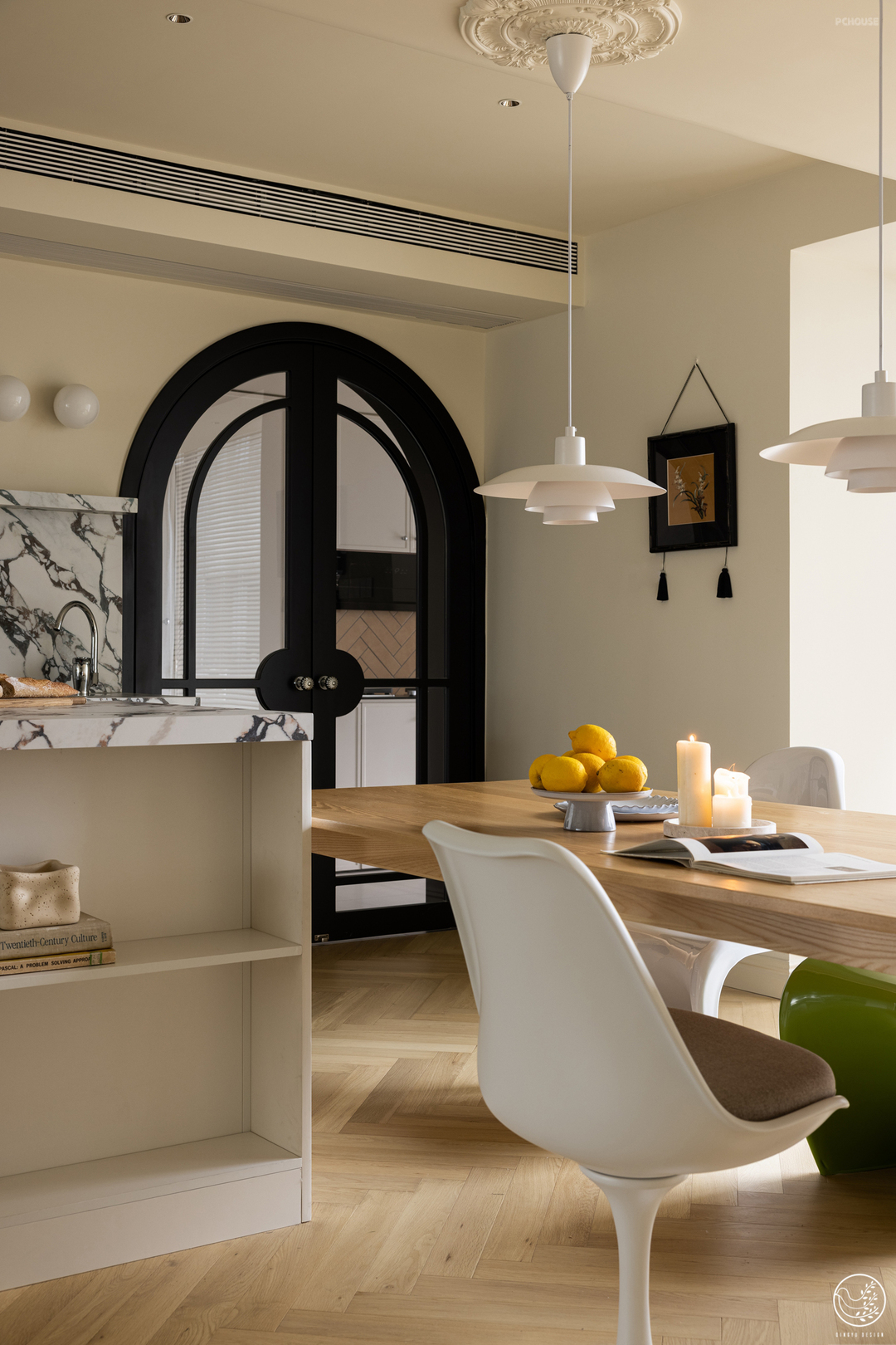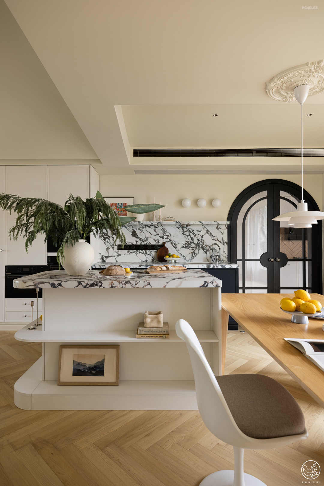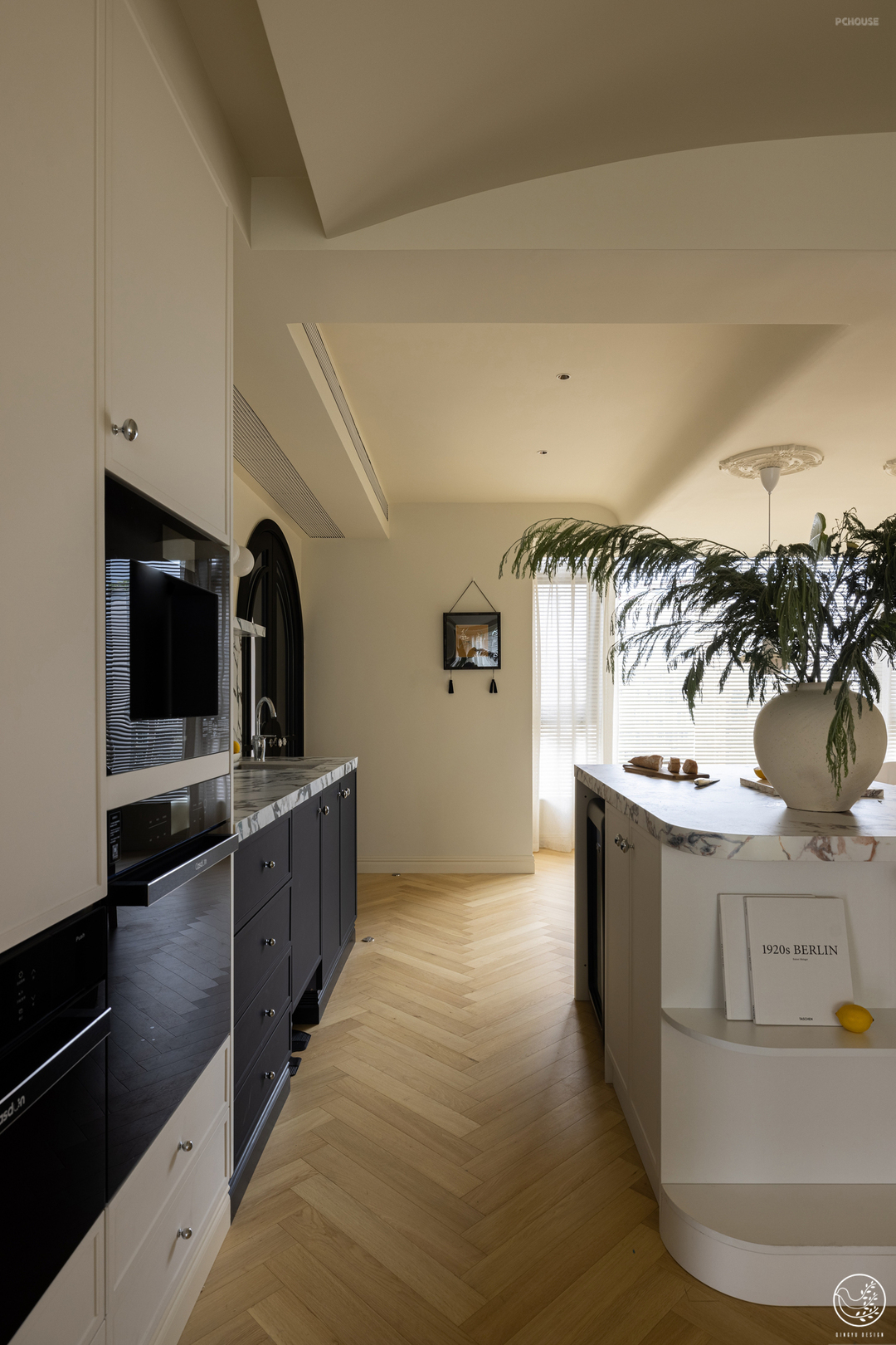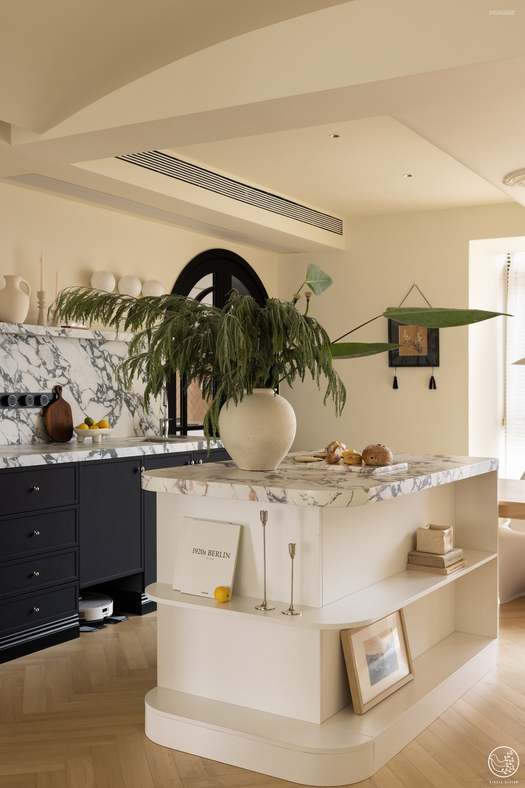 宝格丽花纹的岩板搭配黑色橱柜和人字拼的地板;加之顶面的梁很多,设计师做了诸如弧形造型、包梁等细节的设计,让整个开间看上去更宽、更开阔的同时,也让空间里的法式风情更加浓郁了。