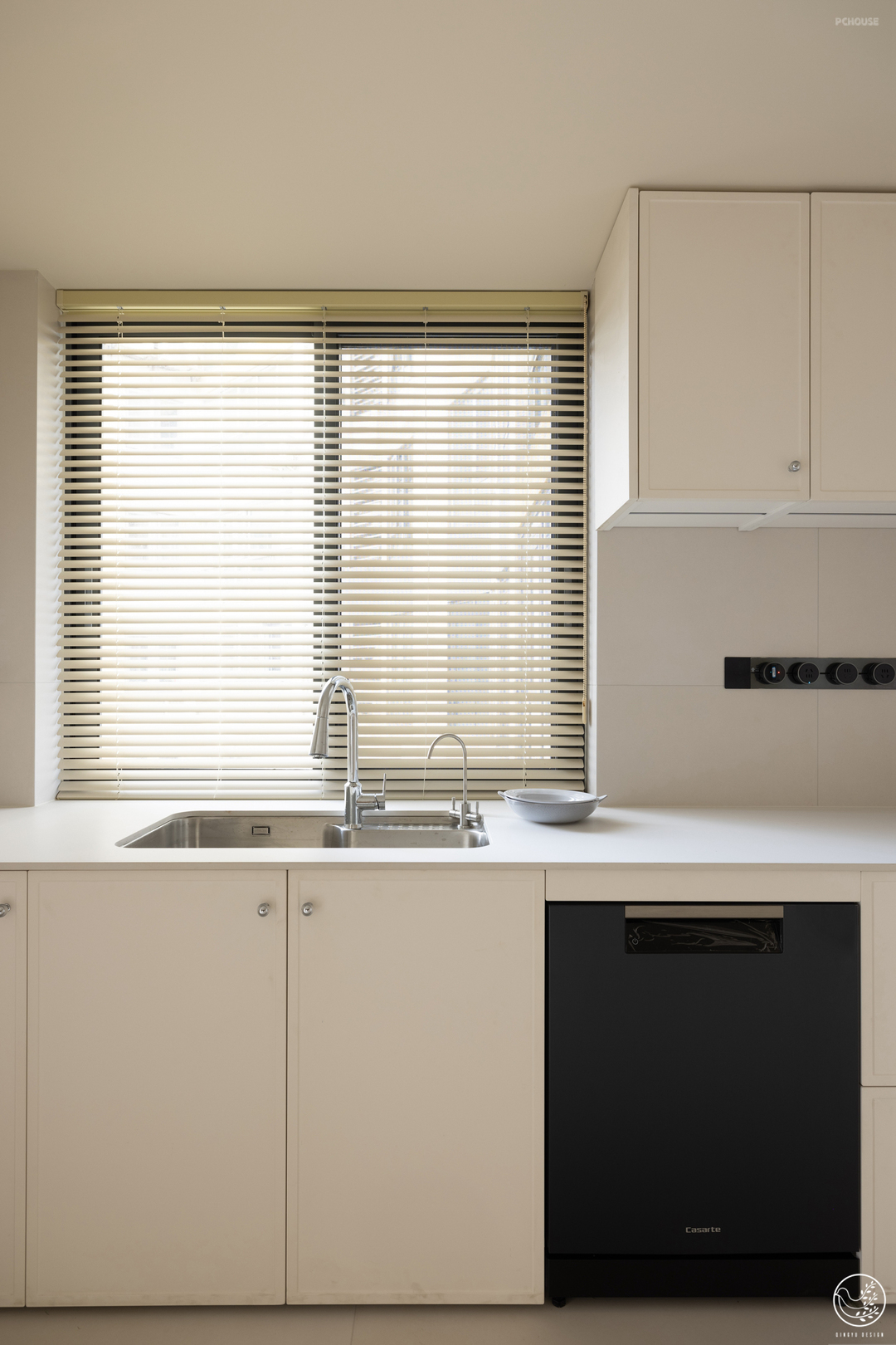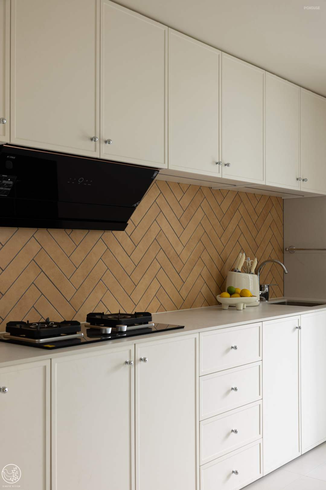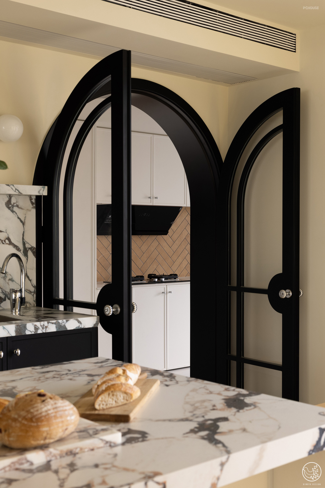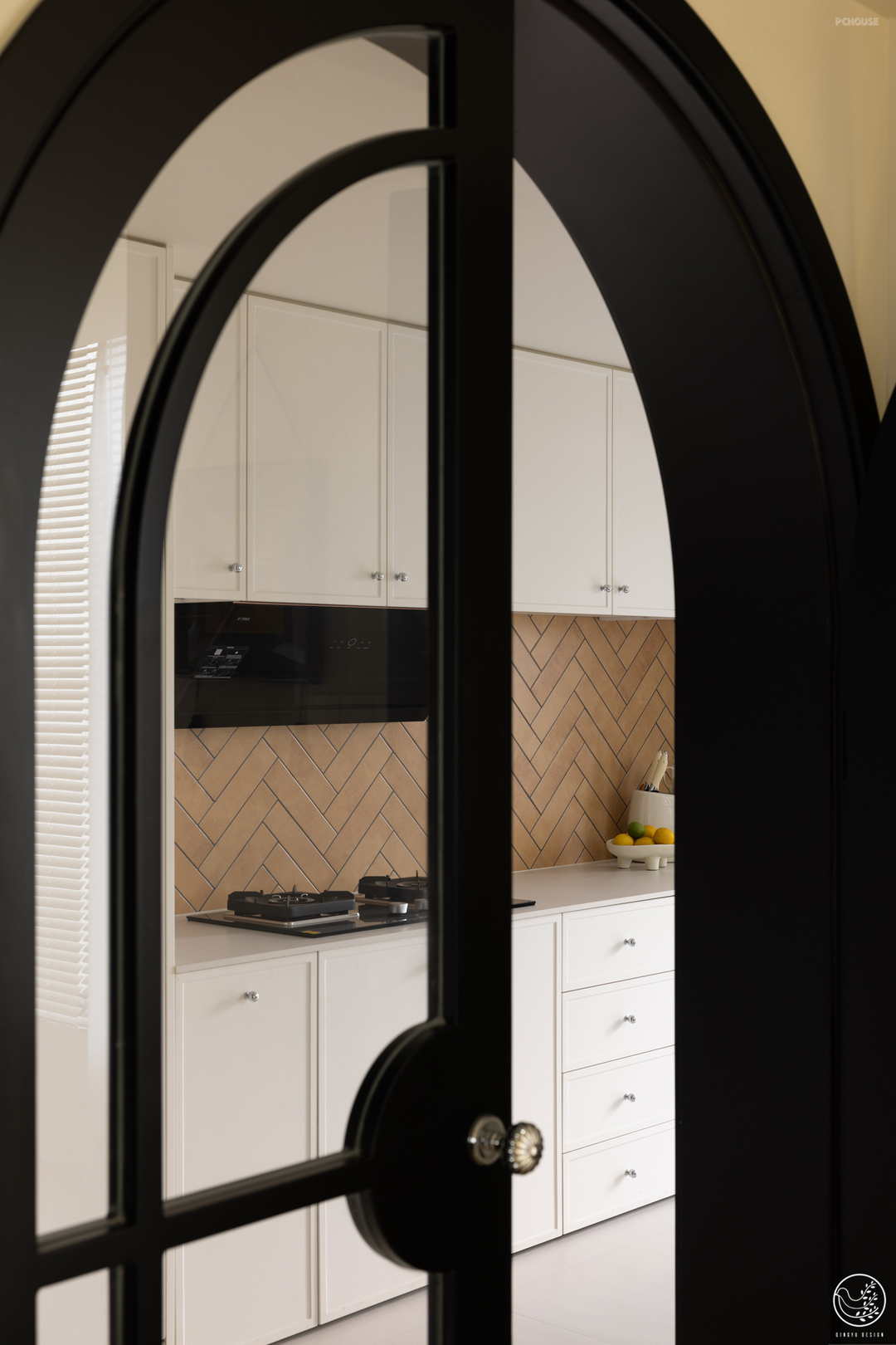 把厨房与生活阳台联通后,采光与通风都达到了next level。拱形的玻璃双开门、人字拼的墙砖、干净简洁的配色,也让空间格调有了本质的改变。