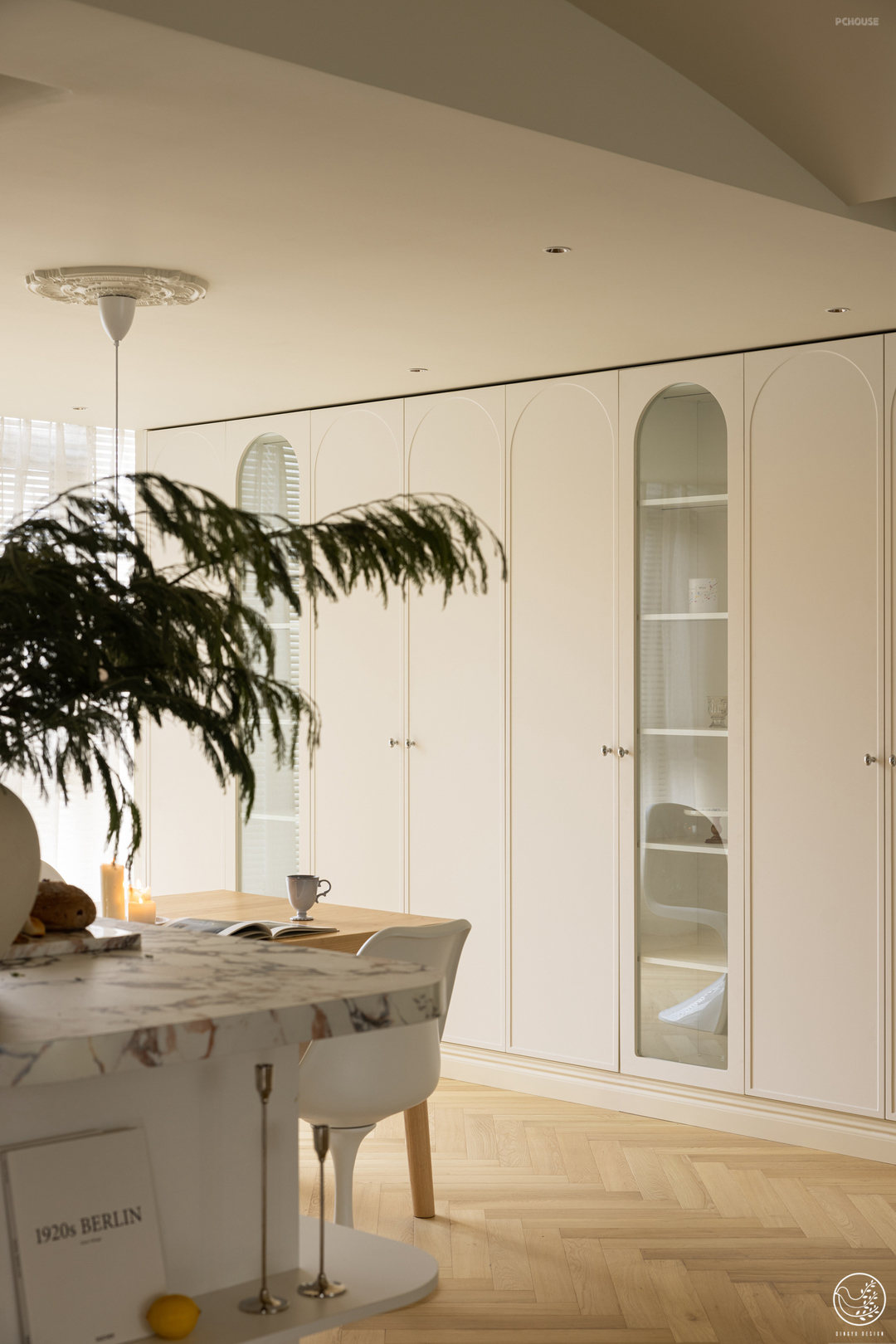 不光是客厅的收纳柜搭配有玻璃柜门,餐厅里利用与老人房共用的隔墙打造的一整面柜子,也做了相同处理。还设置了一些开放式的置物区,放上好看的杯杯盏盏,又是一抹独有的装饰。当然,这样虚实结合的设计无论是用在哪里,都是希望让空间不那么死板。