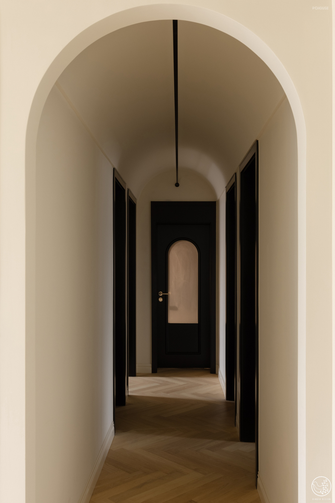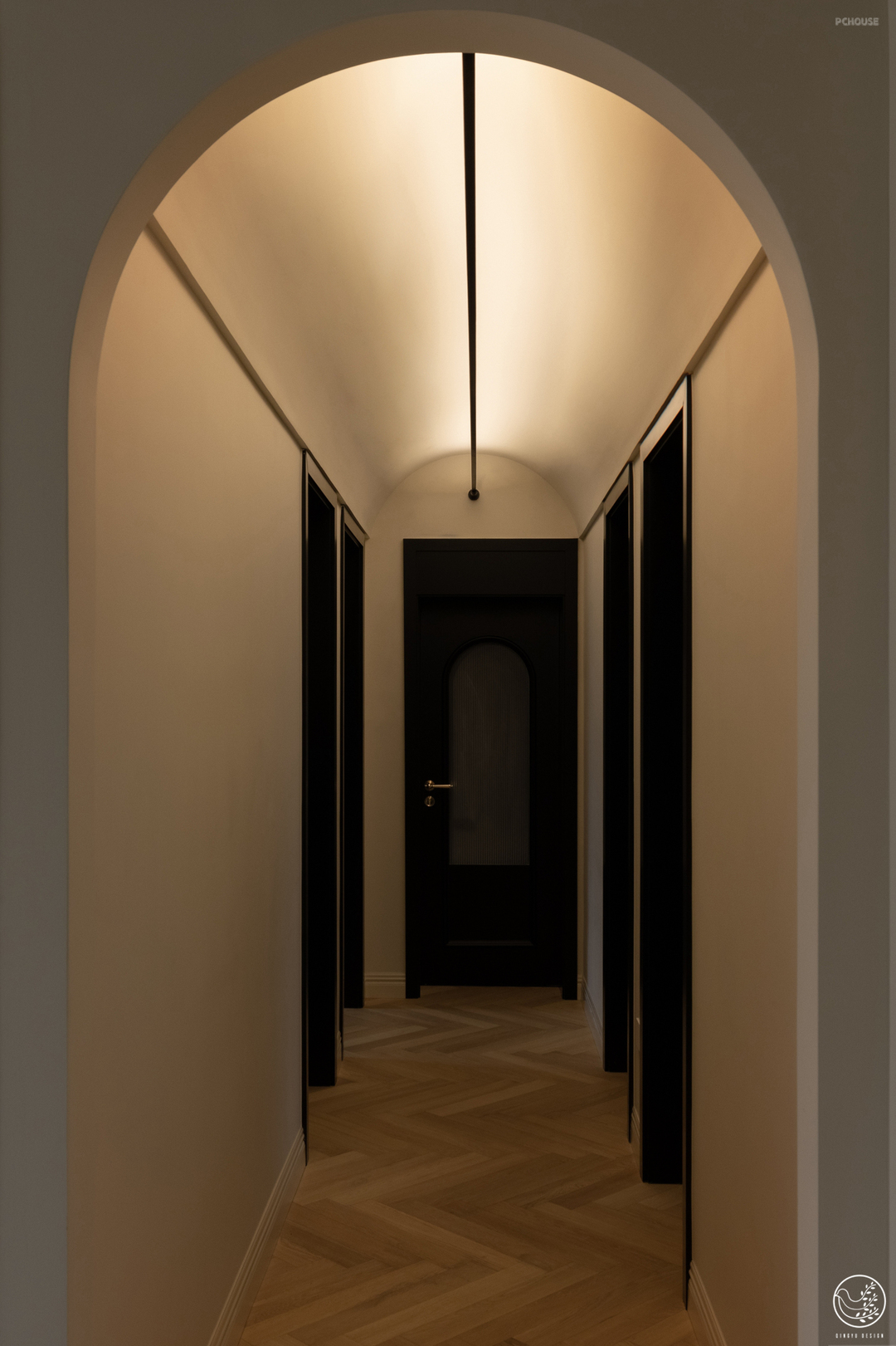 在走廊的尽头,是次卫生间的门,原本很低,但是因为拱顶拉高了整体的空间视觉高度,设计师就加了点小心思,做了一个假门板,增加在原来的门套上方,最终才得以这样统一的呈现效果。