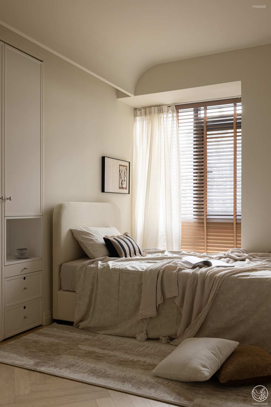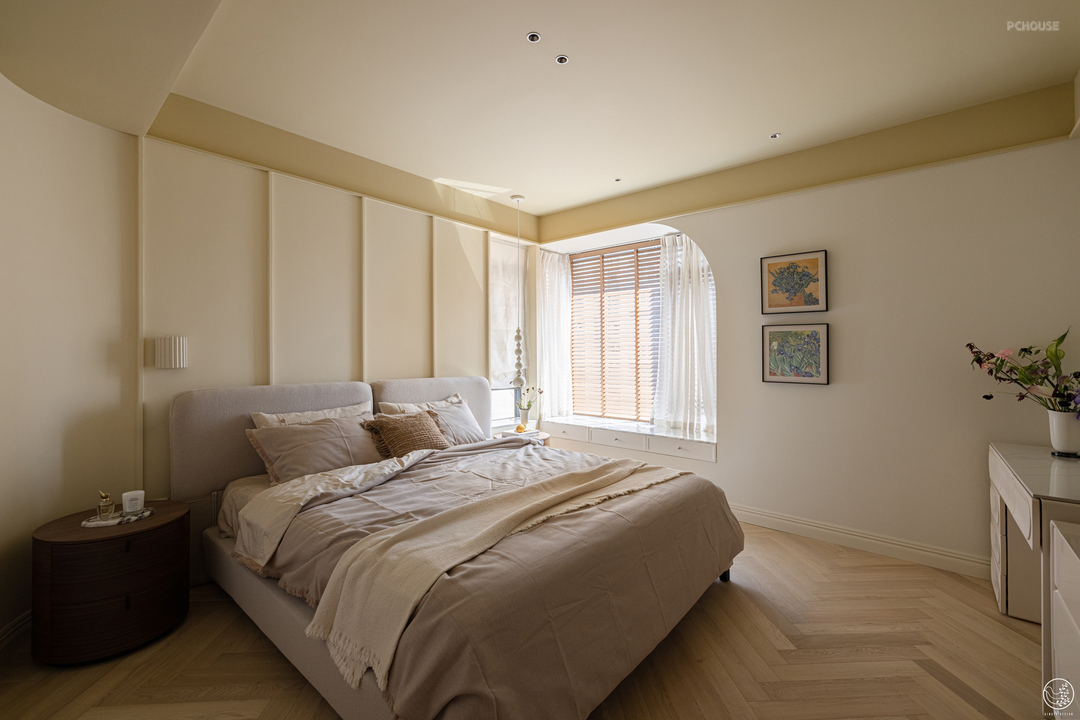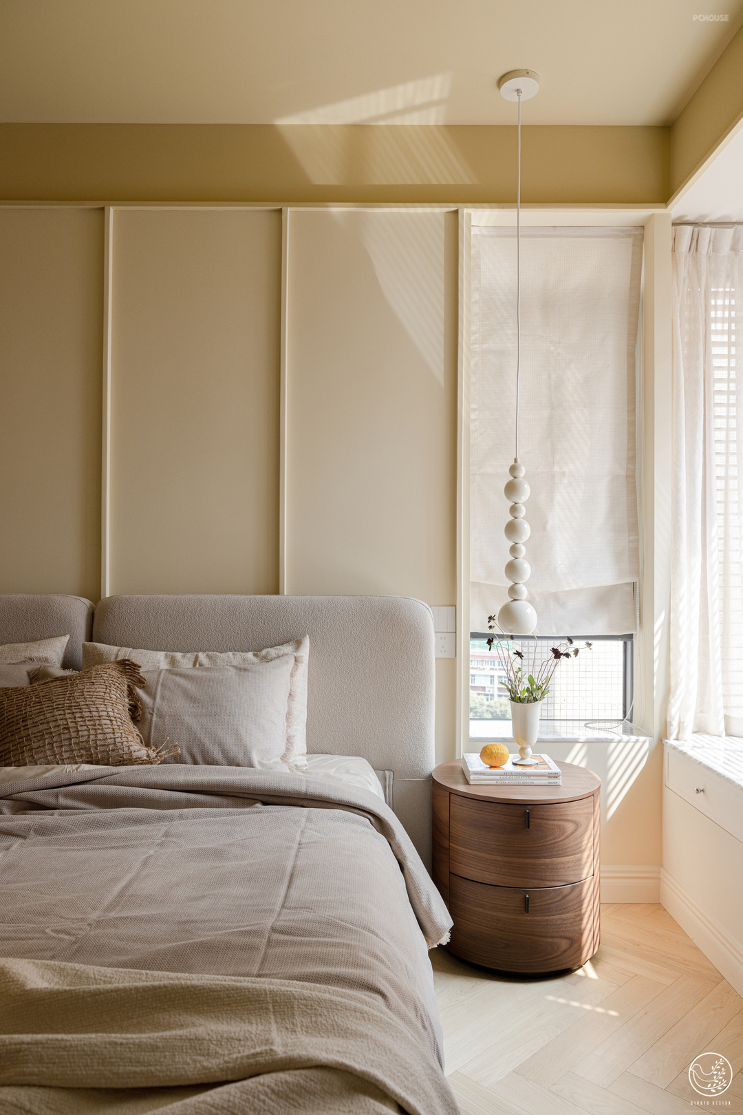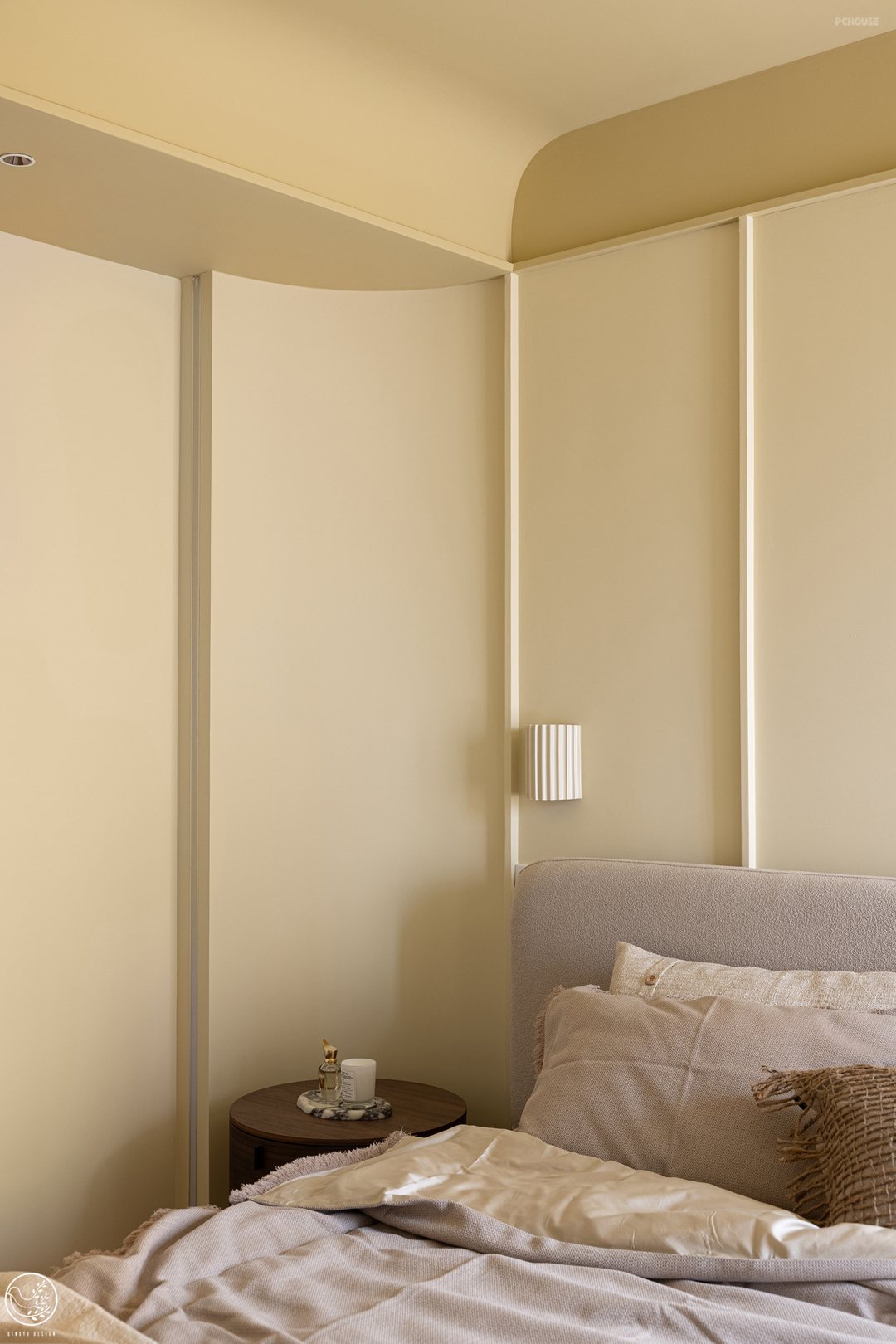 因为女主人张老师给设计师宋夏的第一印象就是温温柔柔的,加上她是一个牙医,平时工作忙、神经也常常处于紧绷的状态,就想为她创造一个放松的环境。充分考虑过后,主卧室除了延续客厅轻法式的浪漫格调,配色也用了更加自然、温柔的奶黄色。