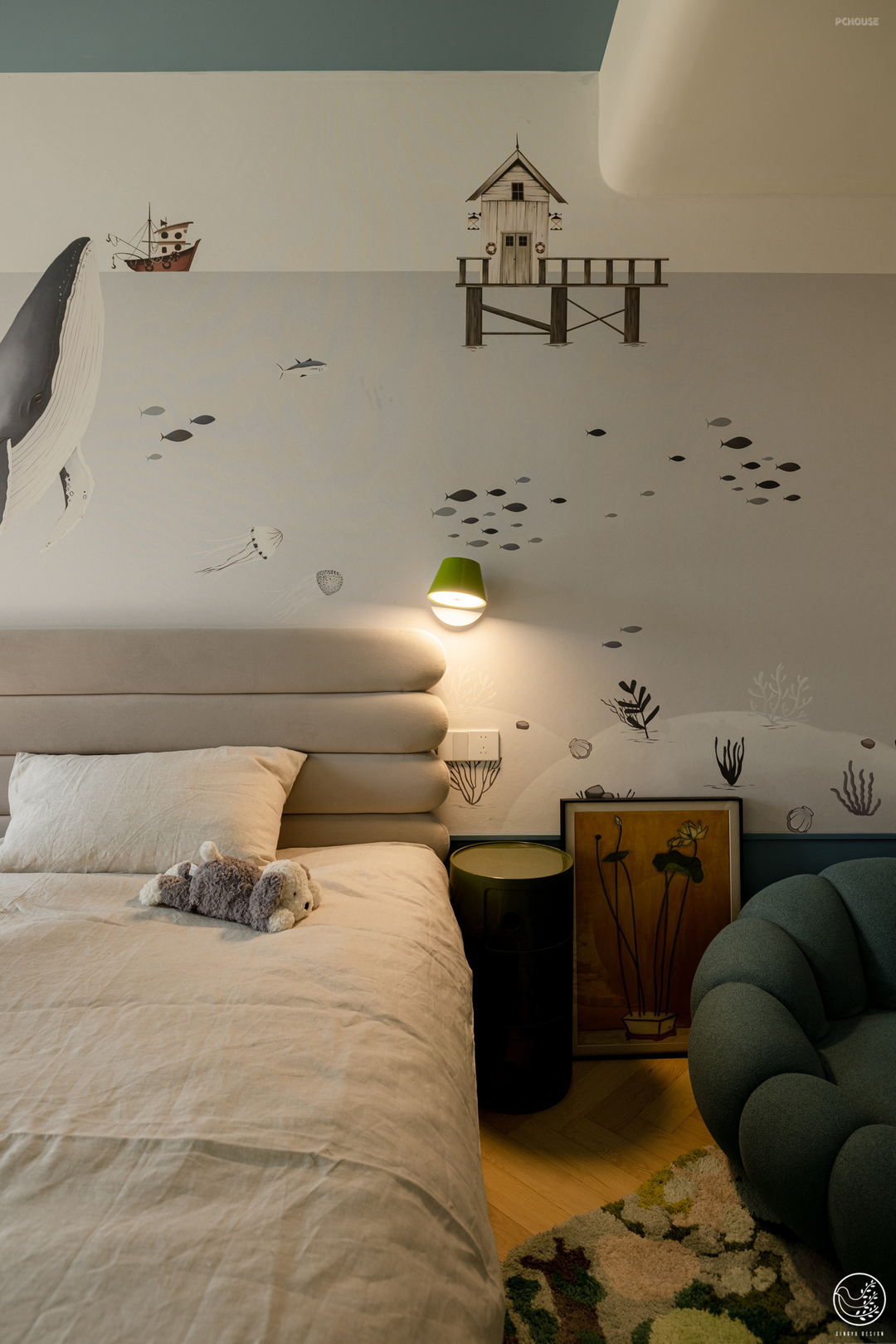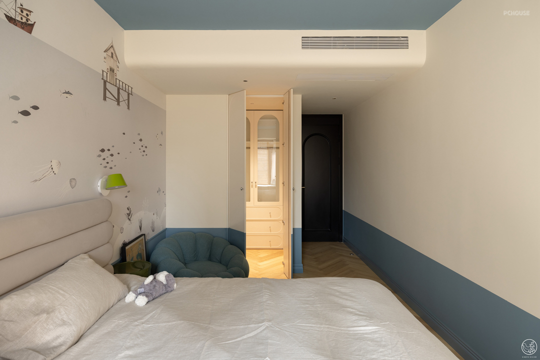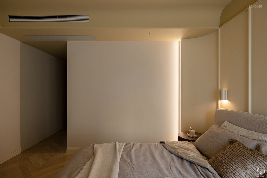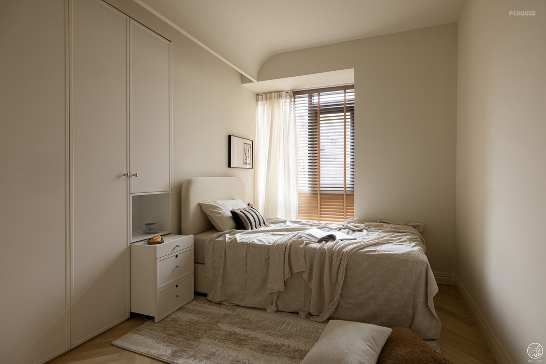 因为女主人张老师给设计师宋夏的第一印象就是温温柔柔的,加上她是一个牙医,平时工作忙、神经也常常处于紧绷的状态,就想为她创造一个放松的环境。充分考虑过后,主卧室除了延续客厅轻法式的浪漫格调,配色也用了更加自然、温柔的奶黄色。