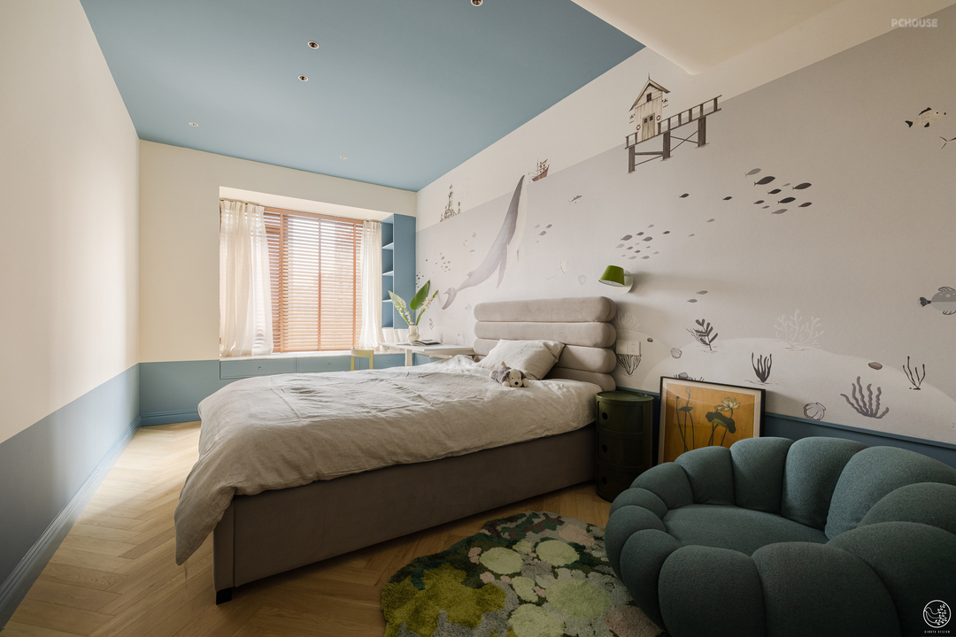 弟弟因为才考上初中,在家里住的时间更多,并且还得在家里待个六七年,所以在本次改造中,设计师把这个小卧室和它连接的储藏室打通成了一个大的房间。
