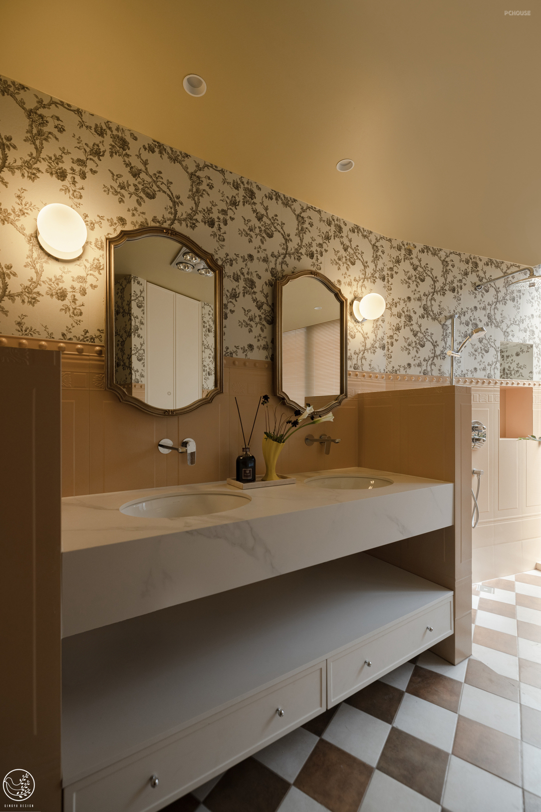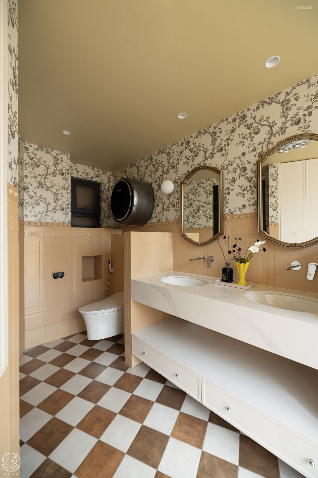 新升级后的主卫生间,设计师为夫妇俩安排了四分离的双台盆、淋浴、浴缸、马桶。