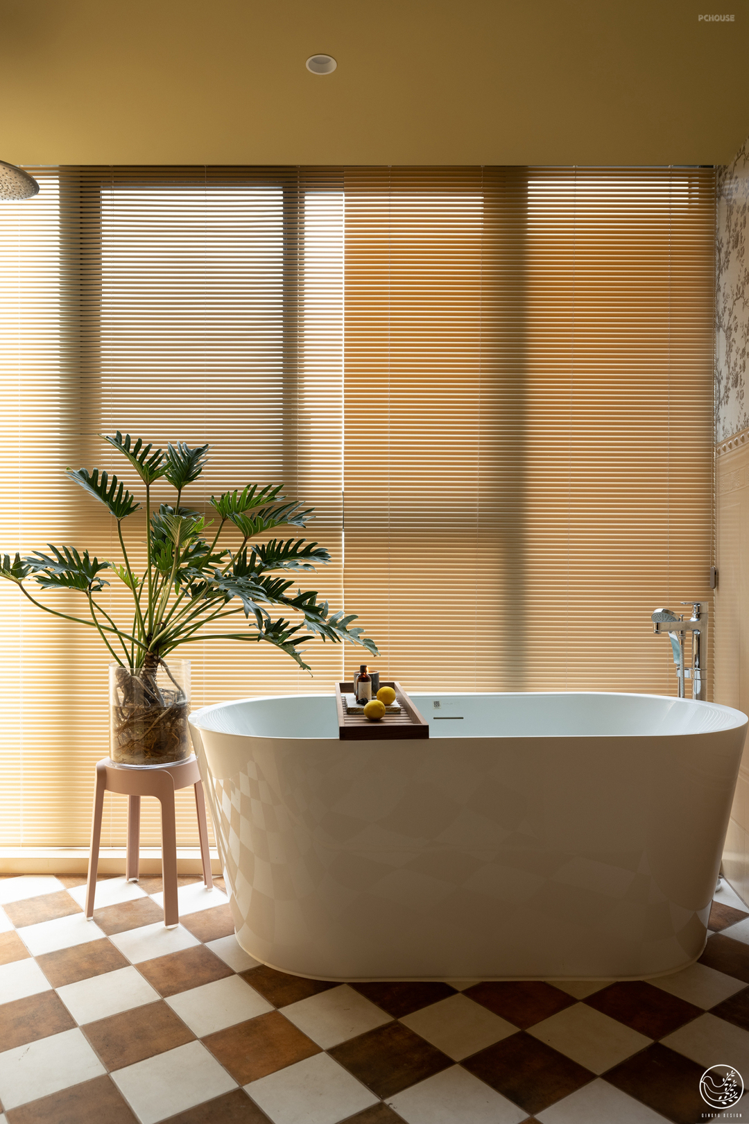 用焦糖色系的配色延续卧室里的自然温柔,配上花卉墙砖,更多了一些异域度假空间的松弛感。在这里泡个澡,也许会在将来成为TA们生活中极为美妙的小事之一吧。
