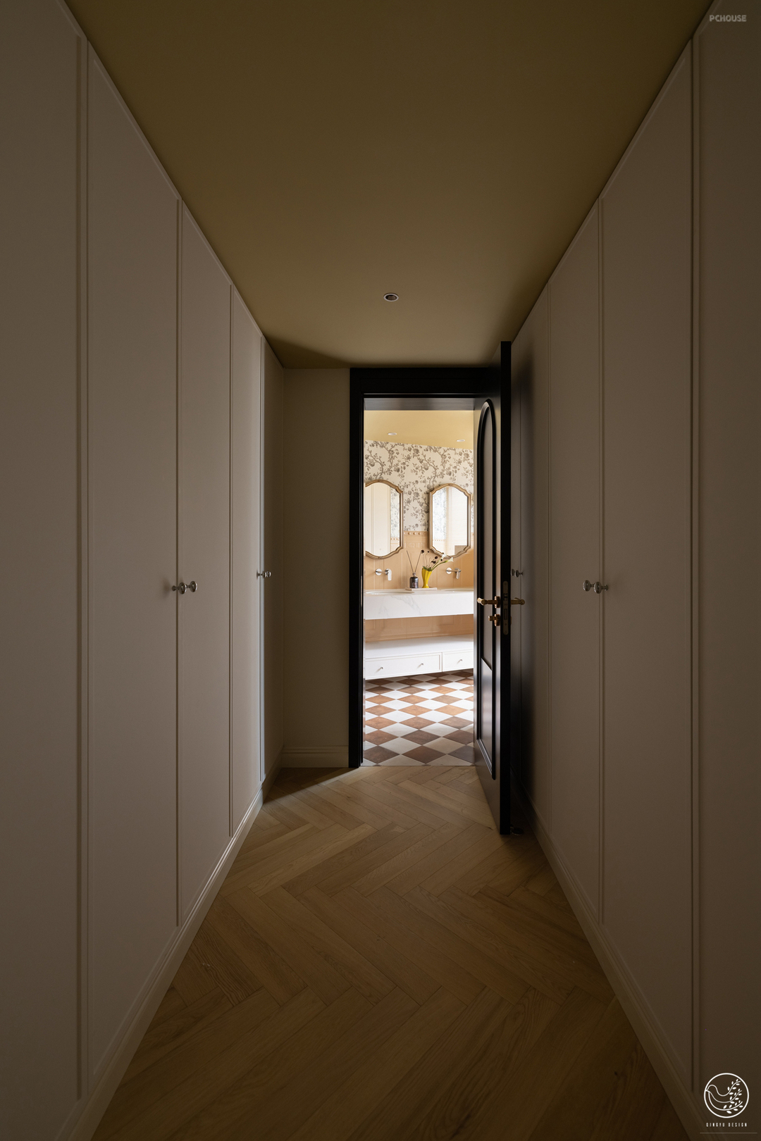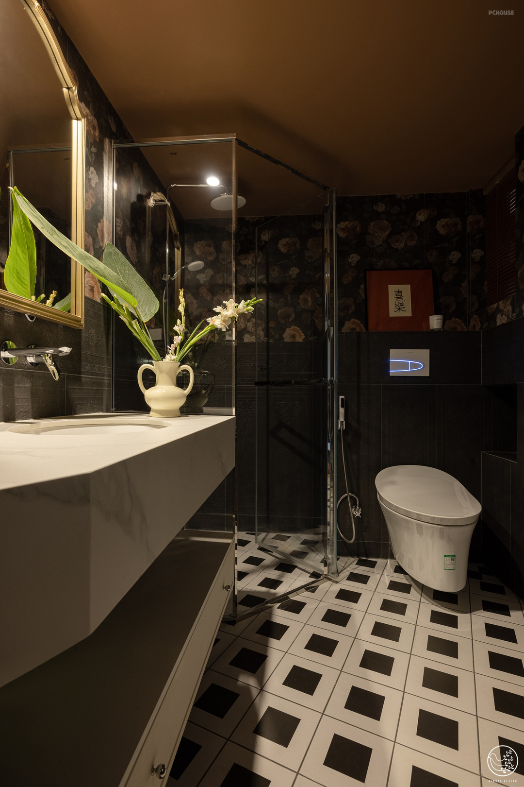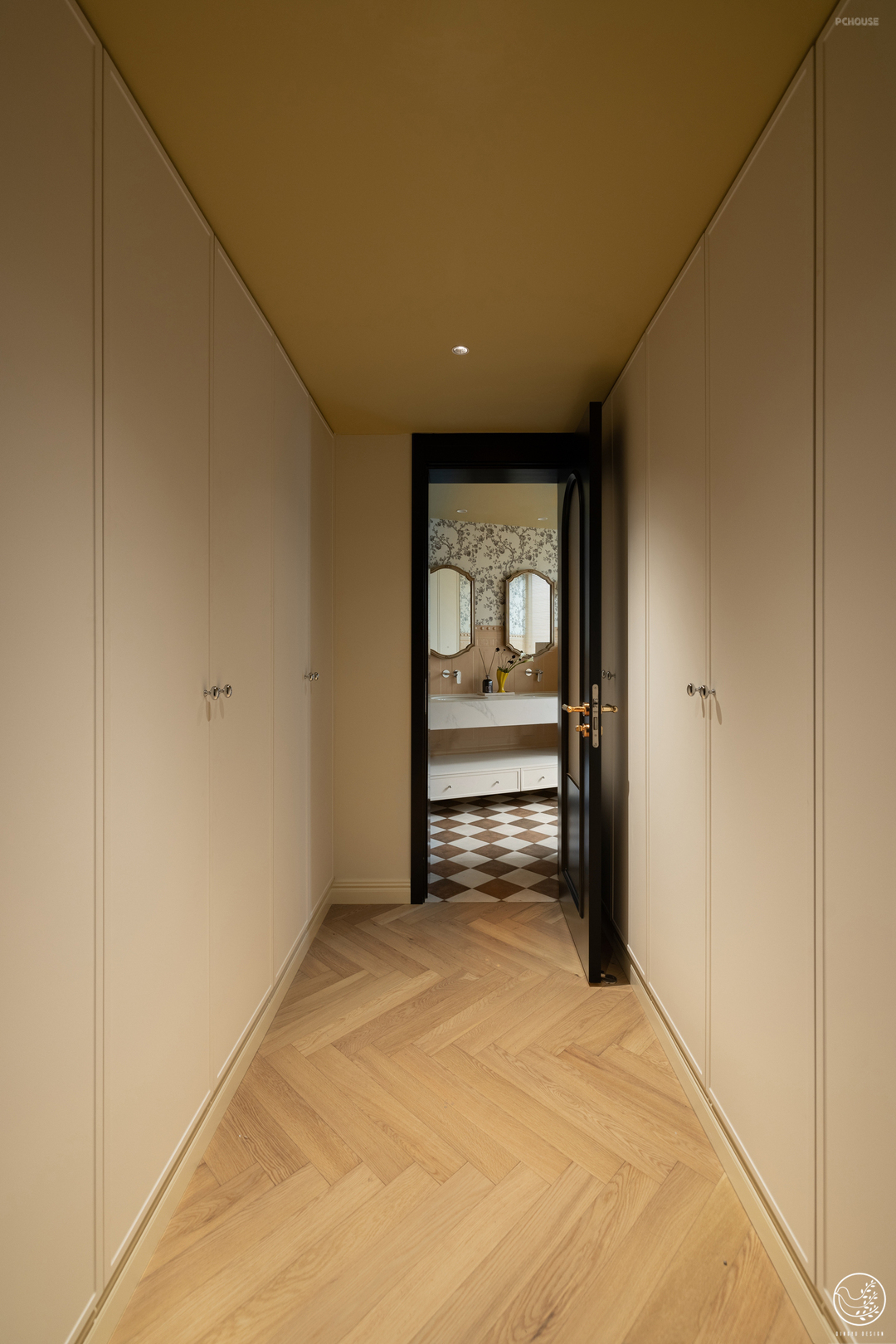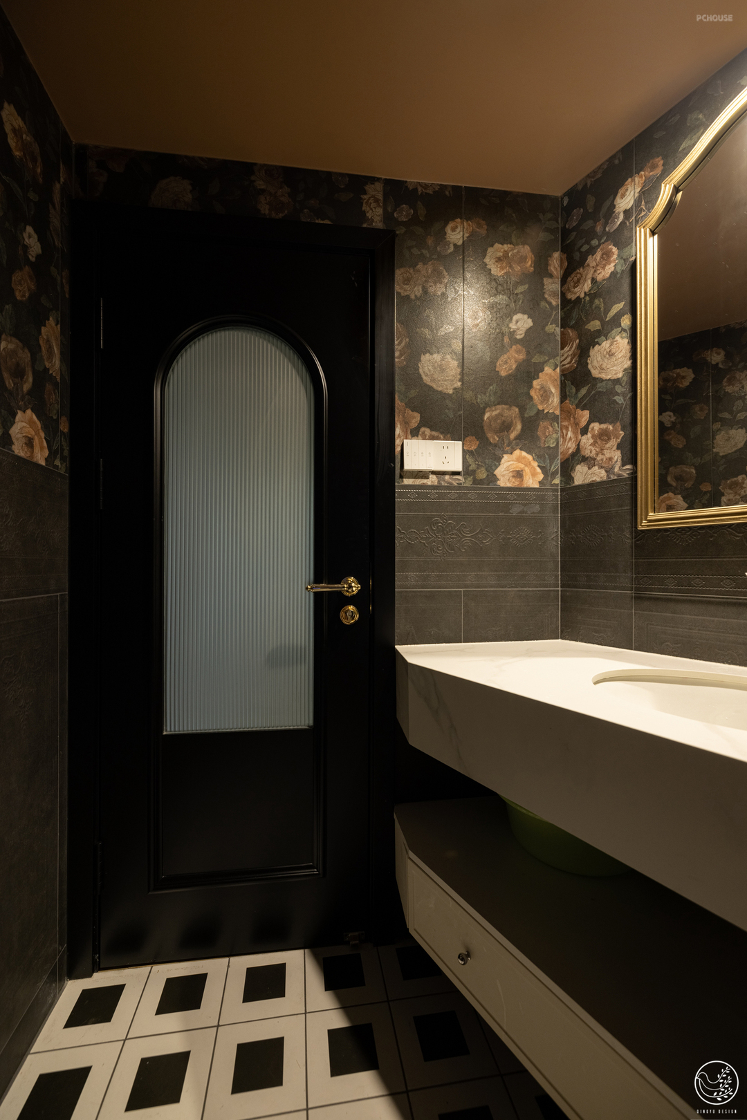 位于走廊尽头的次卫生间里,设计师采用了深色的花卉墙纸与黑色墙砖,呼应黑色的门套,也利用长长的走道,为TA们每一次通过创造出深邃、神秘、没有尽头的奇妙感受。