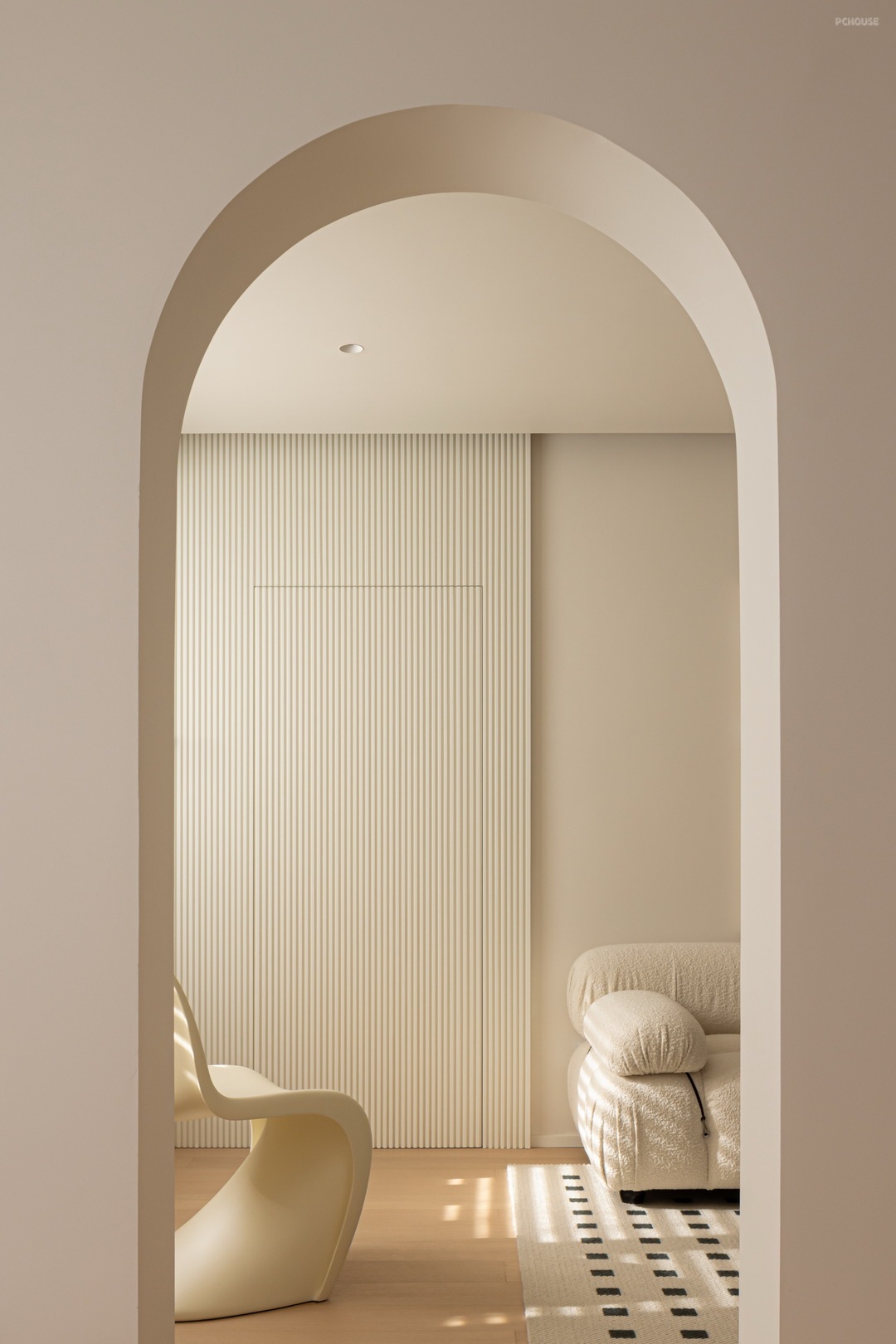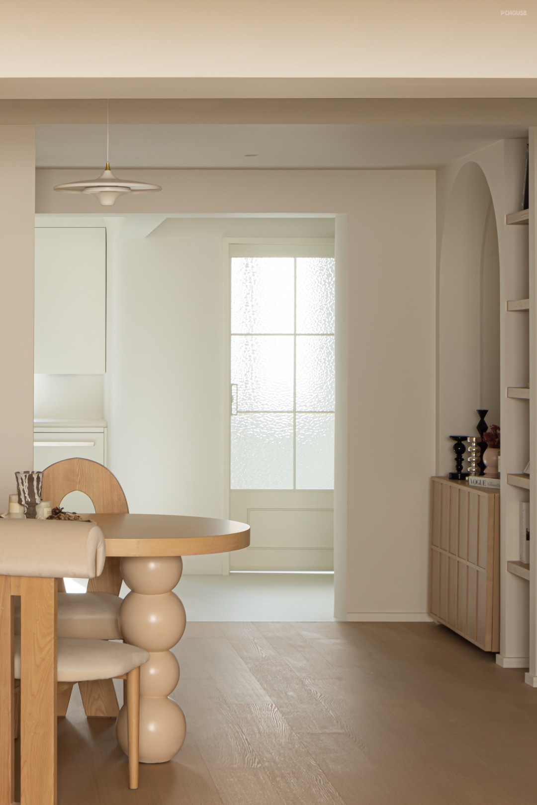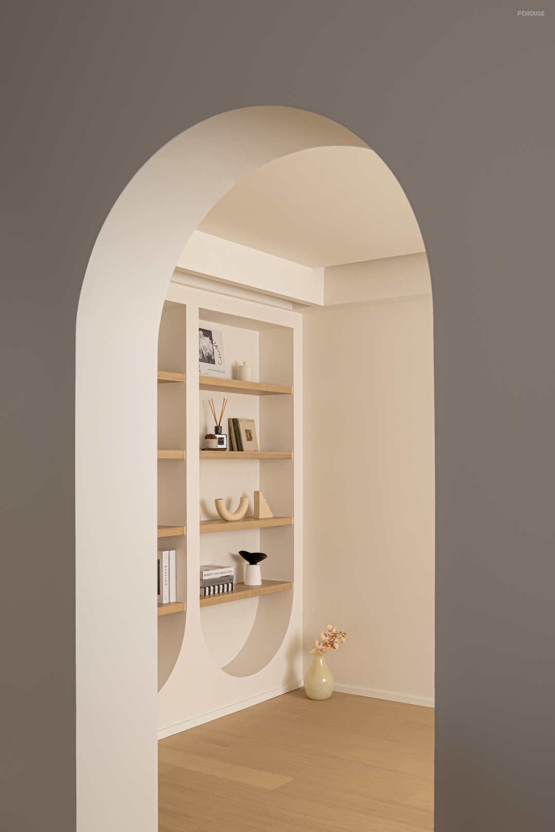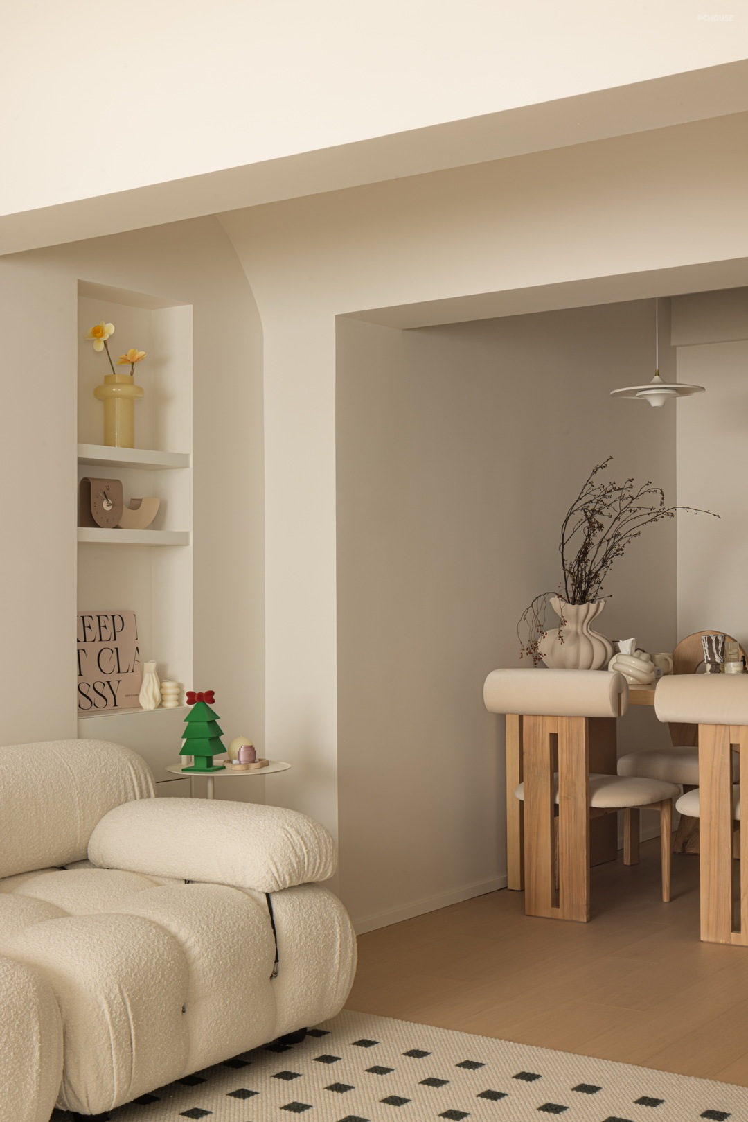 这套建面125㎡的住宅,户型为三室两厅一厨两卫。因原始结构多承重墙,在空间布局上我们根据屋主的使用需求进行合理规划,将居住体验感摆在第一位。运用米白色+木元素,给予空间温馨简约的基调,减轻2.6m层高带来的压抑感。圆润的拱形线条搭配上舒适的软装,以及客餐厨开阔的布局为整个空间带来自由闲适的感觉。