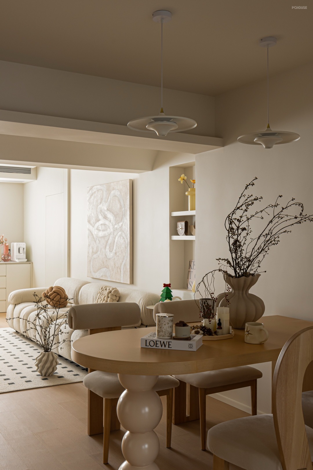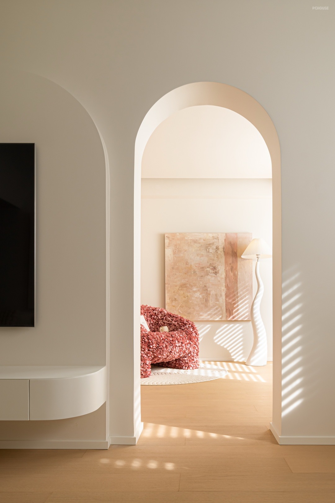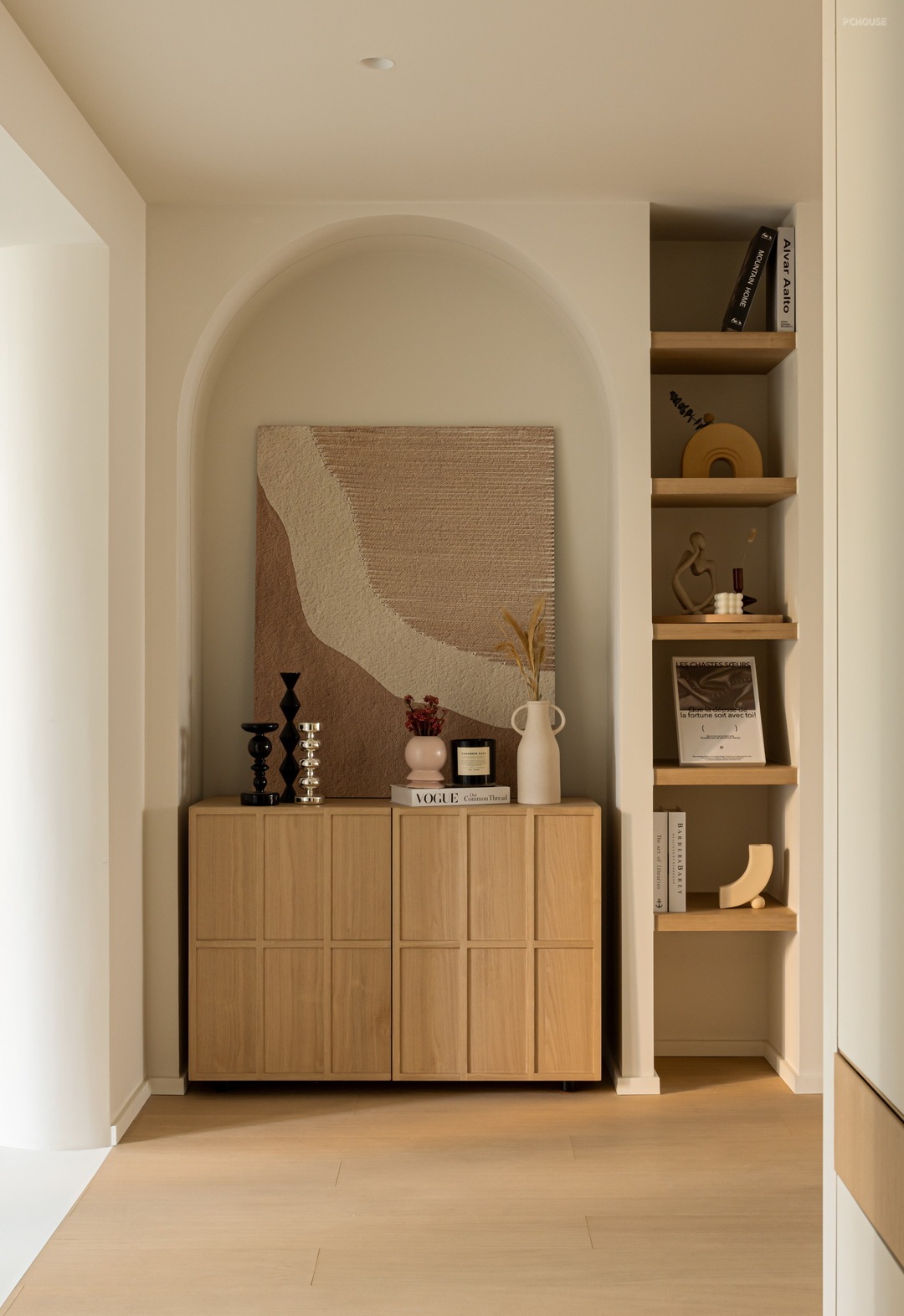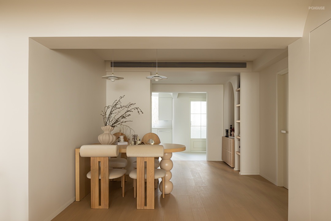 这套建面125㎡的住宅,户型为三室两厅一厨两卫。因原始结构多承重墙,在空间布局上我们根据屋主的使用需求进行合理规划,将居住体验感摆在第一位。运用米白色+木元素,给予空间温馨简约的基调,减轻2.6m层高带来的压抑感。圆润的拱形线条搭配上舒适的软装,以及客餐厨开阔的布局为整个空间带来自由闲适的感觉。