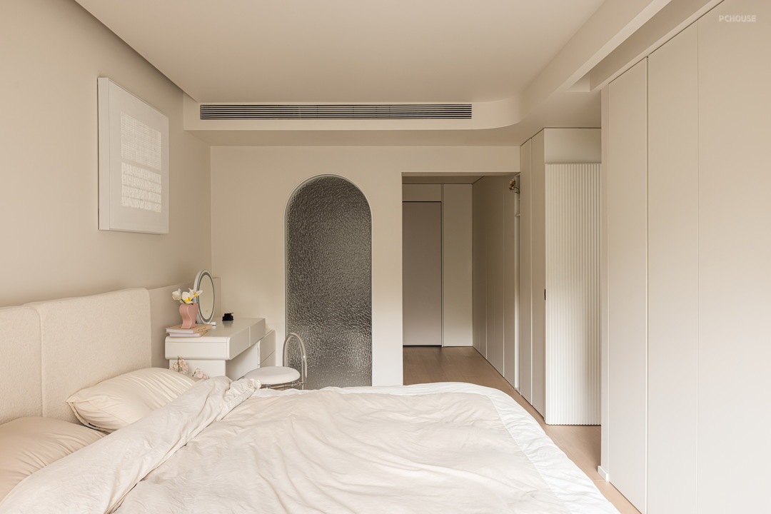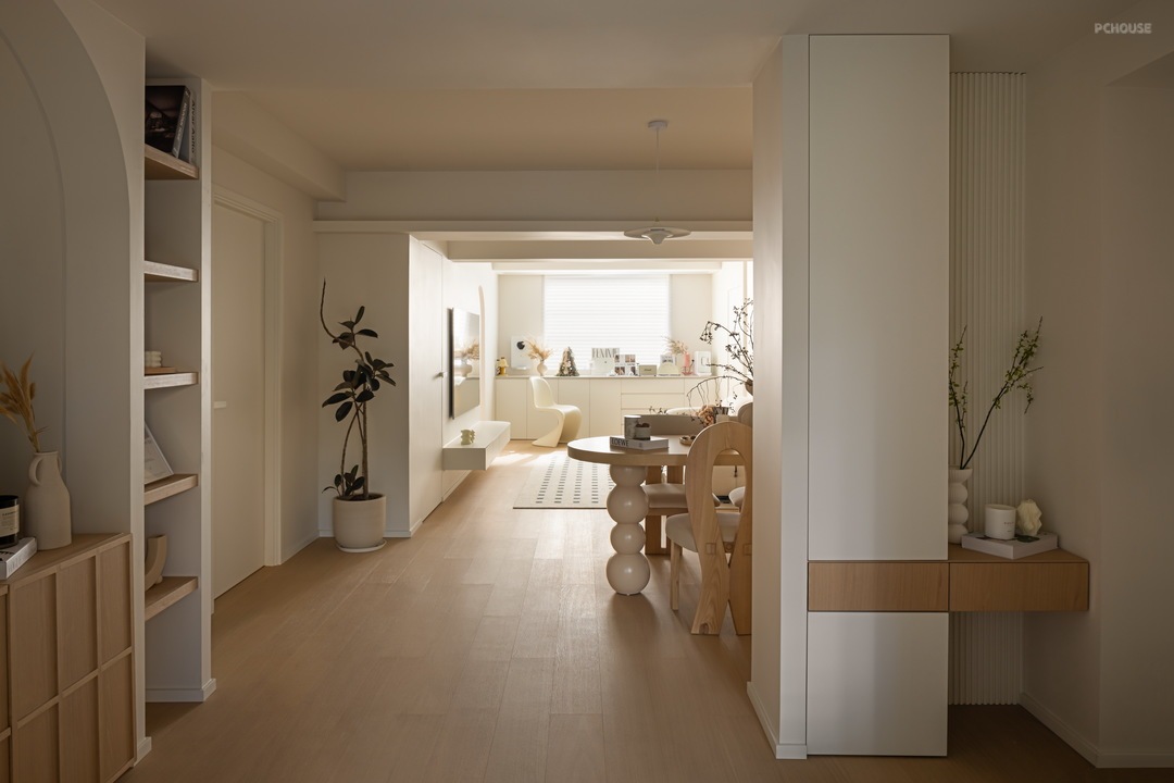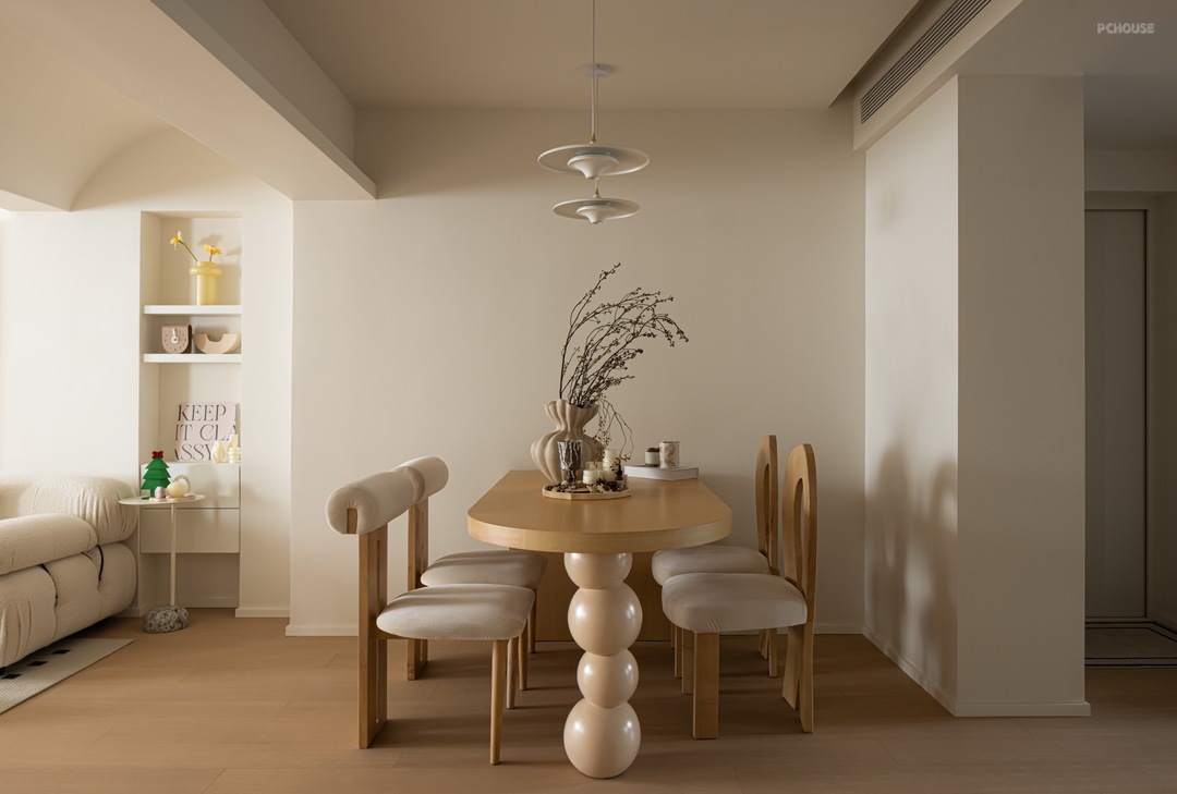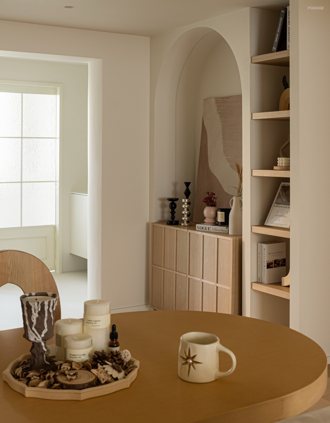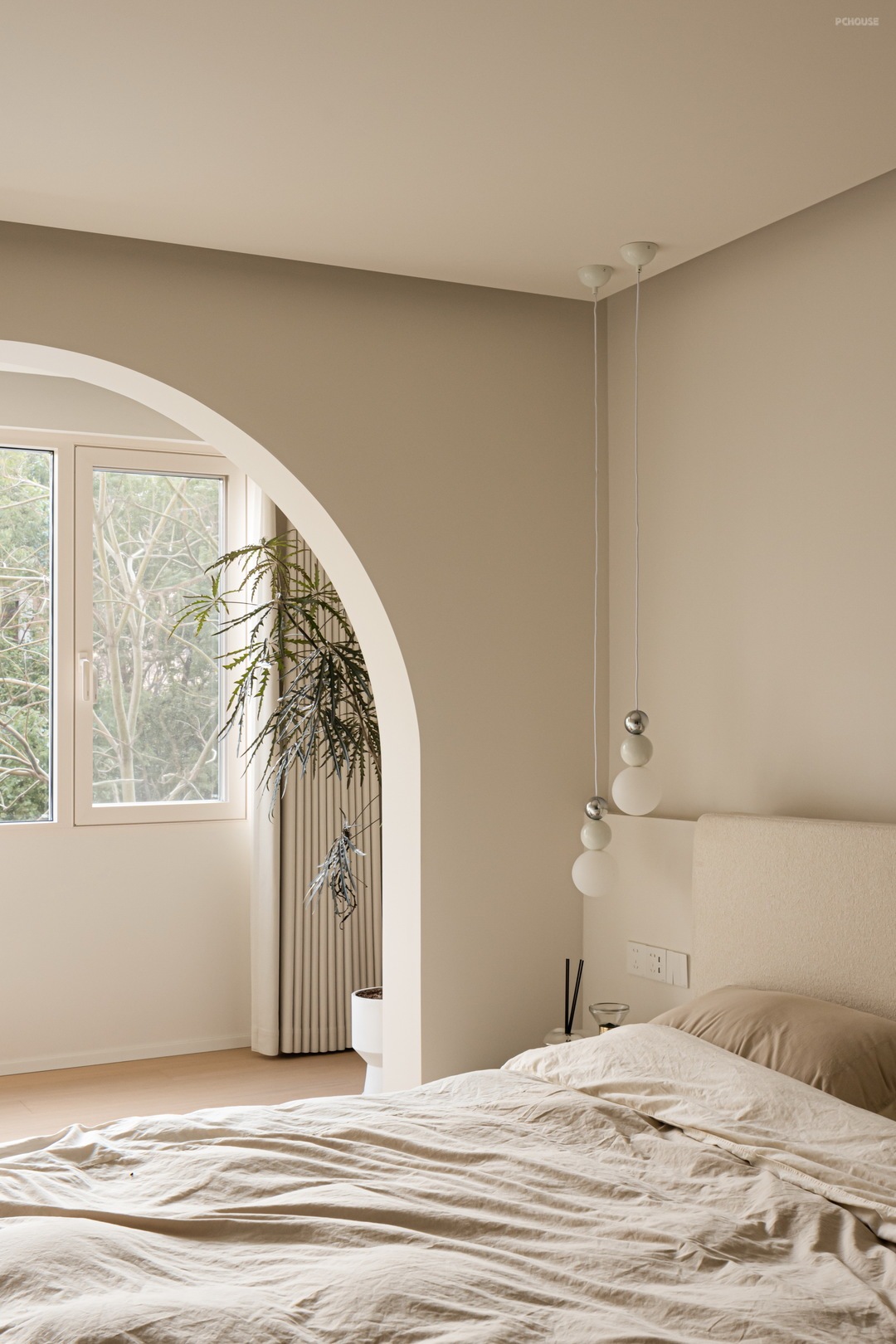 这套建面125㎡的住宅,户型为三室两厅一厨两卫。因原始结构多承重墙,在空间布局上我们根据屋主的使用需求进行合理规划,将居住体验感摆在第一位。运用米白色+木元素,给予空间温馨简约的基调,减轻2.6m层高带来的压抑感。圆润的拱形线条搭配上舒适的软装,以及客餐厨开阔的布局为整个空间带来自由闲适的感觉。