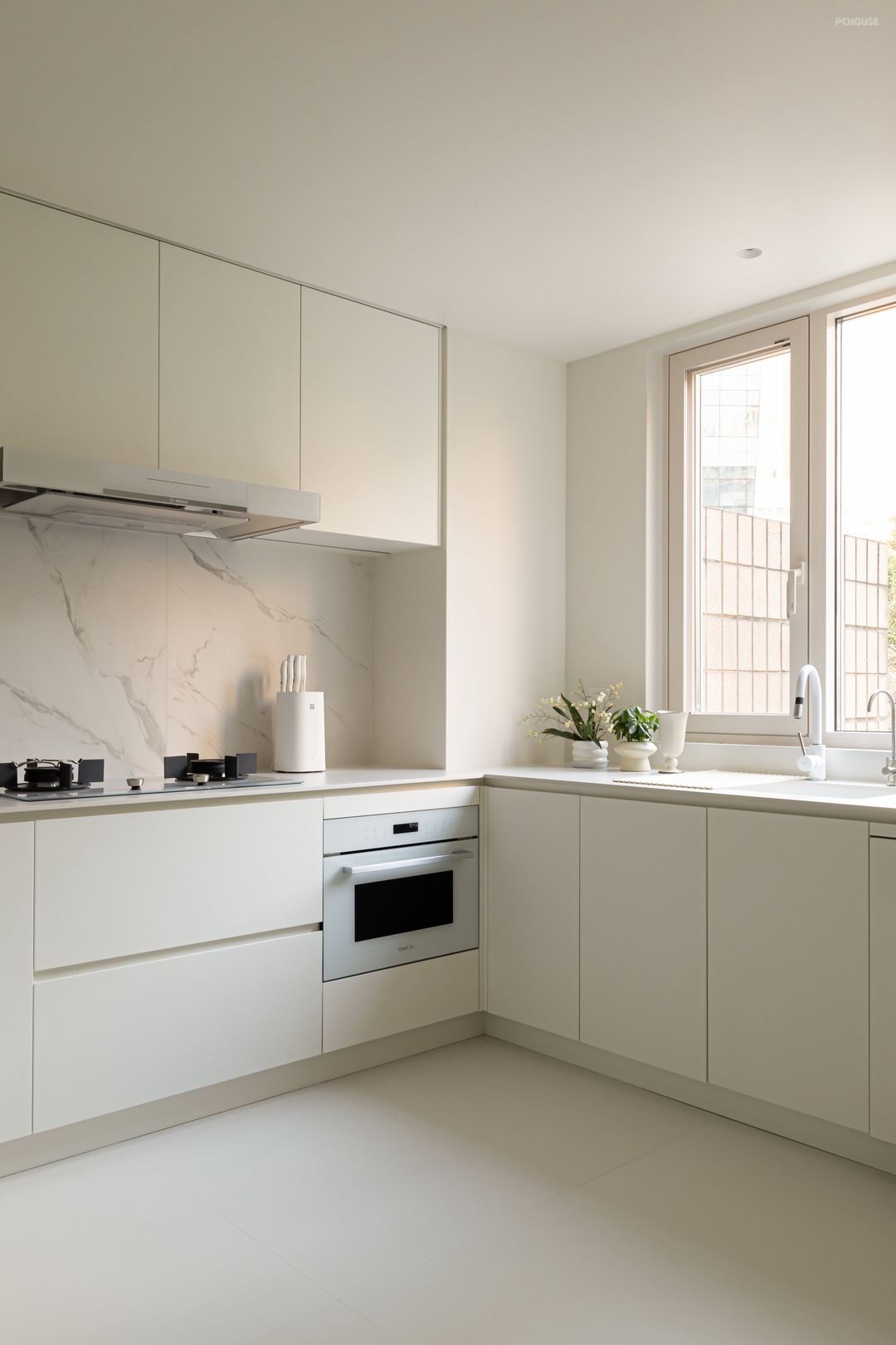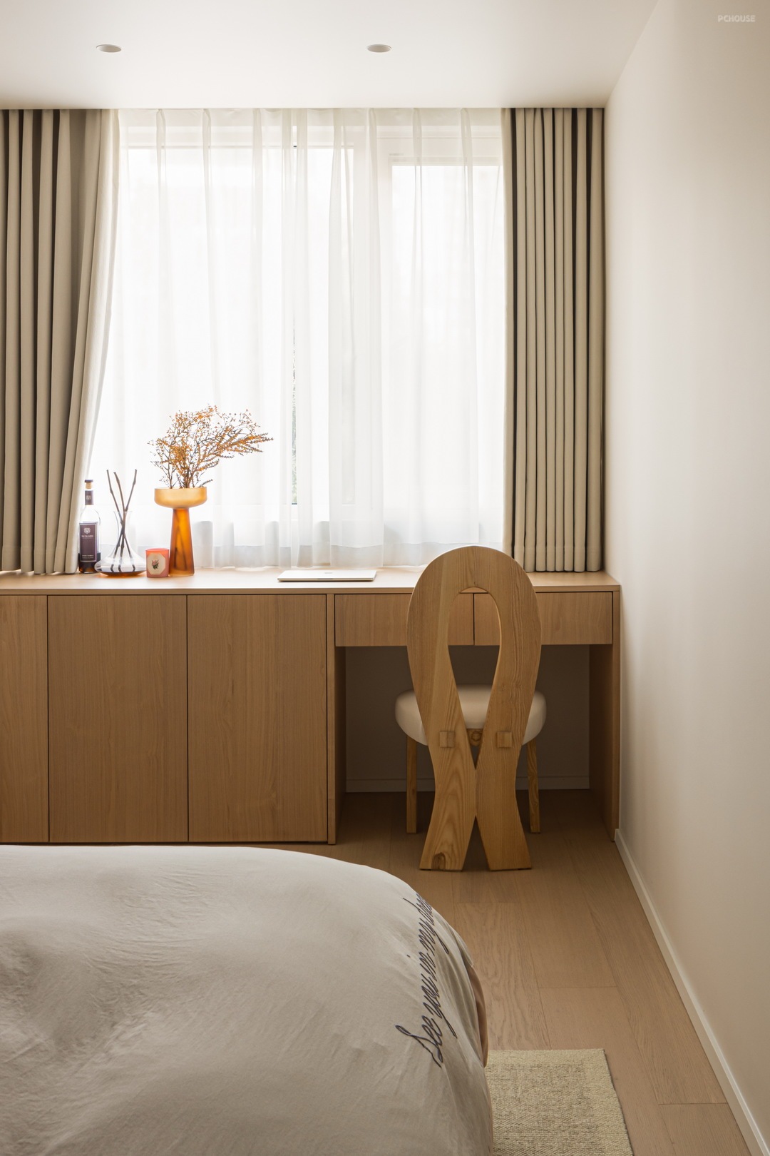 因原始结构多承重墙,所以在结构上改动较少,布局上我们做了优化,隔出一间采光好的区域做客卧,并将原本幽暗的厨房进行重新规划,结合全屋定制的家具,整体焕然一新,变得更好住也更好看: