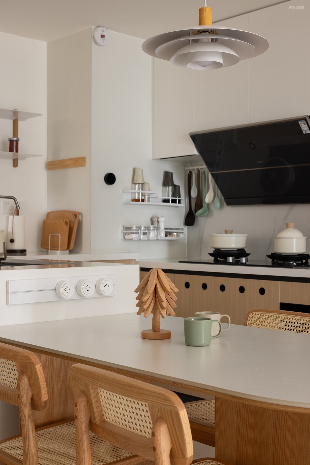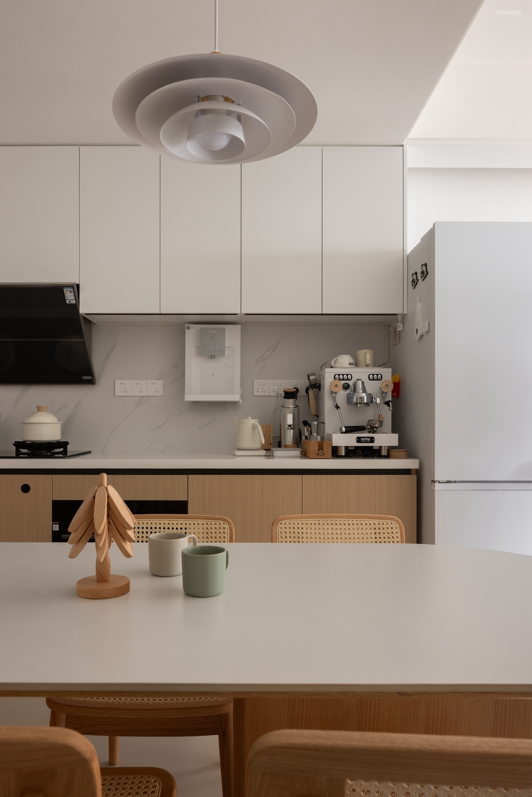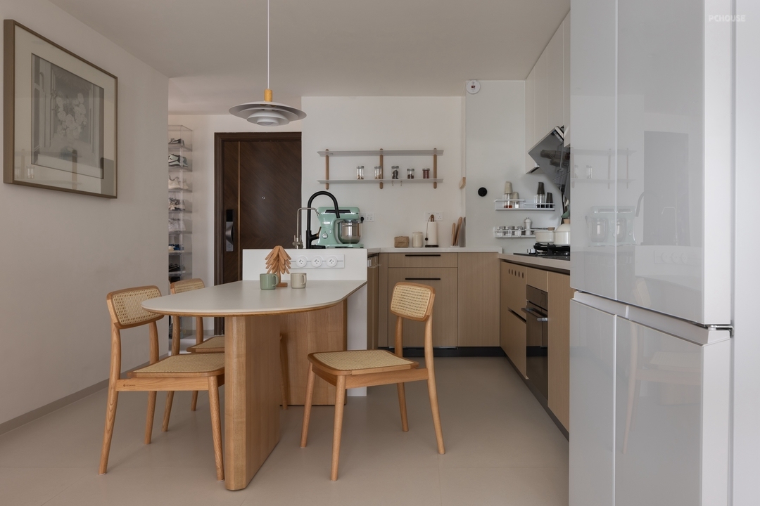做了开放式厨房的改动,整体为U形台面+长条餐桌,地柜木色、吊柜白色的搭配,让整个空间更加简洁。