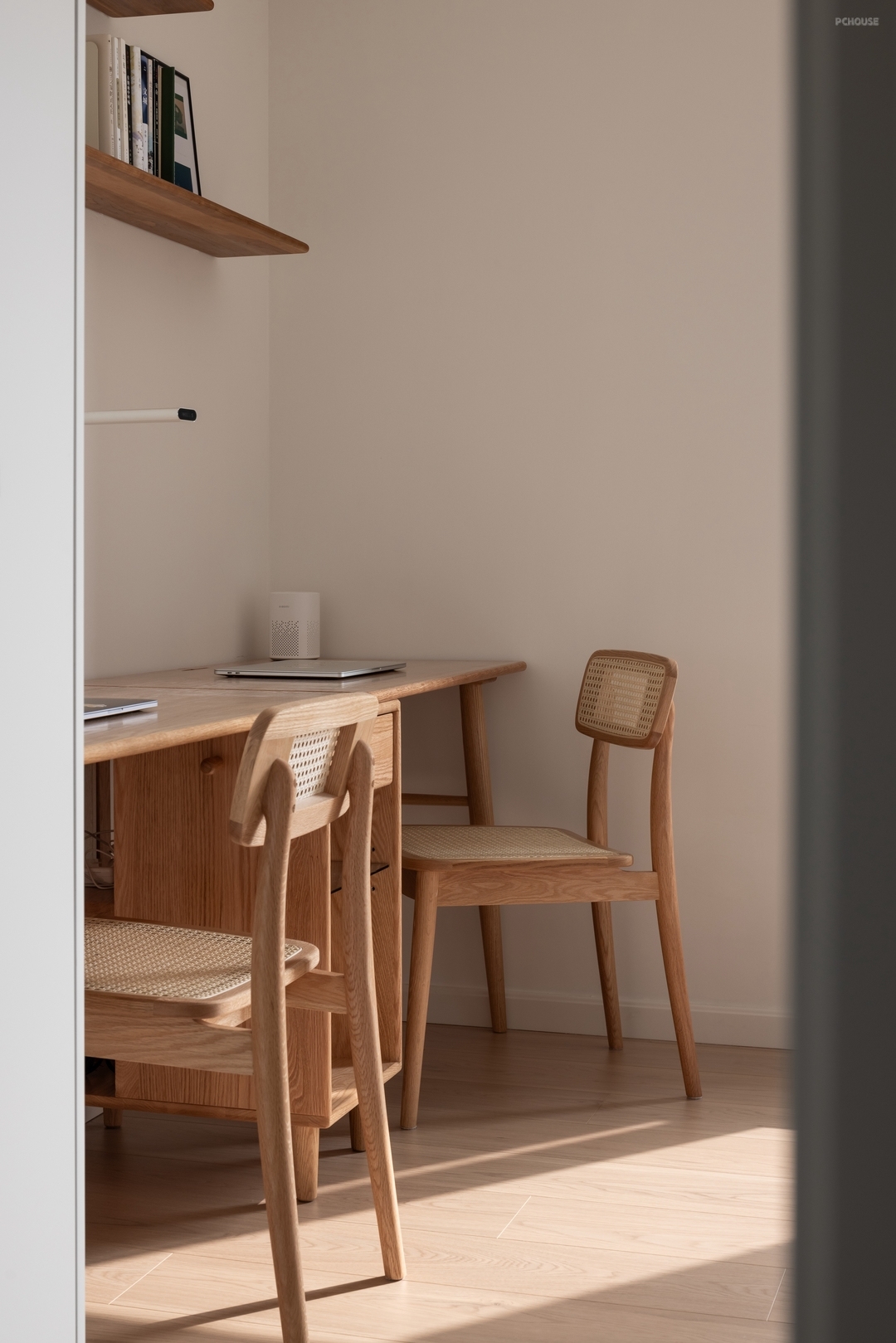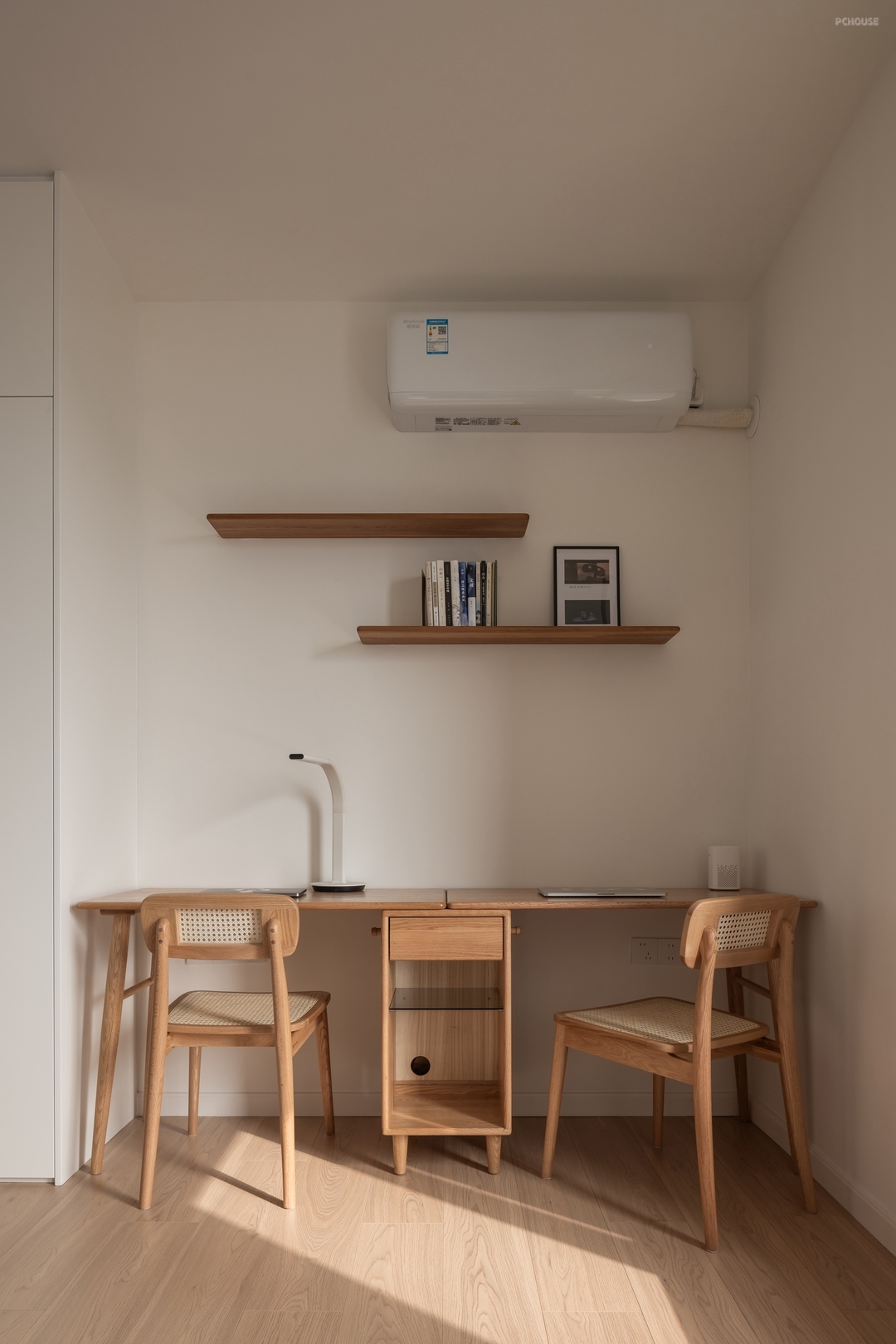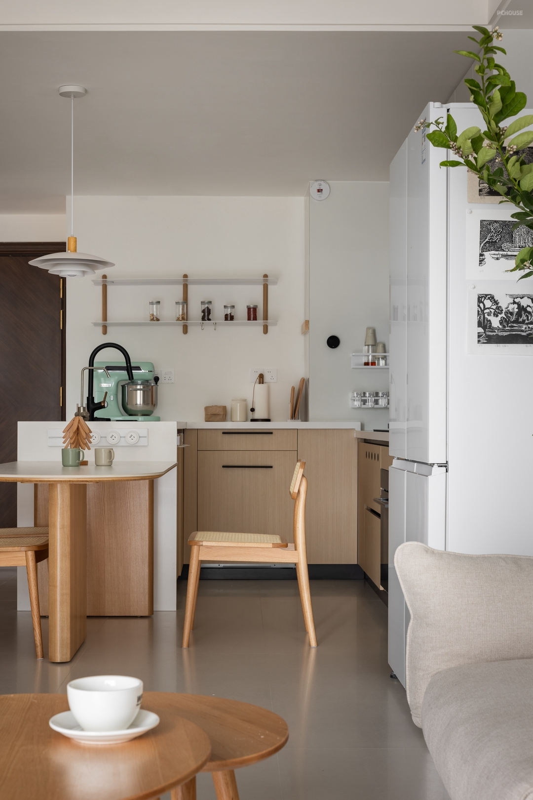 做了开放式厨房的改动,整体为U形台面+长条餐桌,地柜木色、吊柜白色的搭配,让整个空间更加简洁。