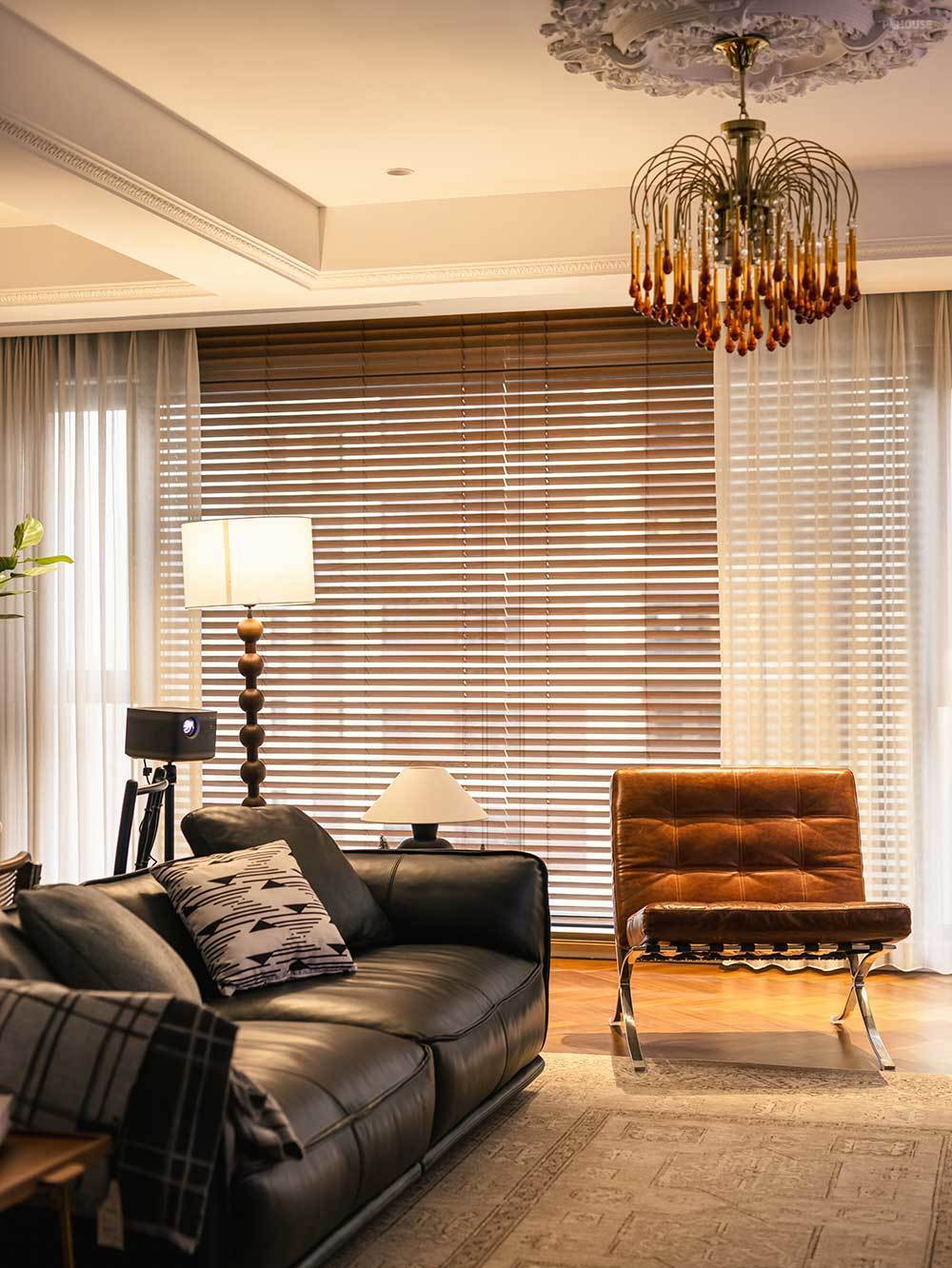 胡桃木色的地板以及相关家居软装的配合,为了避免整体视觉的突兀感,设计师在材质和空间细节这些地方,运用了一些经典的欧式复古元素。