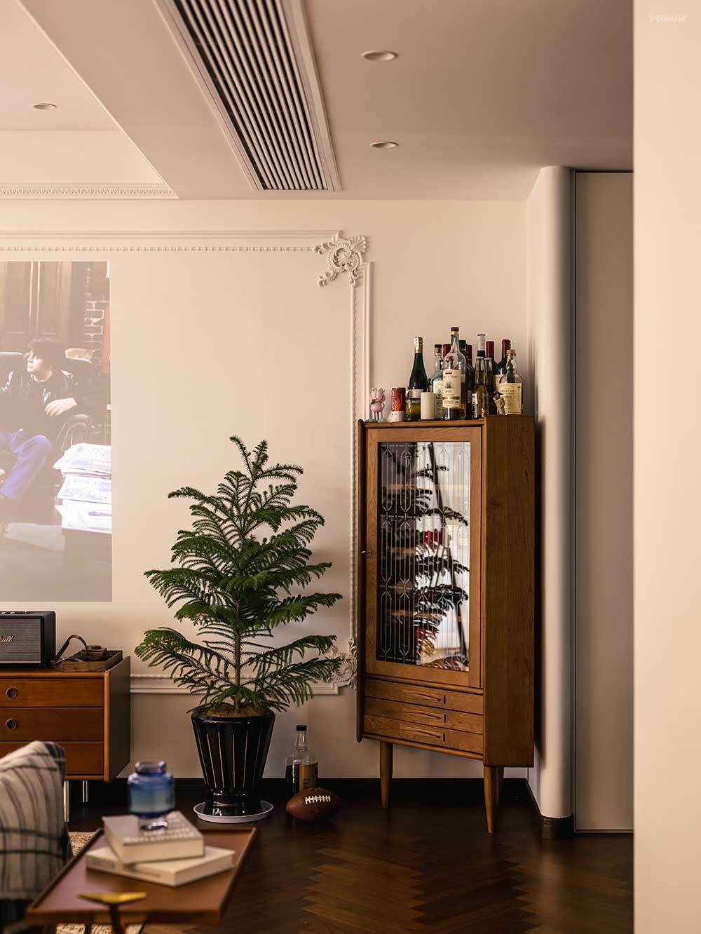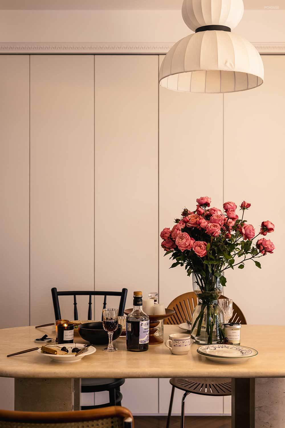 女业主本身从事的时尚相关行业,家里既要拥有生活的浪漫,也需要容纳生活的零碎,所以在客餐厅中,设计了大量的收纳柜,让整个空间既能够保持舒适的状态,也能拥有大量的功能容量。