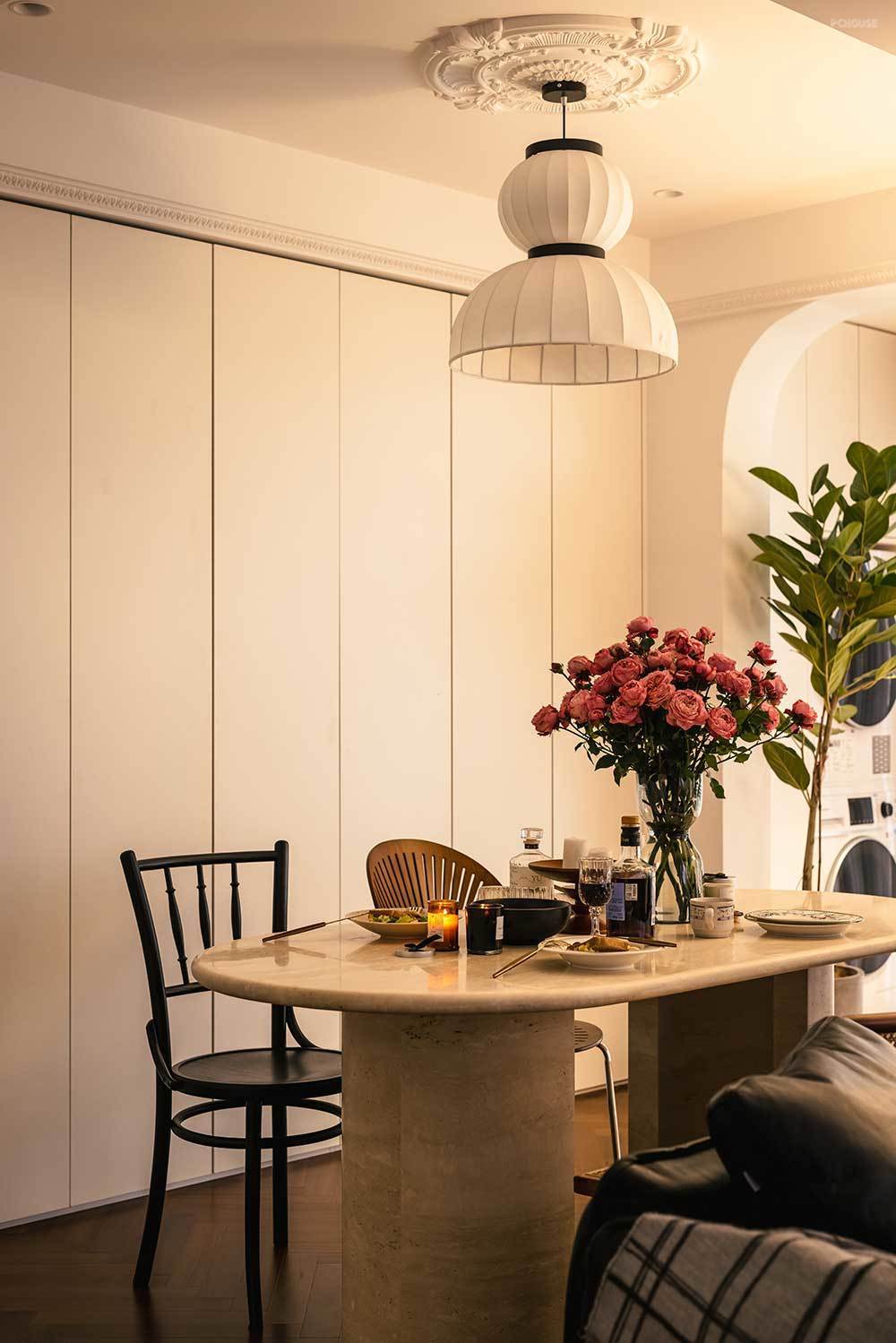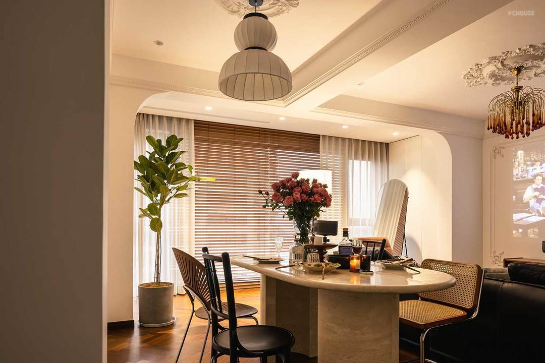 餐桌选用了圆弧的长形餐桌,一方面跟本身的格局比较匹配,另一方面有机线条的出现,给整个空间处处增加了浪漫的生活气息。