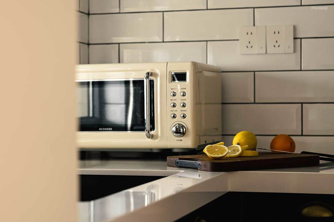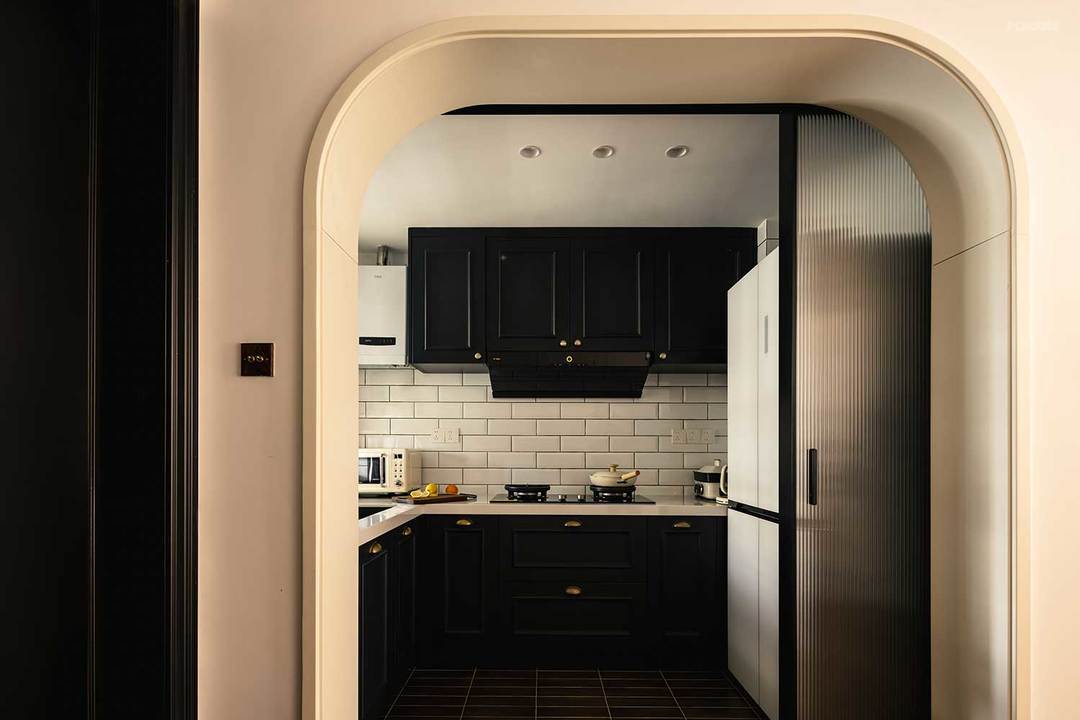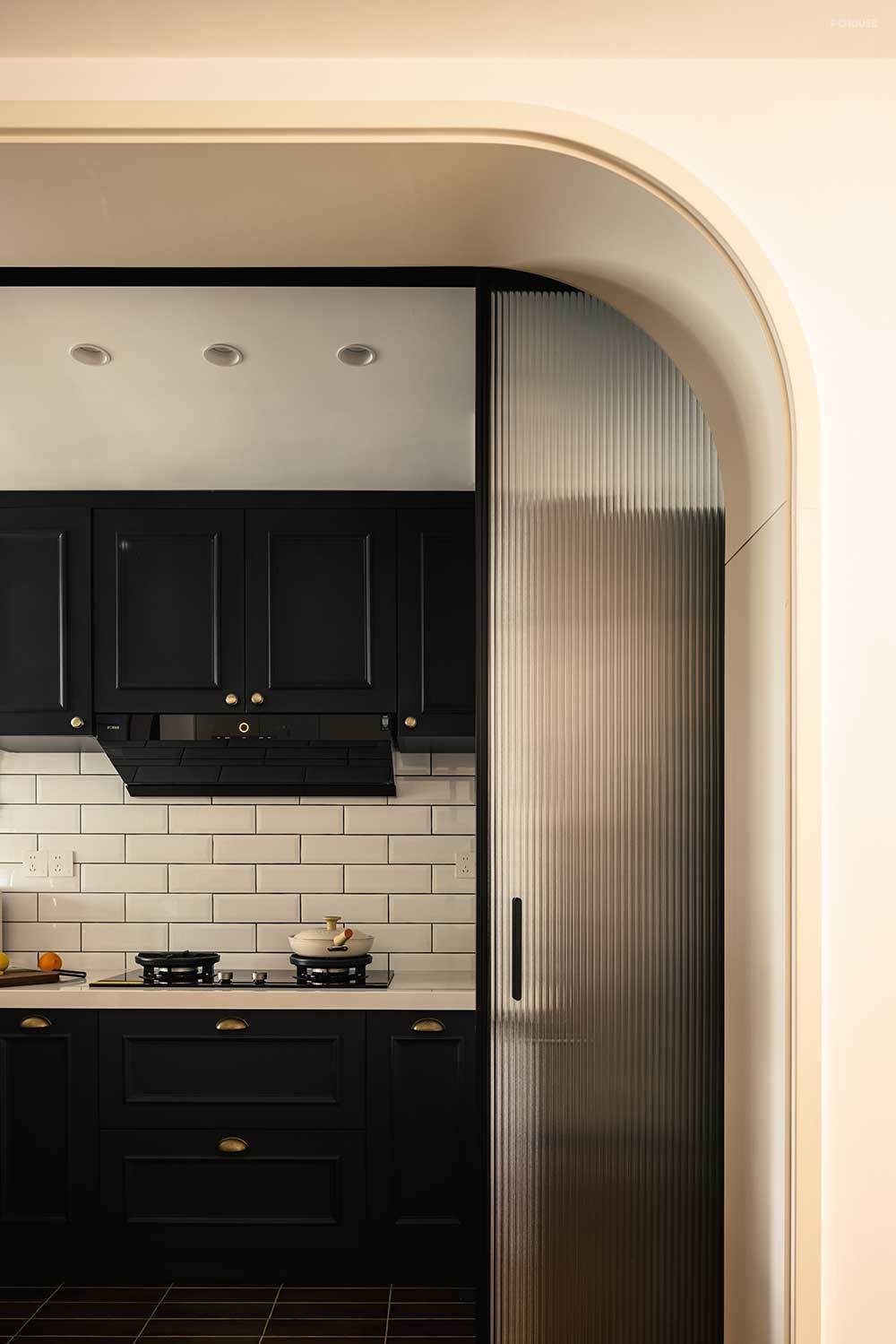 不同于客厅的色彩,厨房运用了黑色冷色调,小白砖上墙,能与深色形成对比的颜色;黑色橱柜和白色墙面的过渡,给人感觉更轻盈、更平衡的生活质感。