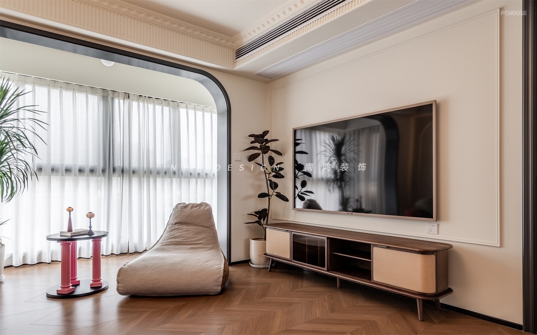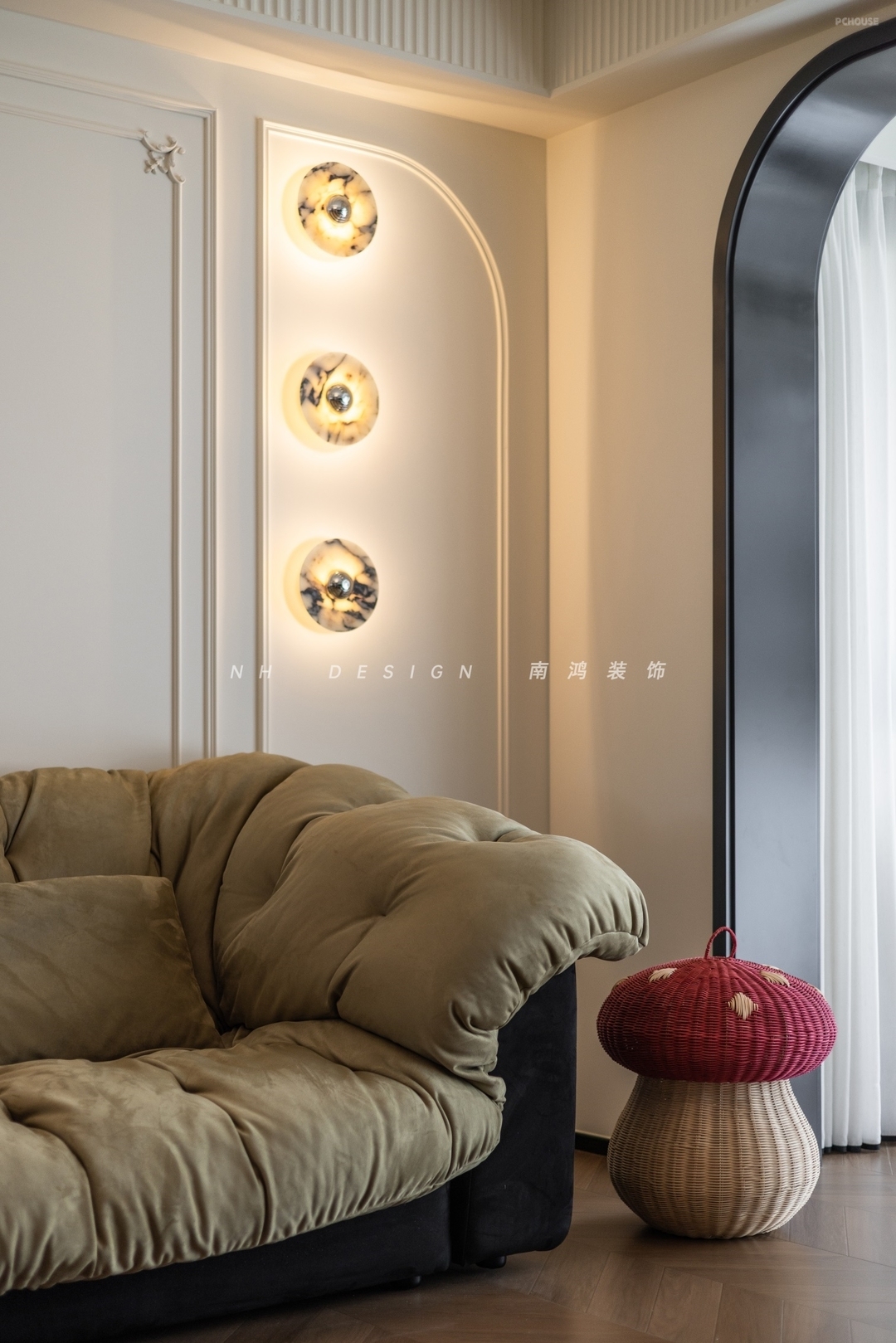 宽厚包靠的山茶花沙发,带来慵懒悠闲的况味,沙发后方继续以线条雕琢造型,搭配壁灯和装饰画,打造优美端景。阳台置入懒人沙发与小茶几,作为日常休闲区使用。