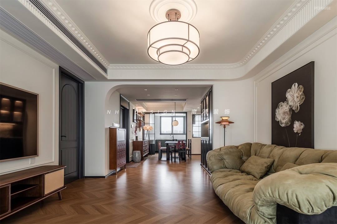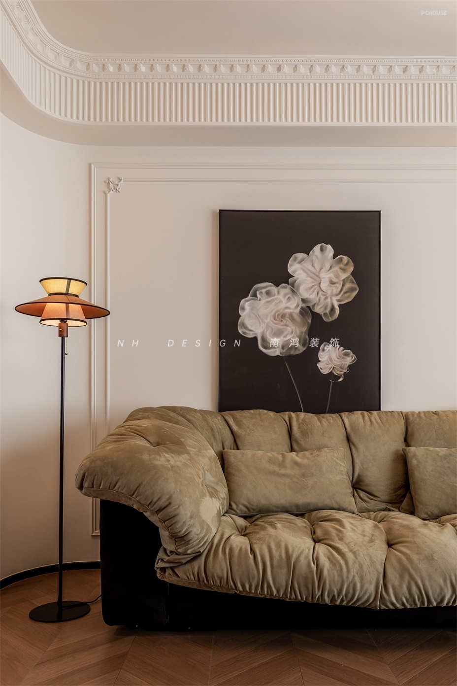 公区于地面通铺鱼骨木纹砖,制造延伸感,空间变得通透大气。顶面勾勒精细的石膏线条,烘托典雅法式韵味,再结合空间的软装进一步诠释法式的优雅和浪漫。