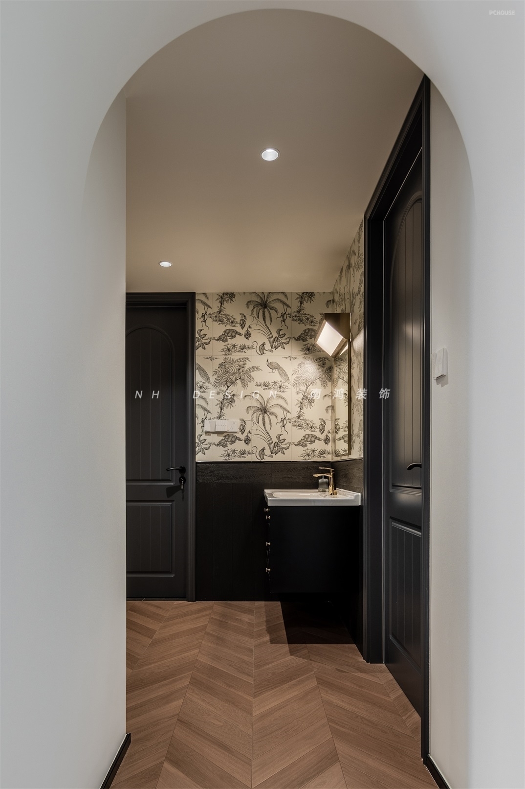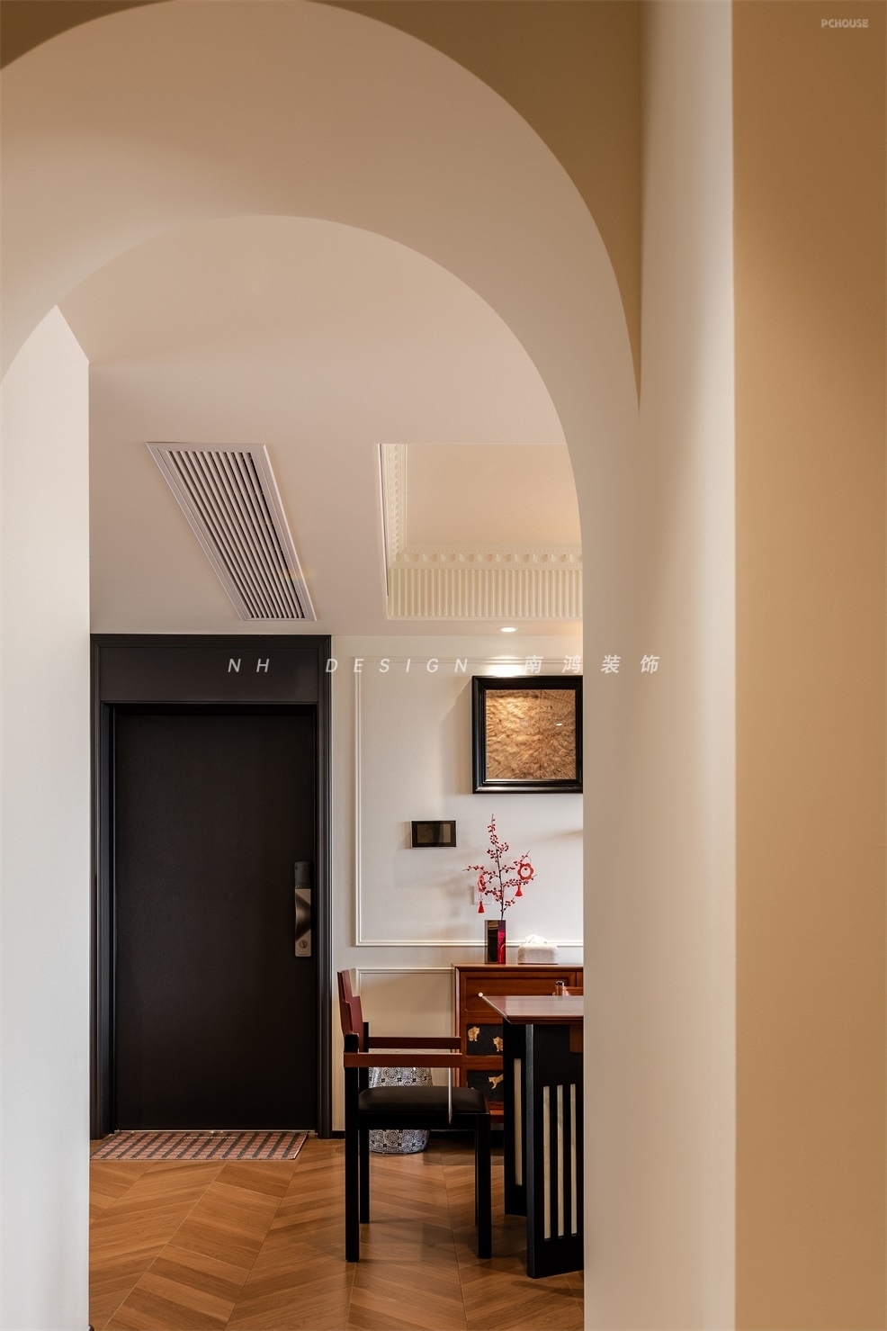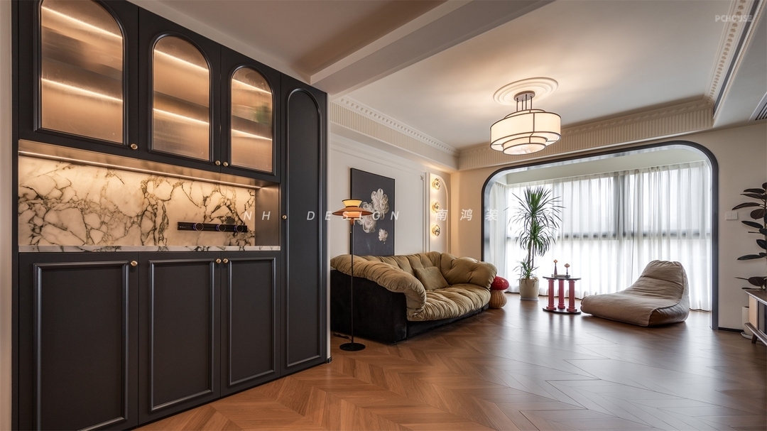 通道处以深色储物柜的形式解决收纳之需,柜体融入玻璃材质与圆拱造型,搭配岩板背景和柔暖灯源,温馨生活感就此打开。