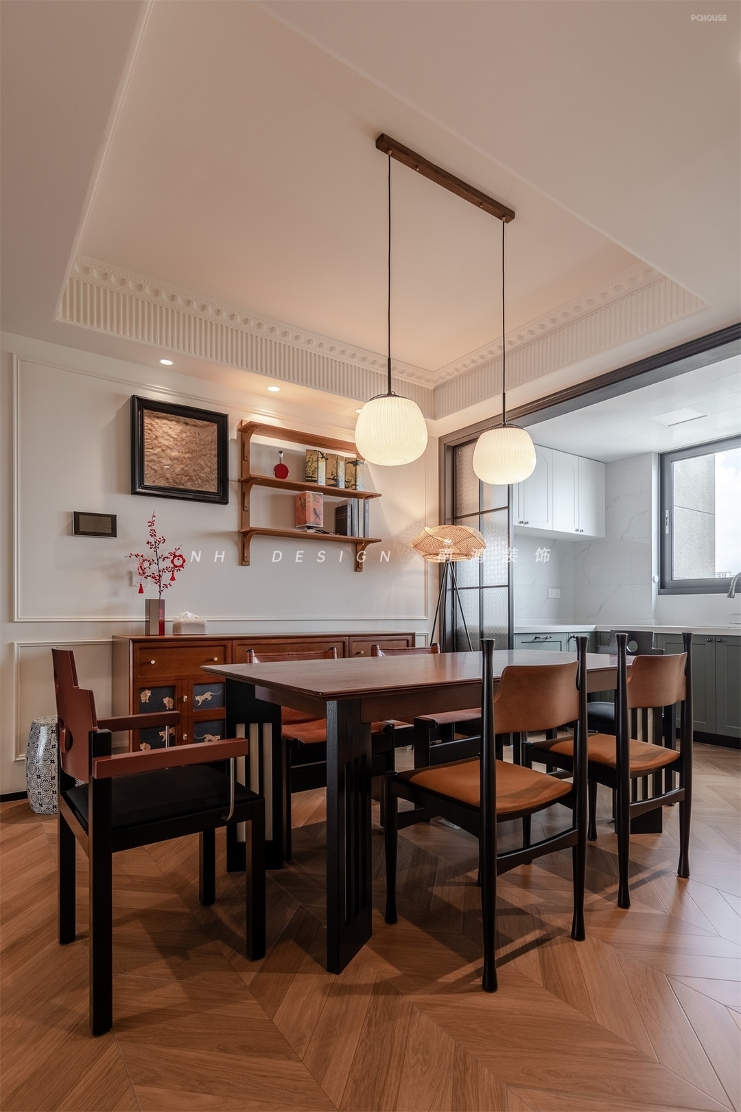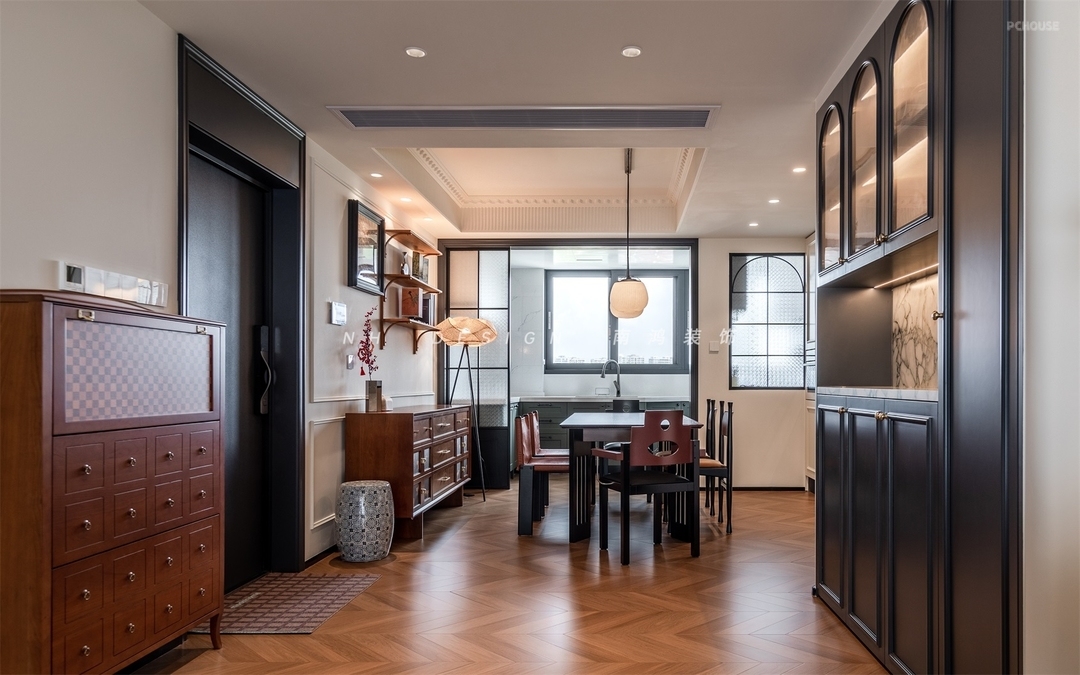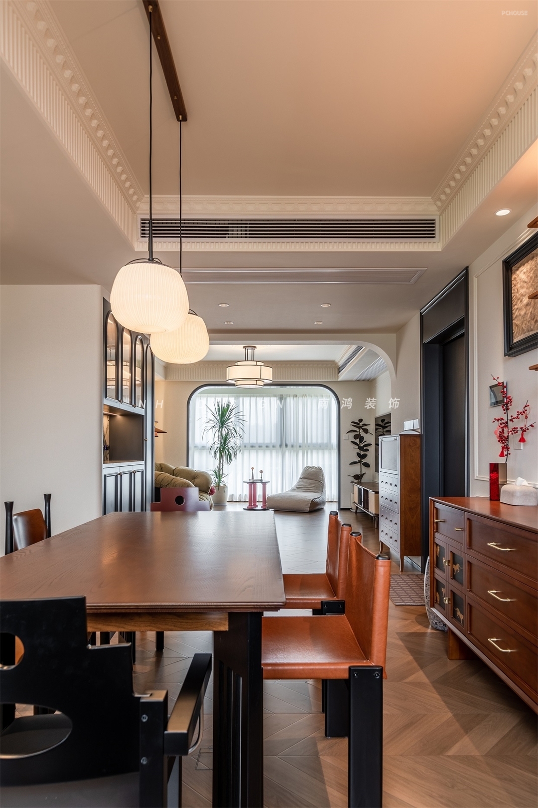餐厅选配线条干练的中古风家具居多,质朴沉稳的色调久经岁月考验,焕发别样的光彩活力。局部利用点光源调和氛围,多样化软配彰显丰富层次。