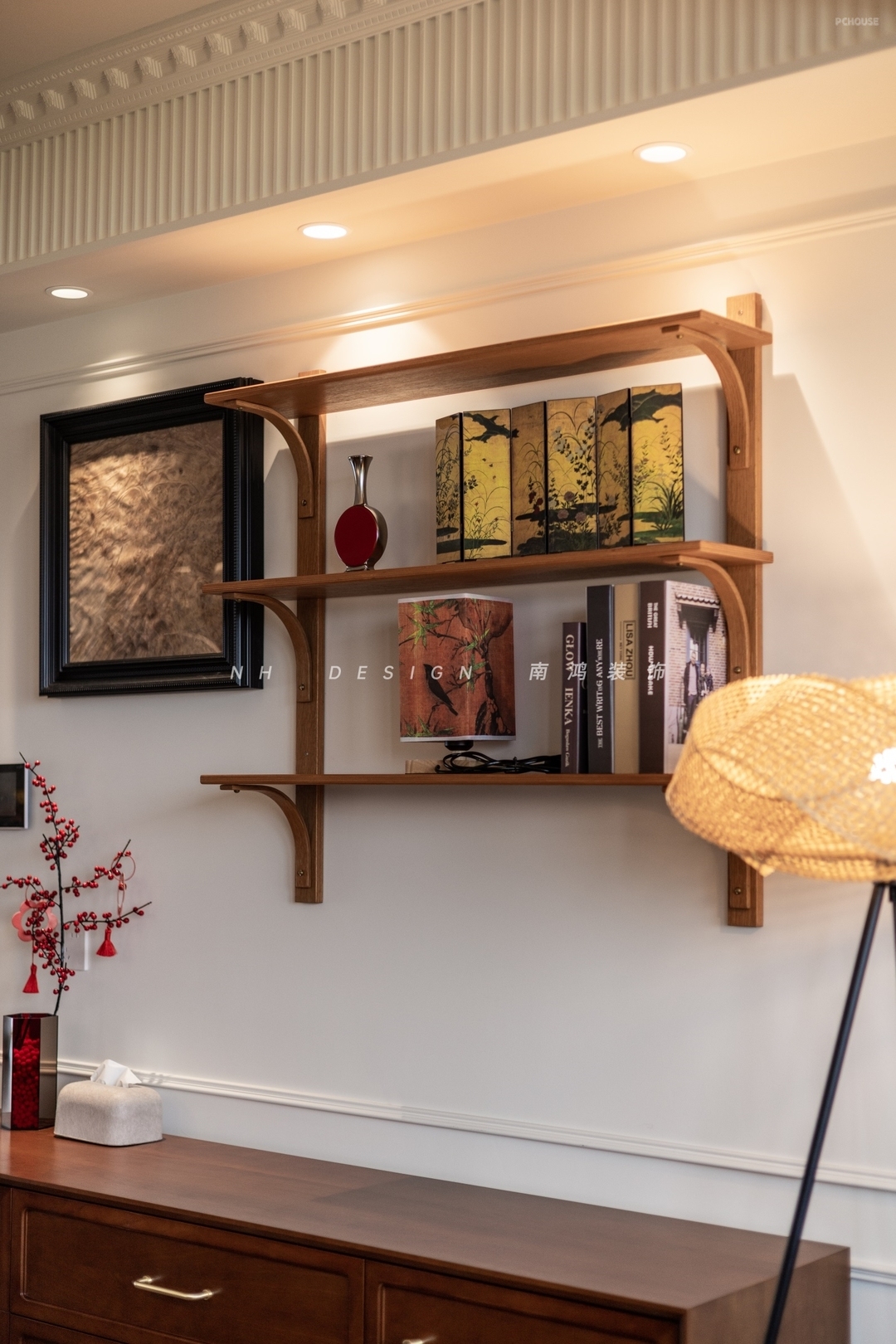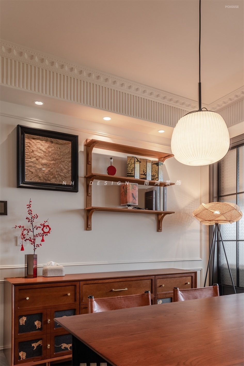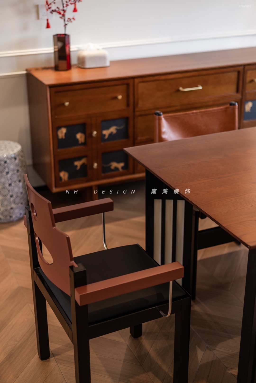 餐厅选配线条干练的中古风家具居多,质朴沉稳的色调久经岁月考验,焕发别样的光彩活力。局部利用点光源调和氛围,多样化软配彰显丰富层次。